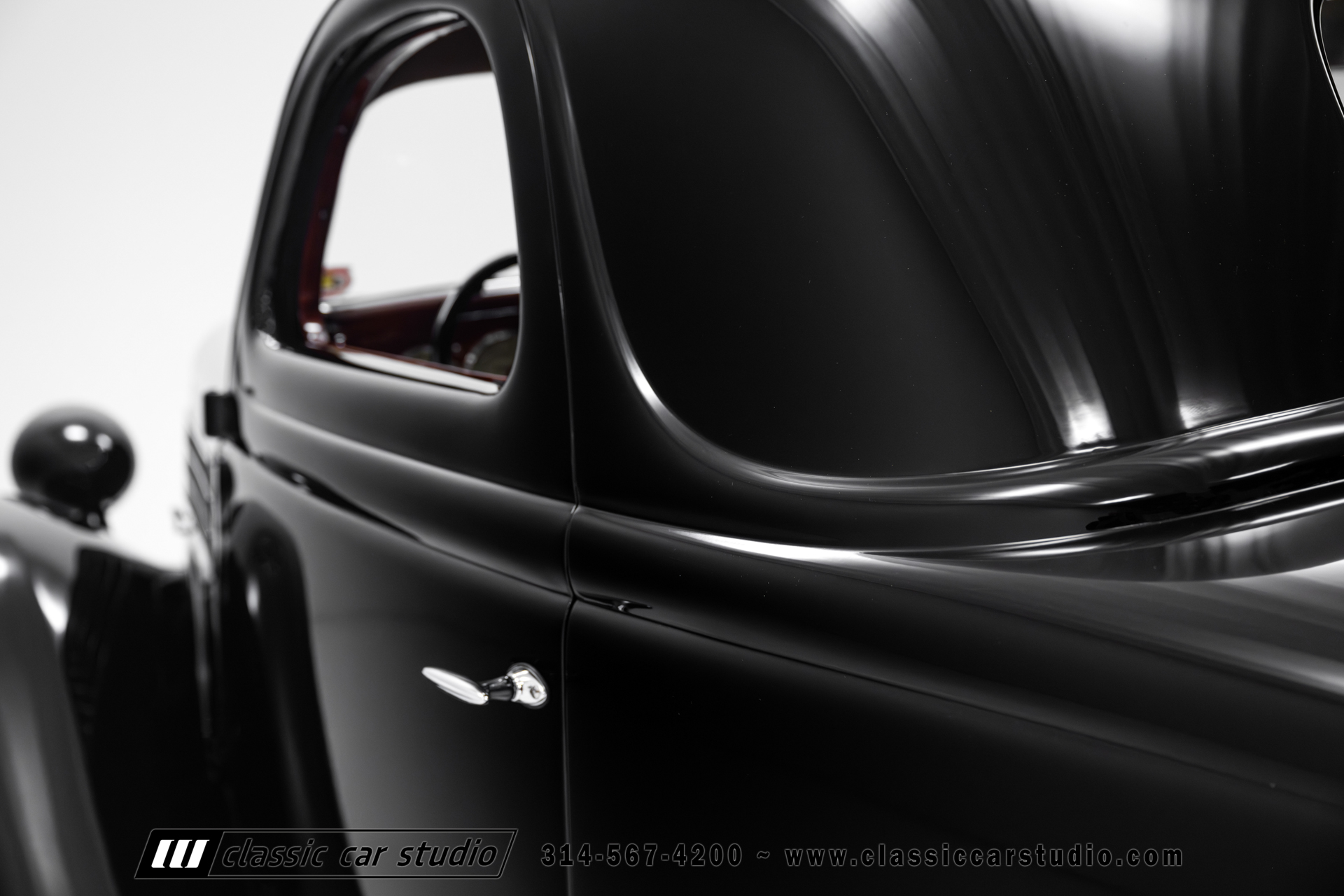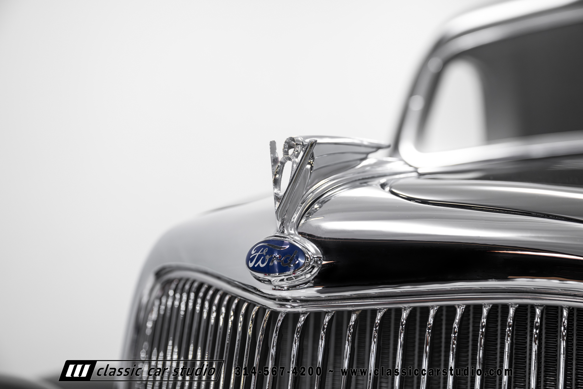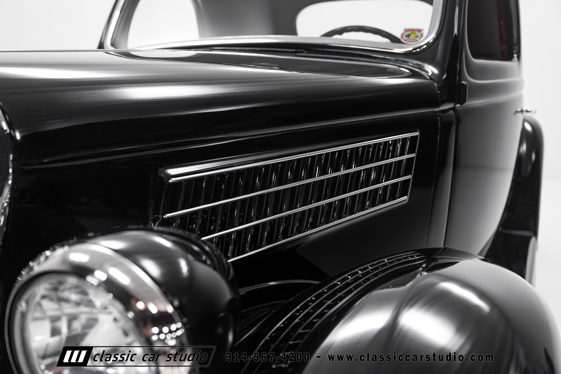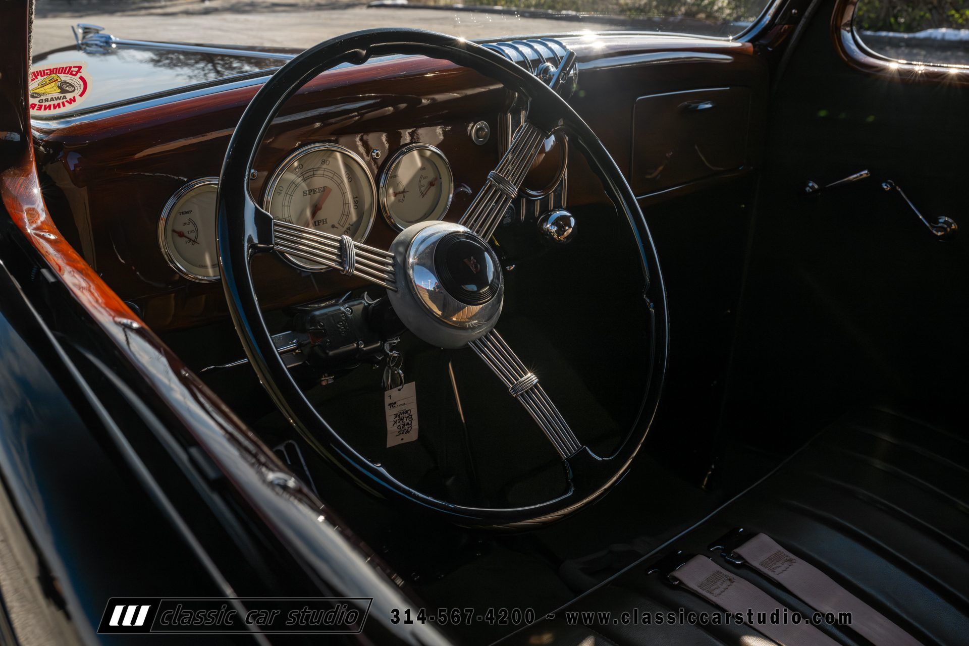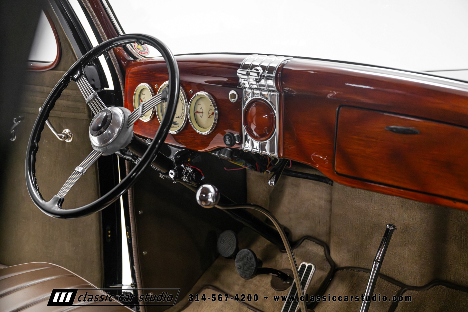 In 2017, the restoration was completed by Rezurected Rod and Kustom in Wayne, NE. This all steel car with original fenders that was stripped down to bare metal and the project began! All new body work was laid out as well as a slick black paint job. The grill, bumpers and windshield surround received all new chrome and the factory wire wheels were refinished in yellow with chrome “V8” caps.
