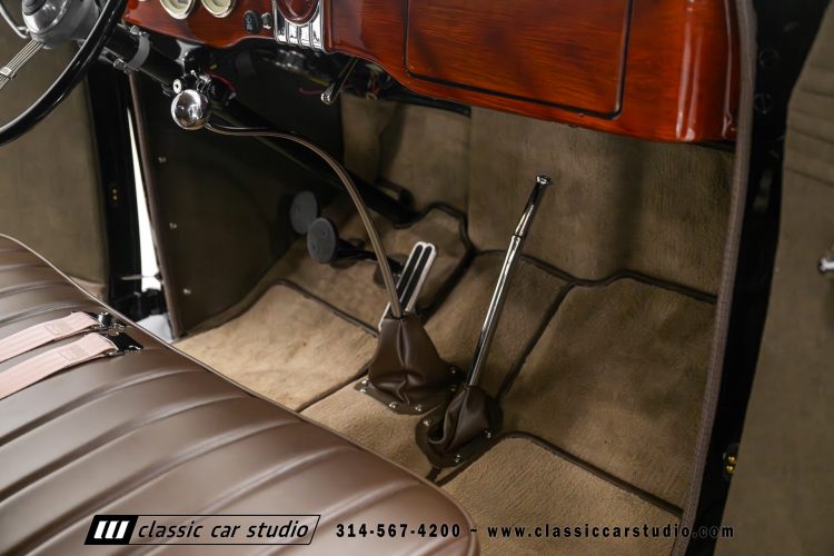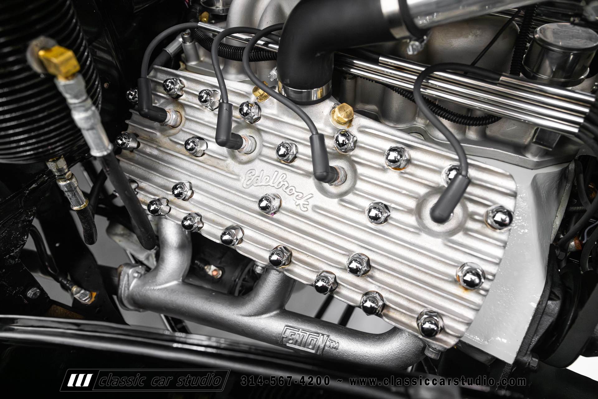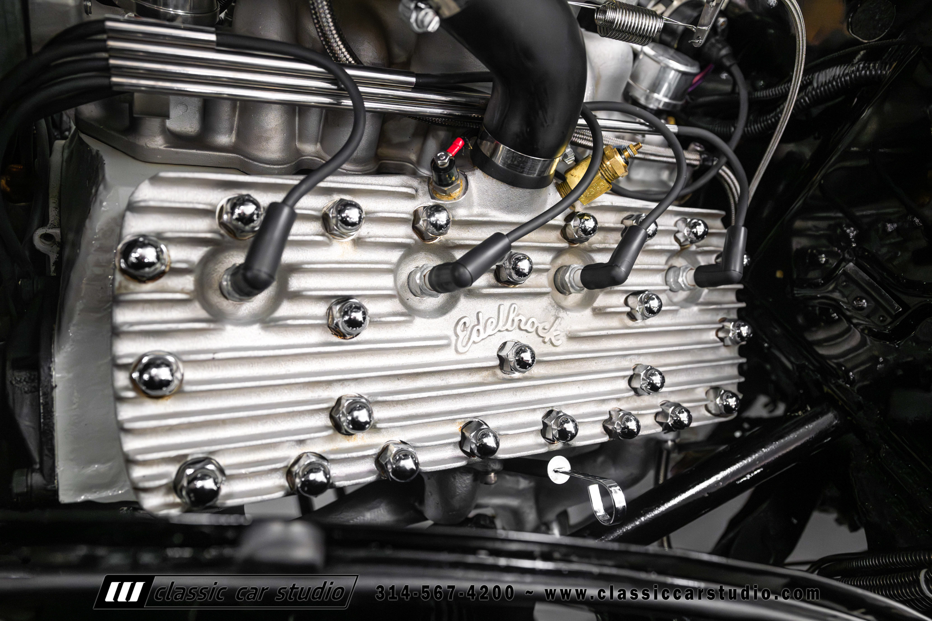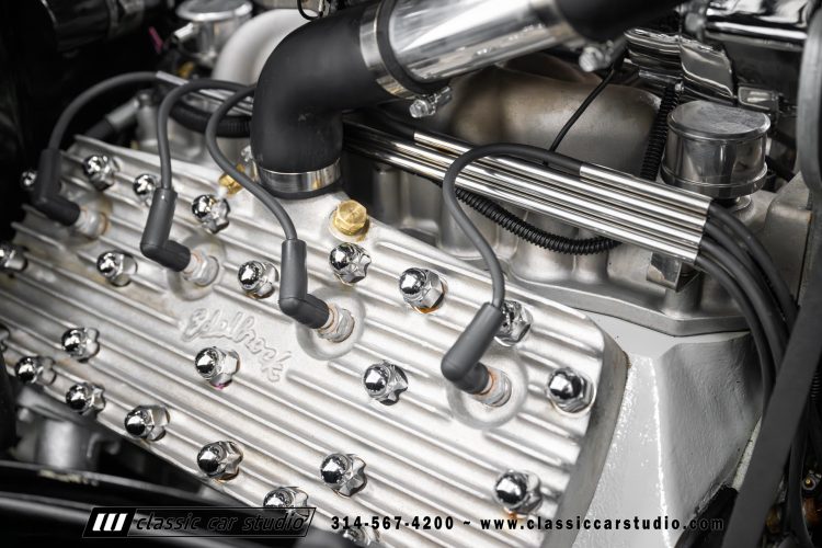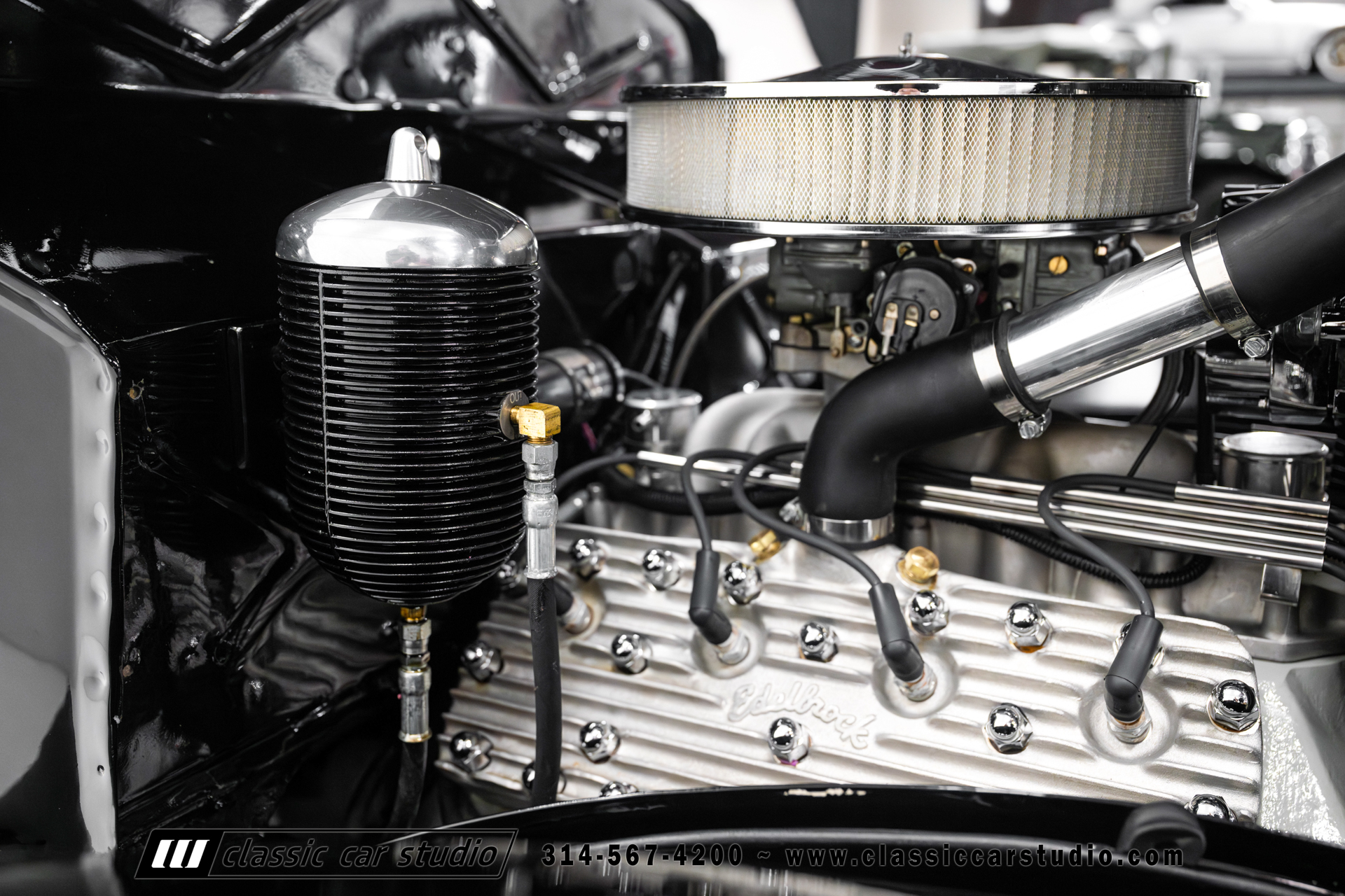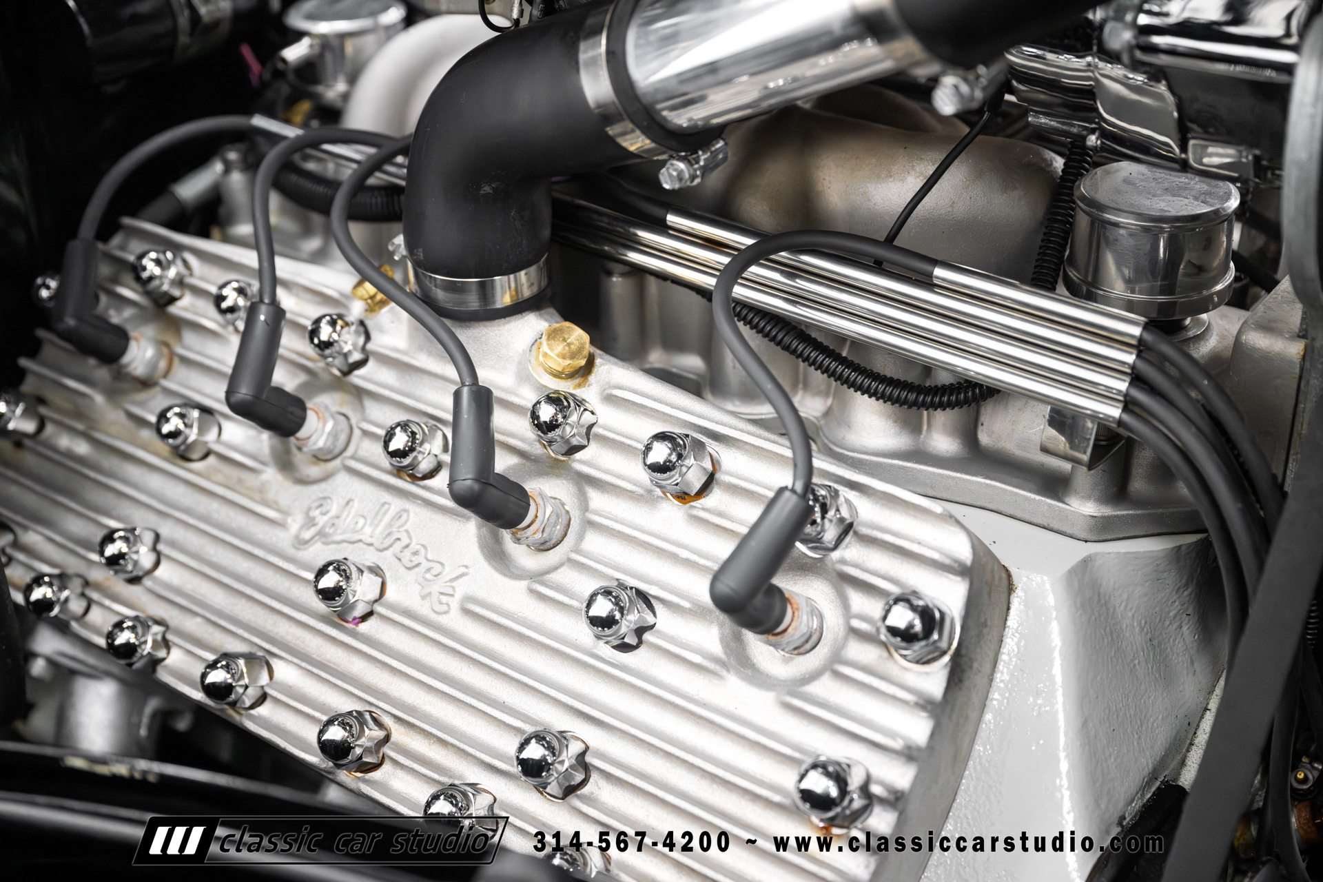 The Ford fires right up and falls into a nice steady idle. The flathead is a rebuilt, period correct unit running Edelbrock heads, an aluminum intake, Holley carburetor and Fenton exhaust manifolds. The car runs a dual aluminized exhaust system with mellow sounding mufflers. Keeping things cool is an oversized aluminum radiator with an electric fan.