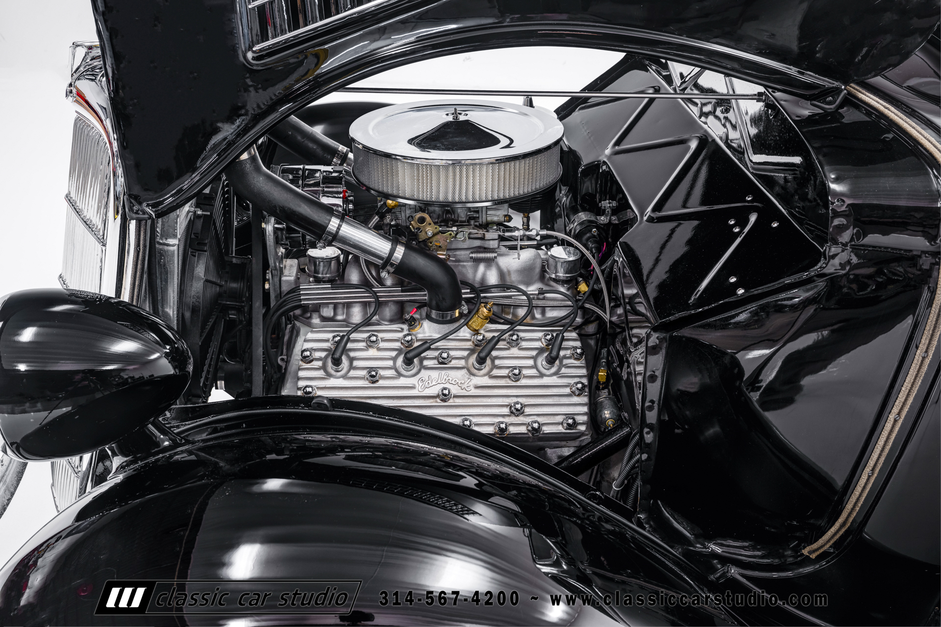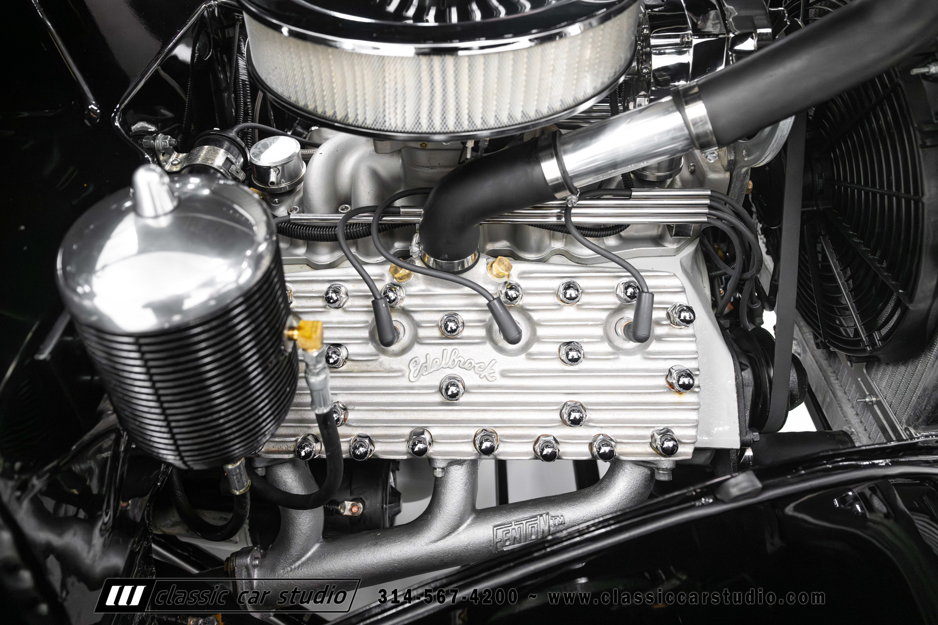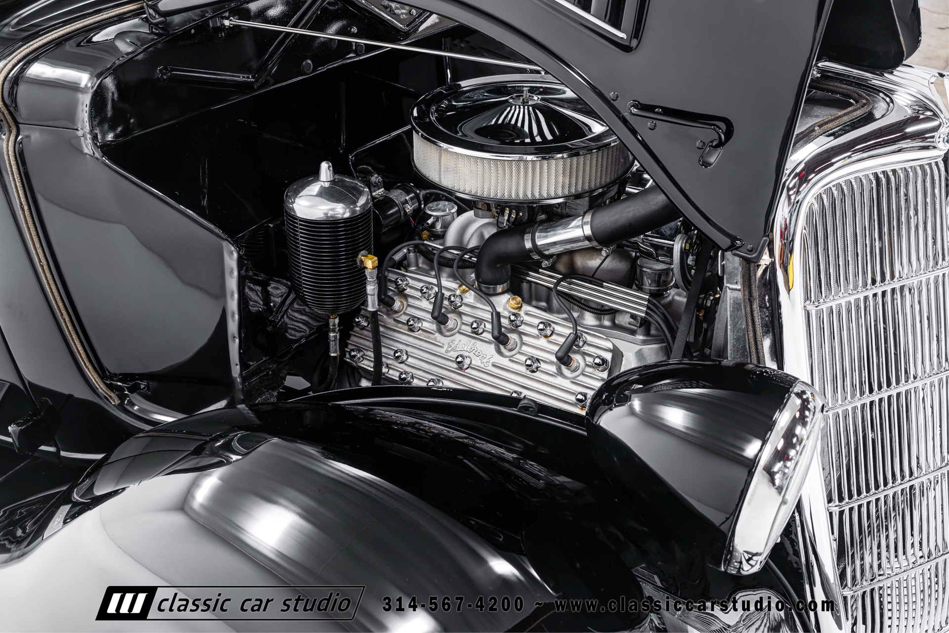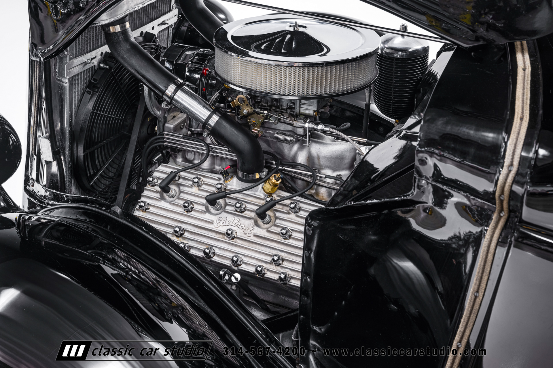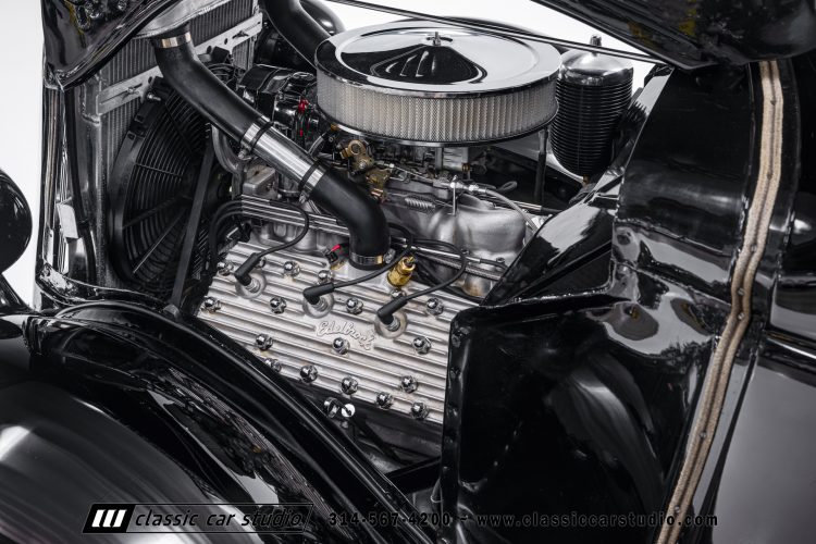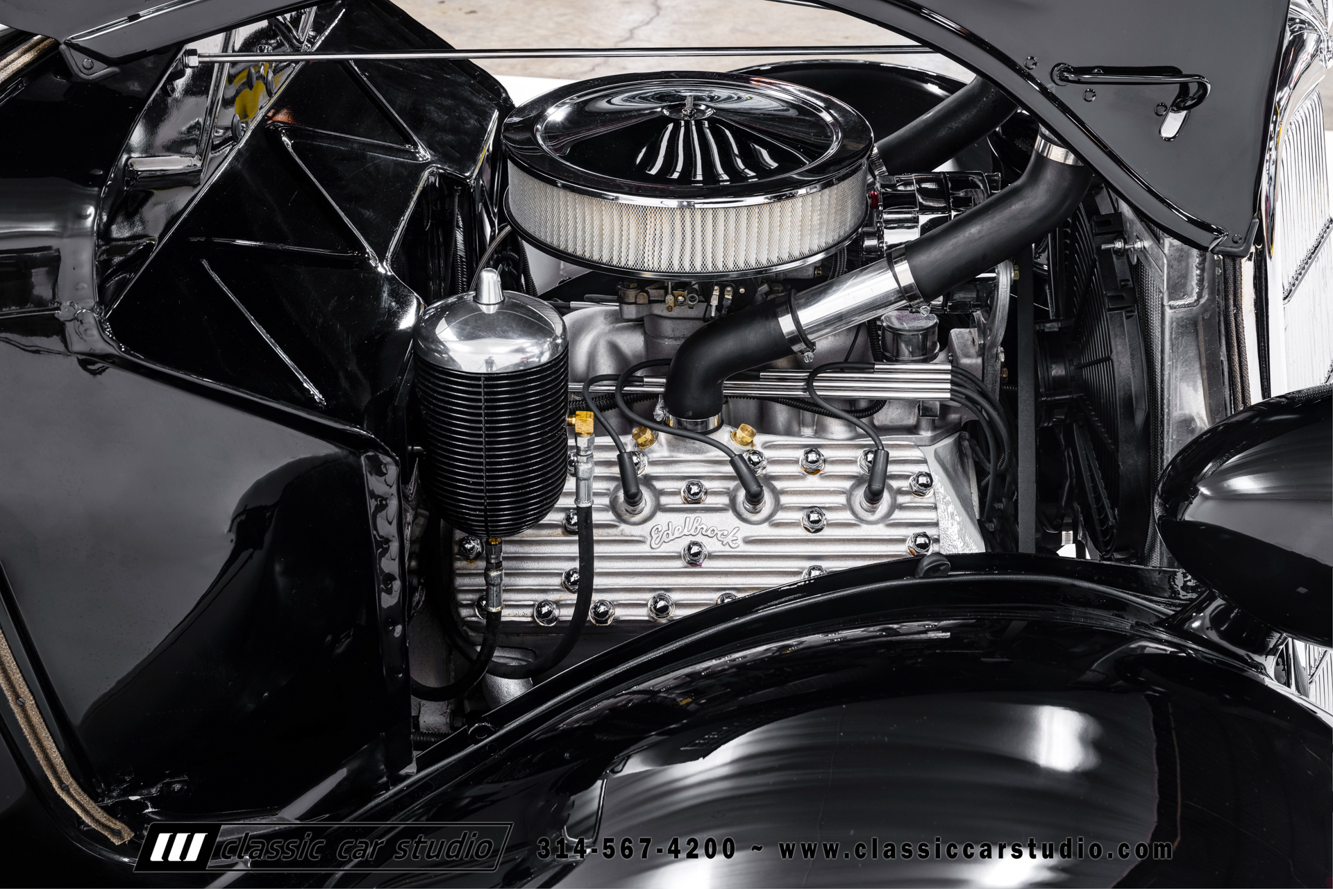 The Ford fires right up and falls into a nice steady idle. The flathead is a rebuilt, period correct unit running Edelbrock heads, an aluminum intake, Holley carburetor and Fenton exhaust manifolds. The car runs a dual aluminized exhaust system with mellow sounding mufflers. Keeping things cool is an oversized aluminum radiator with an electric fan.