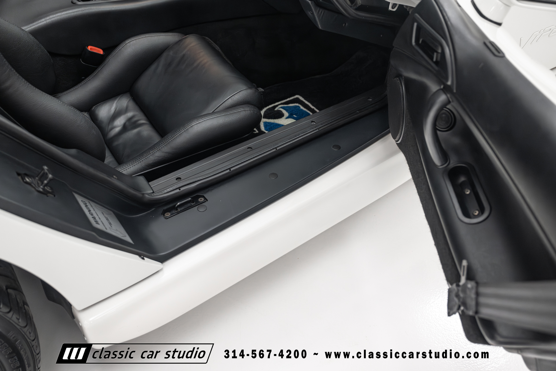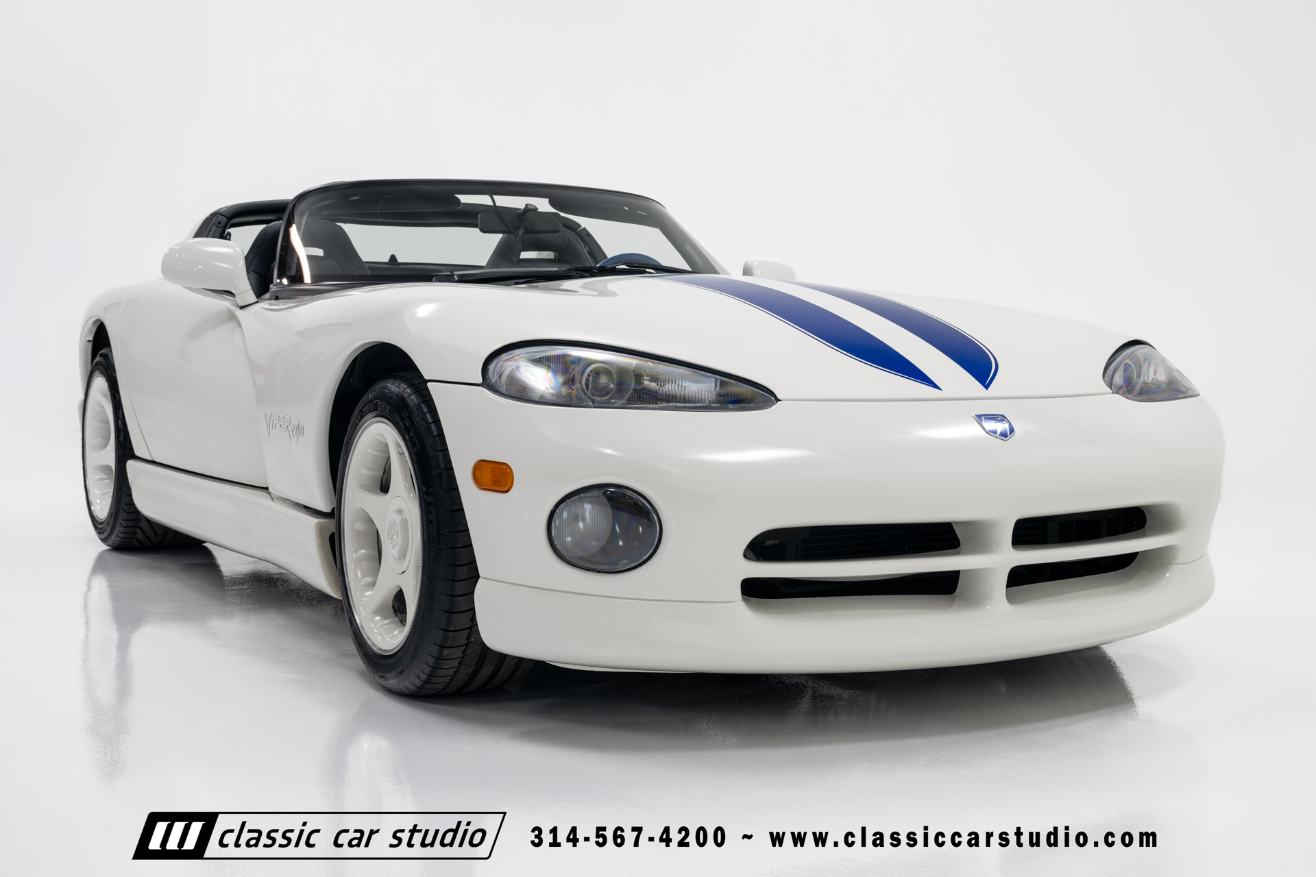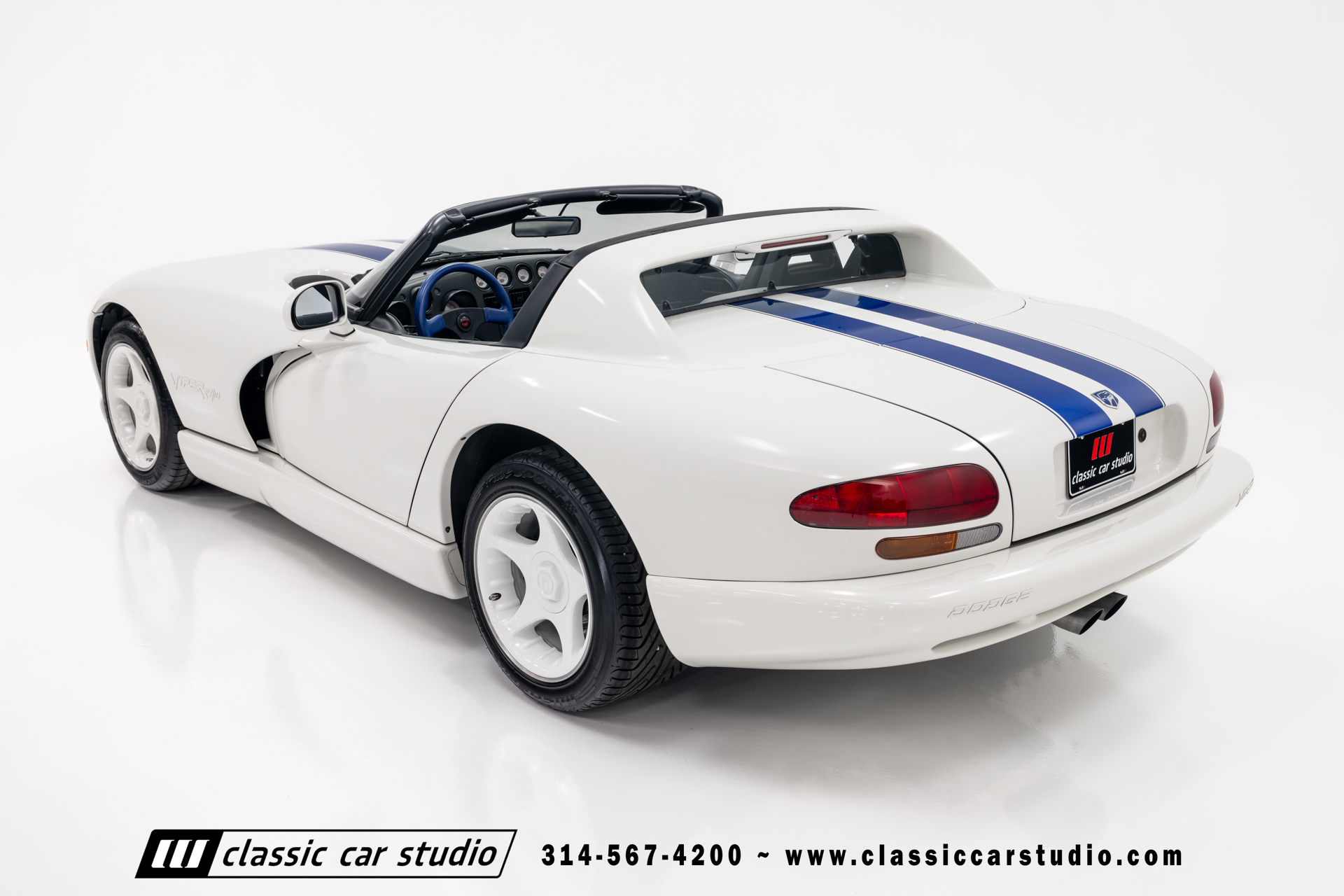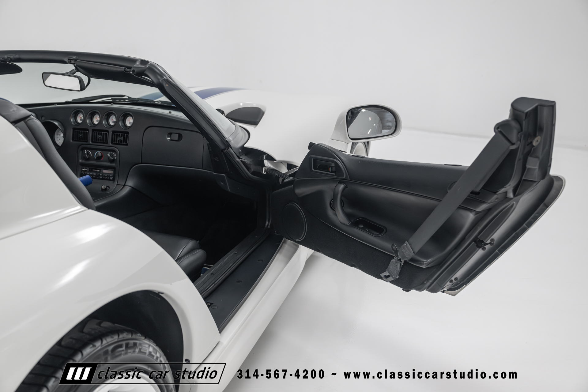This Viper comes equipped with a host of factory features, including pristine 17-inch wheels in white, a limited-slip differential for superior handling, and a soft top and side windows. The luxurious interior boasts leather upholstery with custom blue accents on the steering wheel, gear shifter, and hand brake, along with sporty white-faced dials.