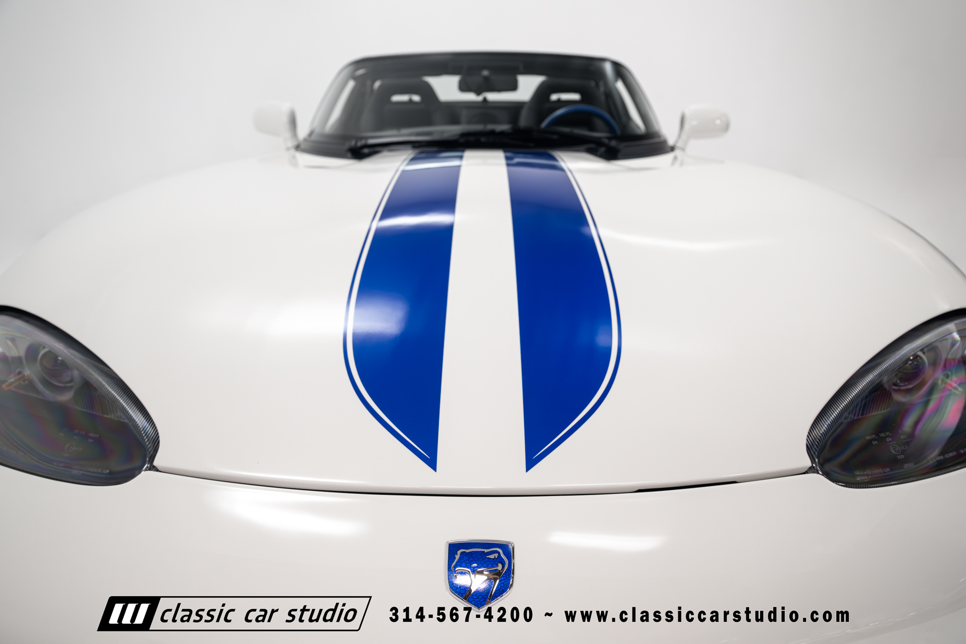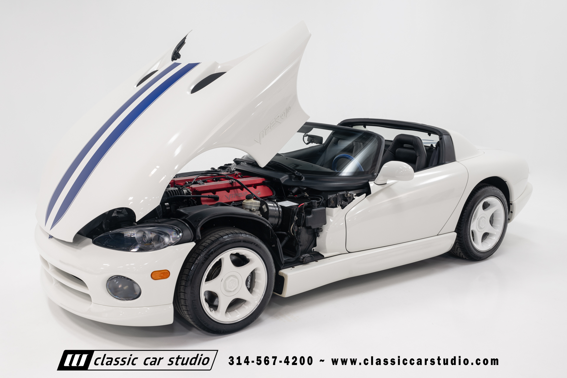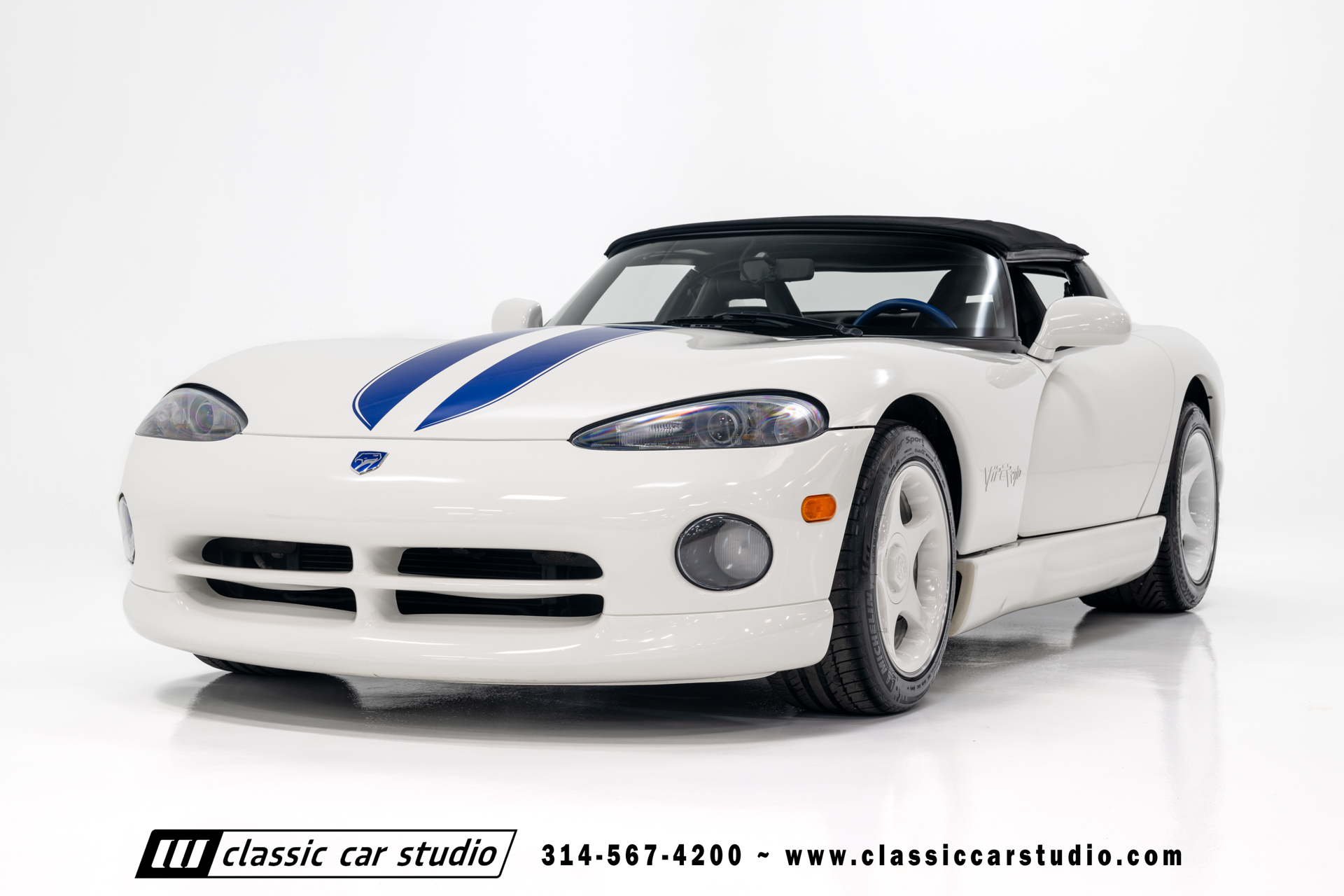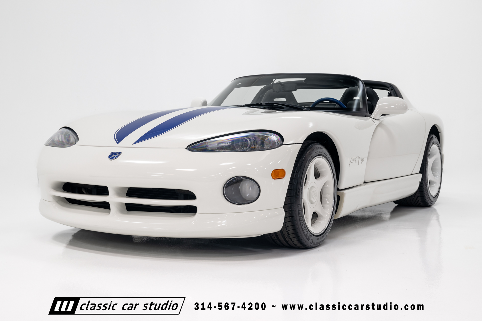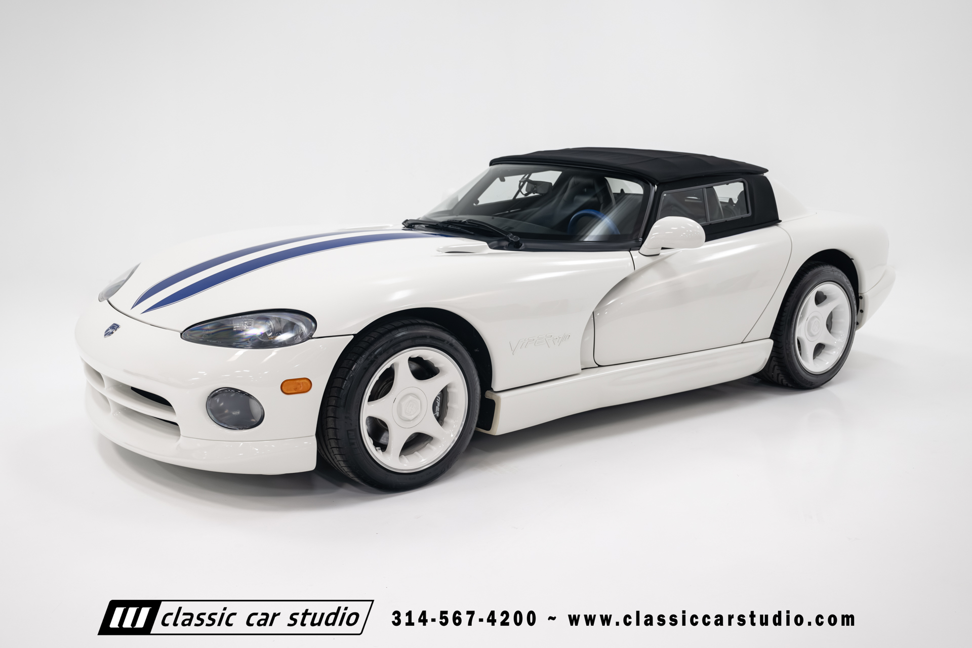 This Viper comes equipped with a host of factory features, including pristine 17-inch wheels in white, a limited-slip differential for superior handling, and a soft top and side windows. The luxurious interior boasts leather upholstery with custom blue accents on the steering wheel, gear shifter, and hand brake, along with sporty white-faced dials.