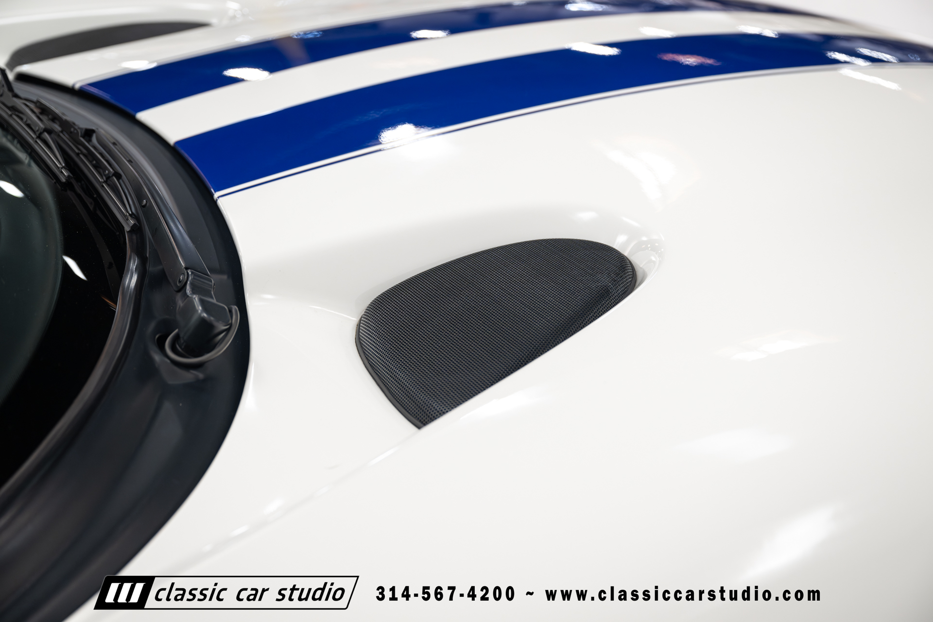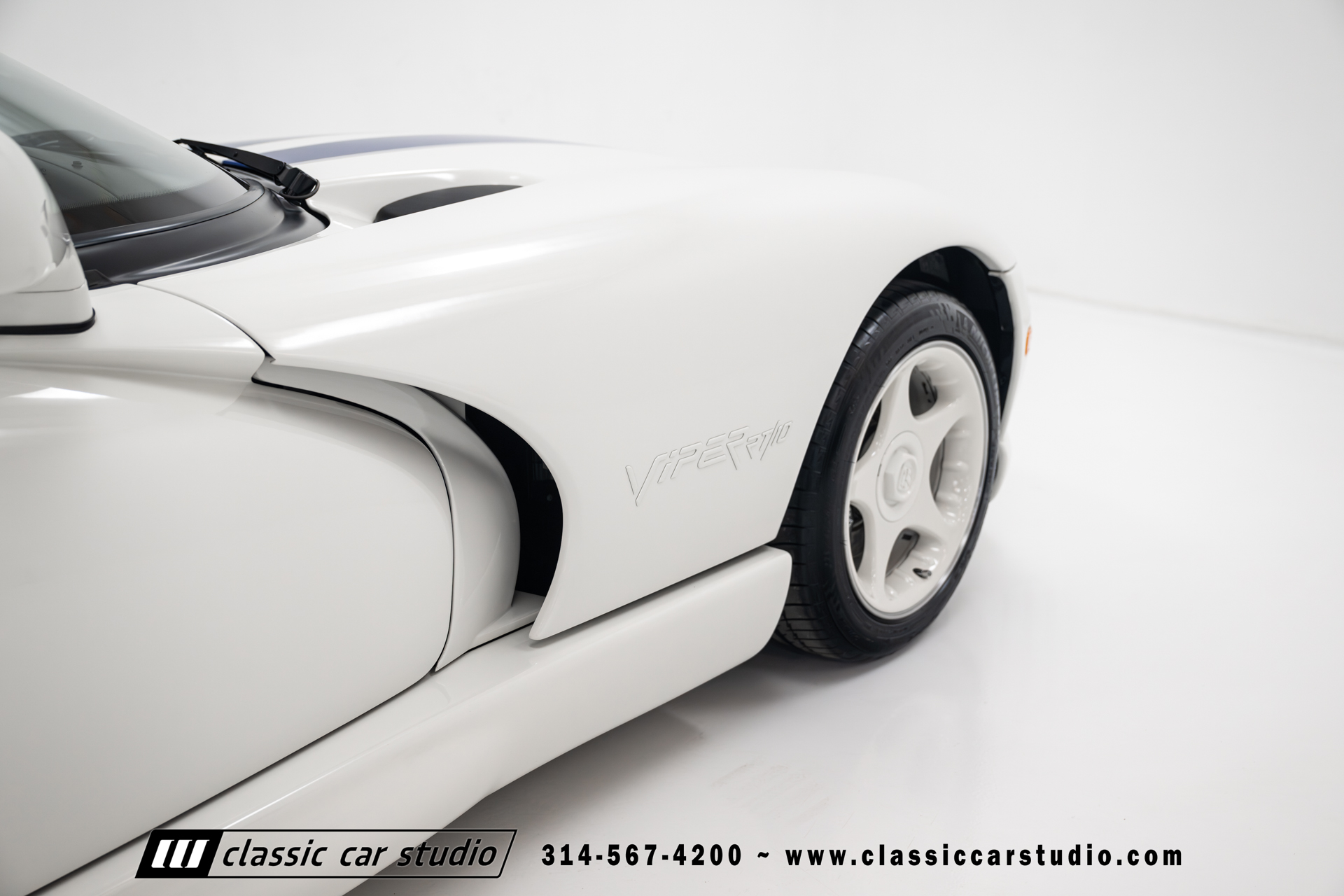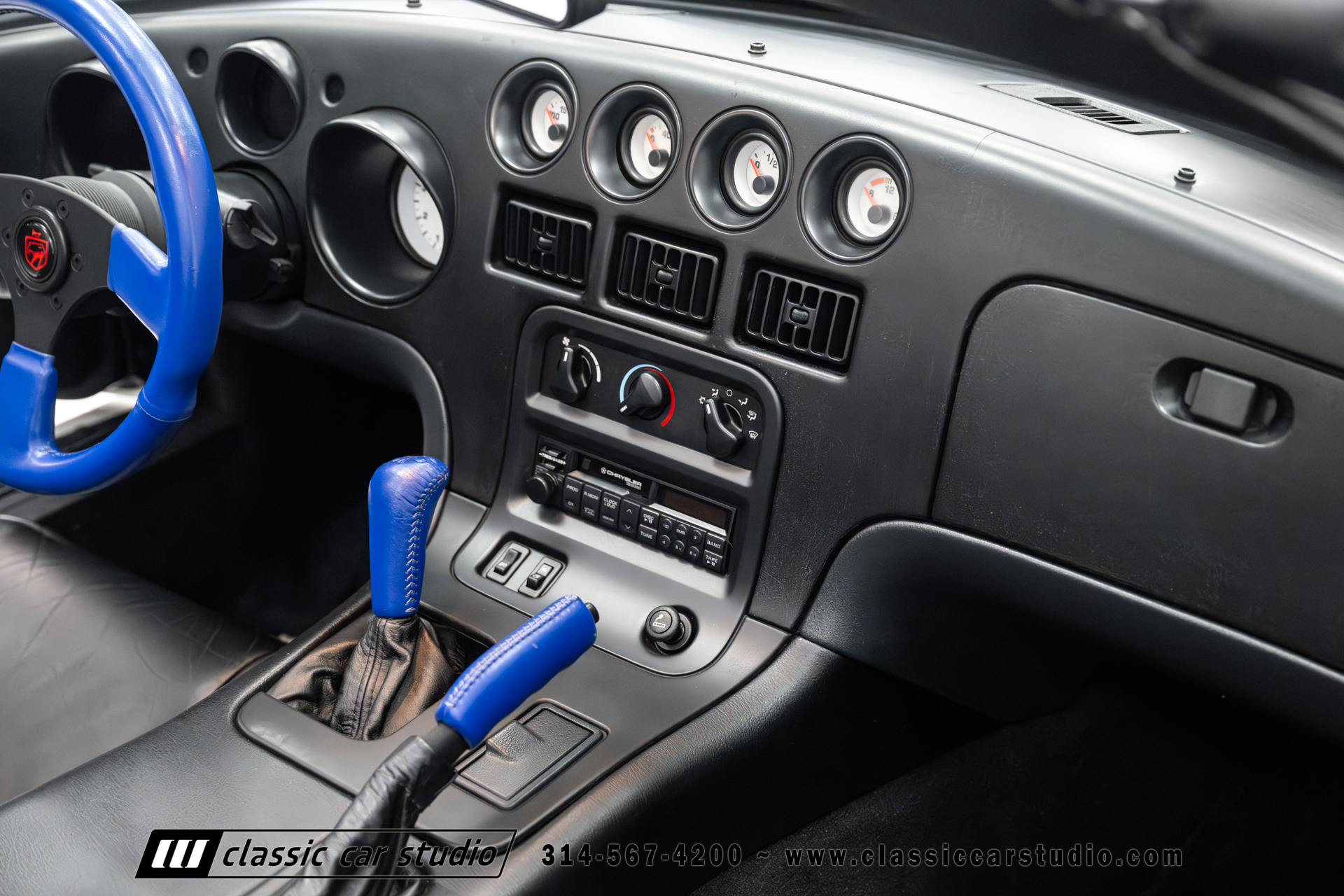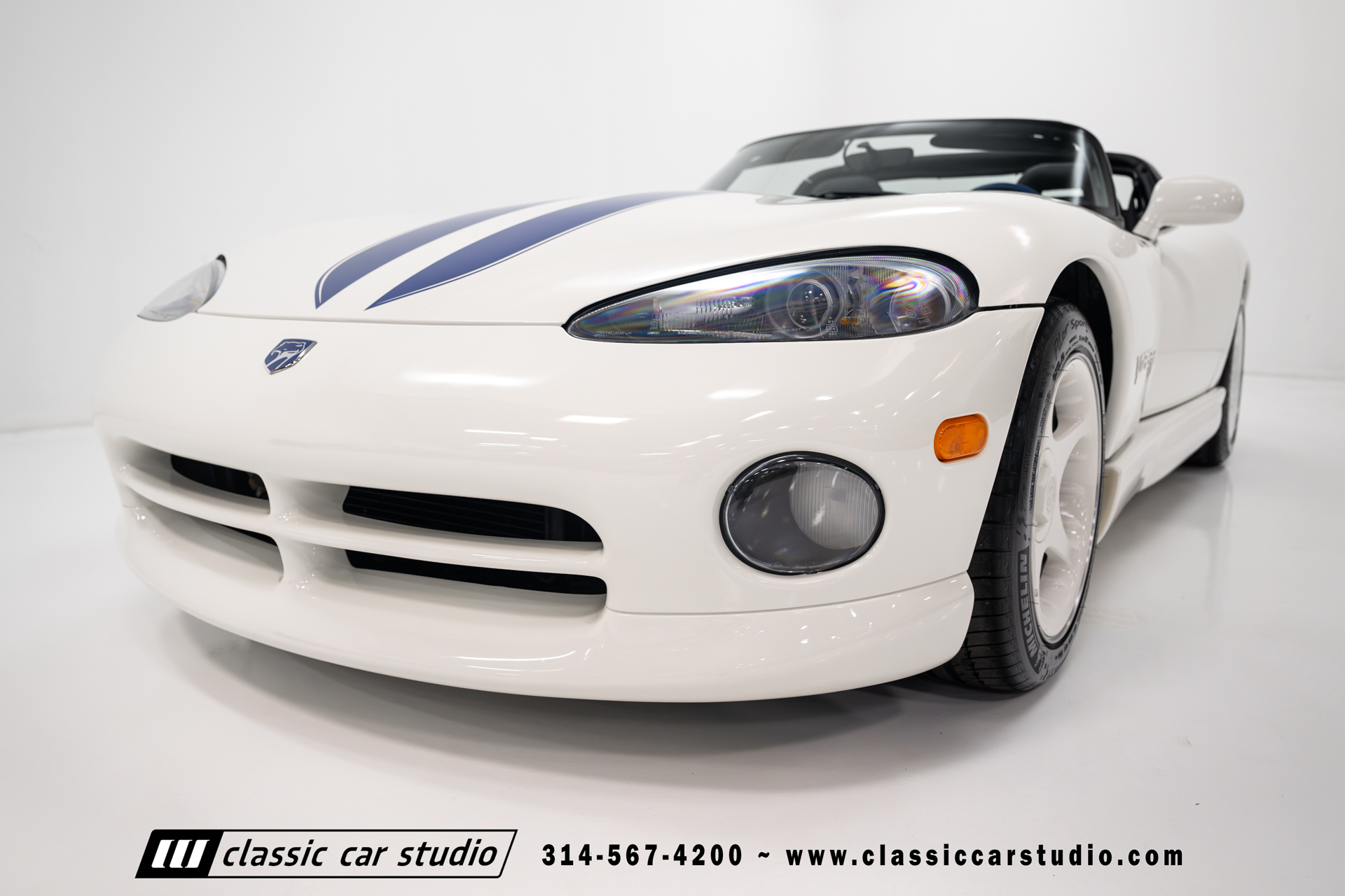 This Viper comes equipped with a host of factory features, including pristine 17-inch wheels in white, a limited-slip differential for superior handling, and a soft top and side windows. The luxurious interior boasts leather upholstery with custom blue accents on the steering wheel, gear shifter, and hand brake, along with sporty white-faced dials.