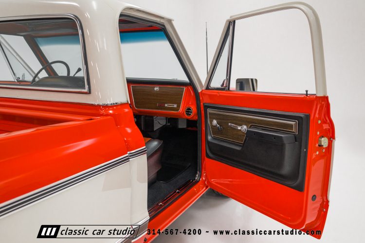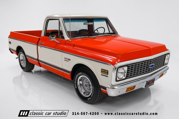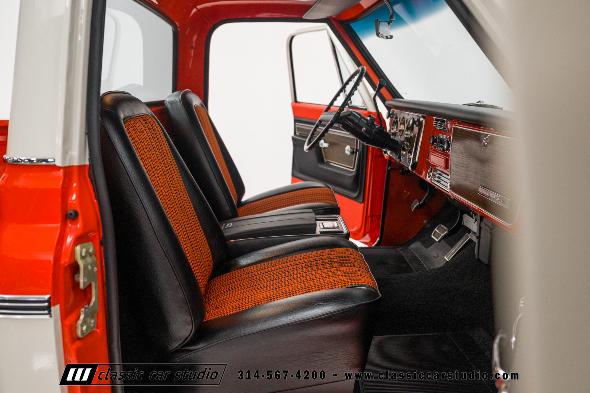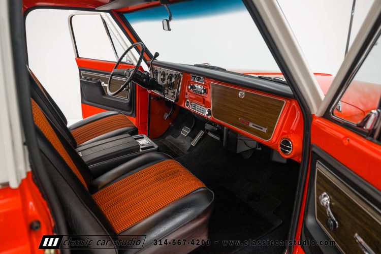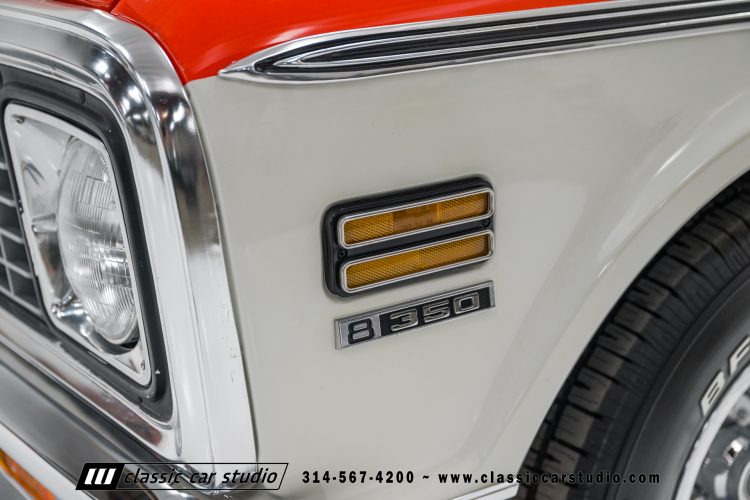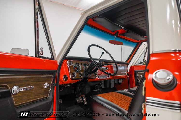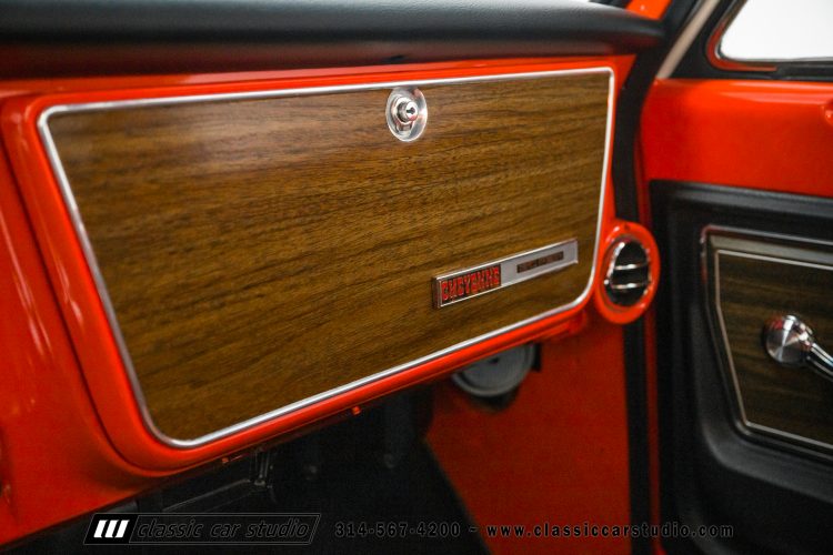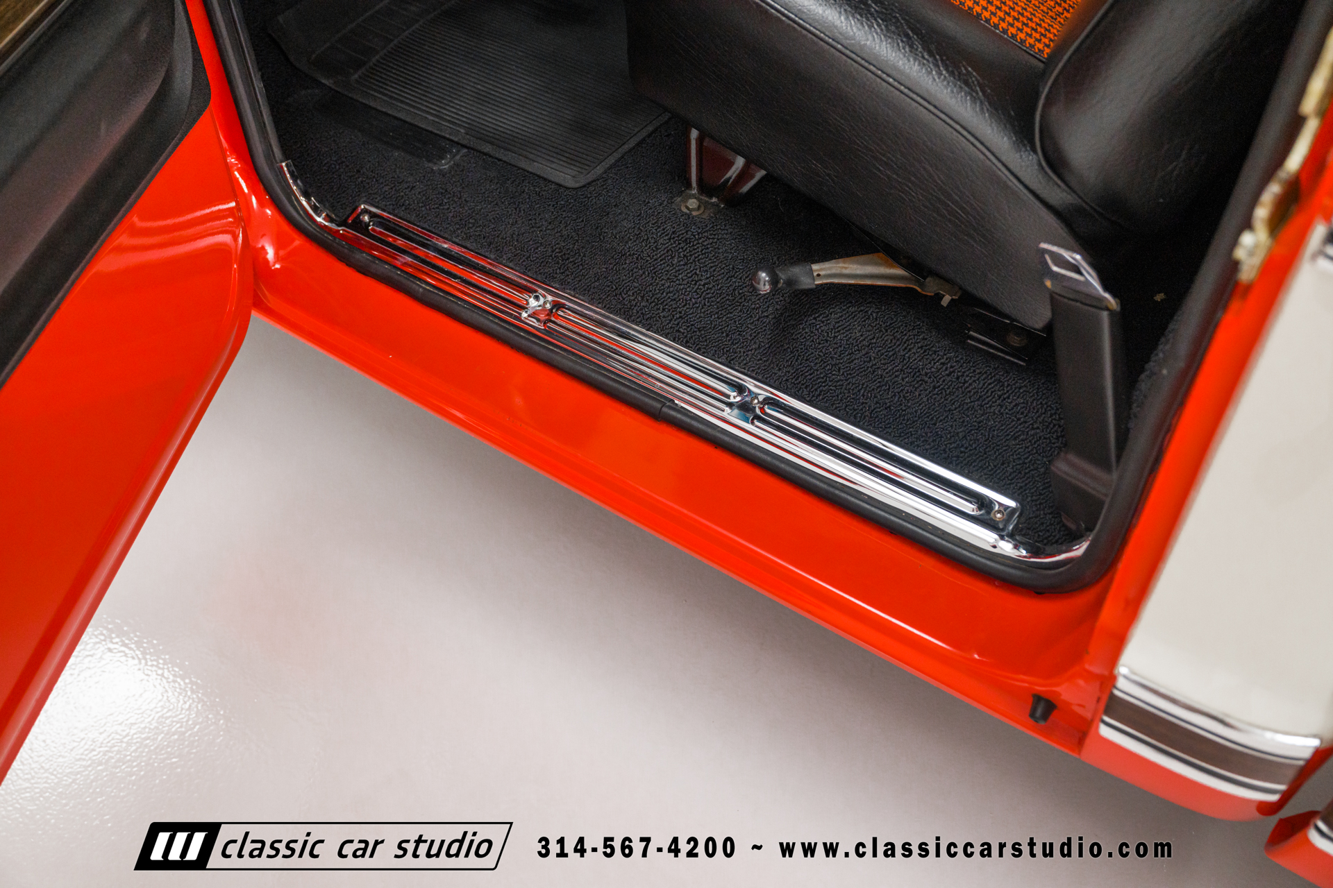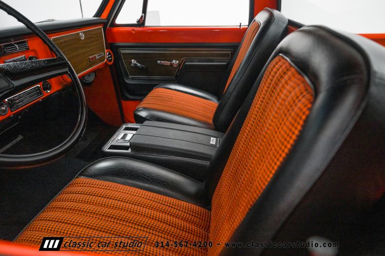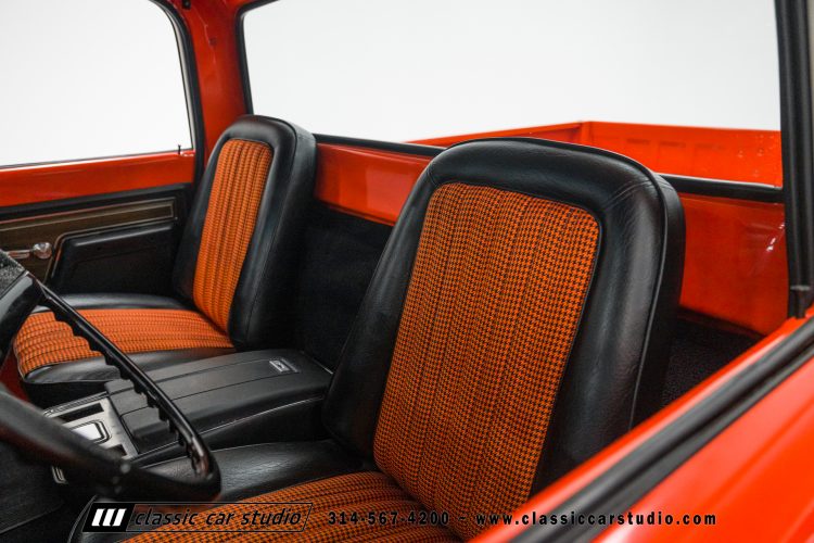 This 1972 Chevrolet C10 is a Fleetside pickup that was refurbished under prior ownership and is finished in orange and white over black vinyl and orange houndstooth cloth upholstery. Power is supplied by a 350ci V8 linked with a TH350 three-speed automatic transmission and a 12-bolt rear axle. Additional equipment includes Cheyenne Super badging, a wood-lined bed floor, air conditioning, power steering, power front disc brakes, 15″ Rally-style wheels, woodgrain trim accents, and a push-button AM/FM radio. This C10 was acquired by the selling dealer in June 2023 and is now offered in Missouri with a clean Kentucky title.