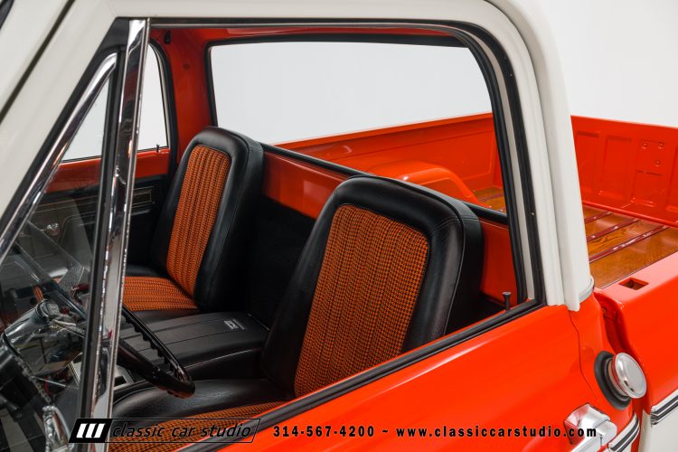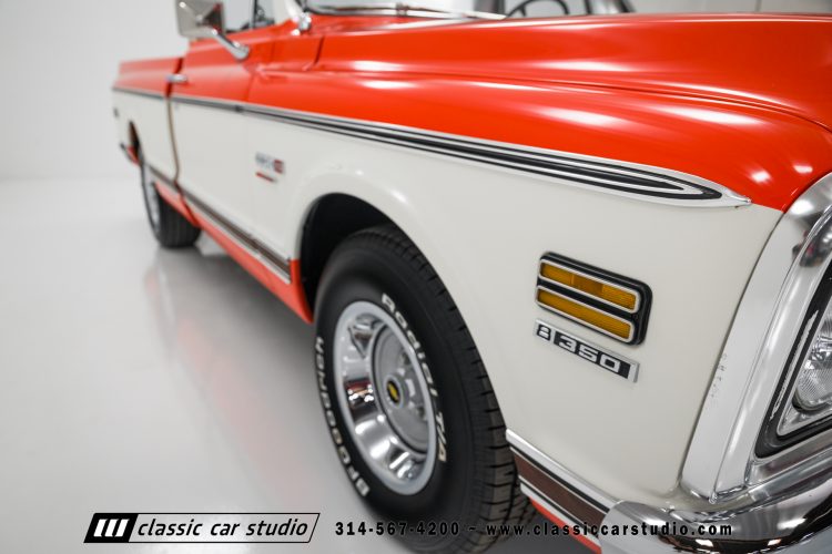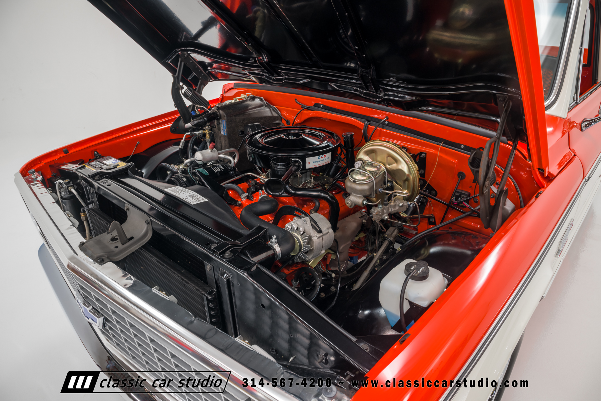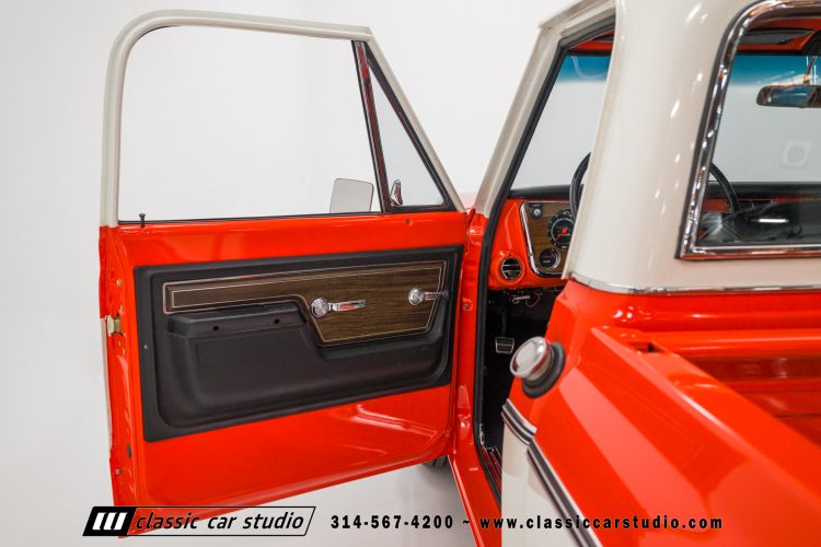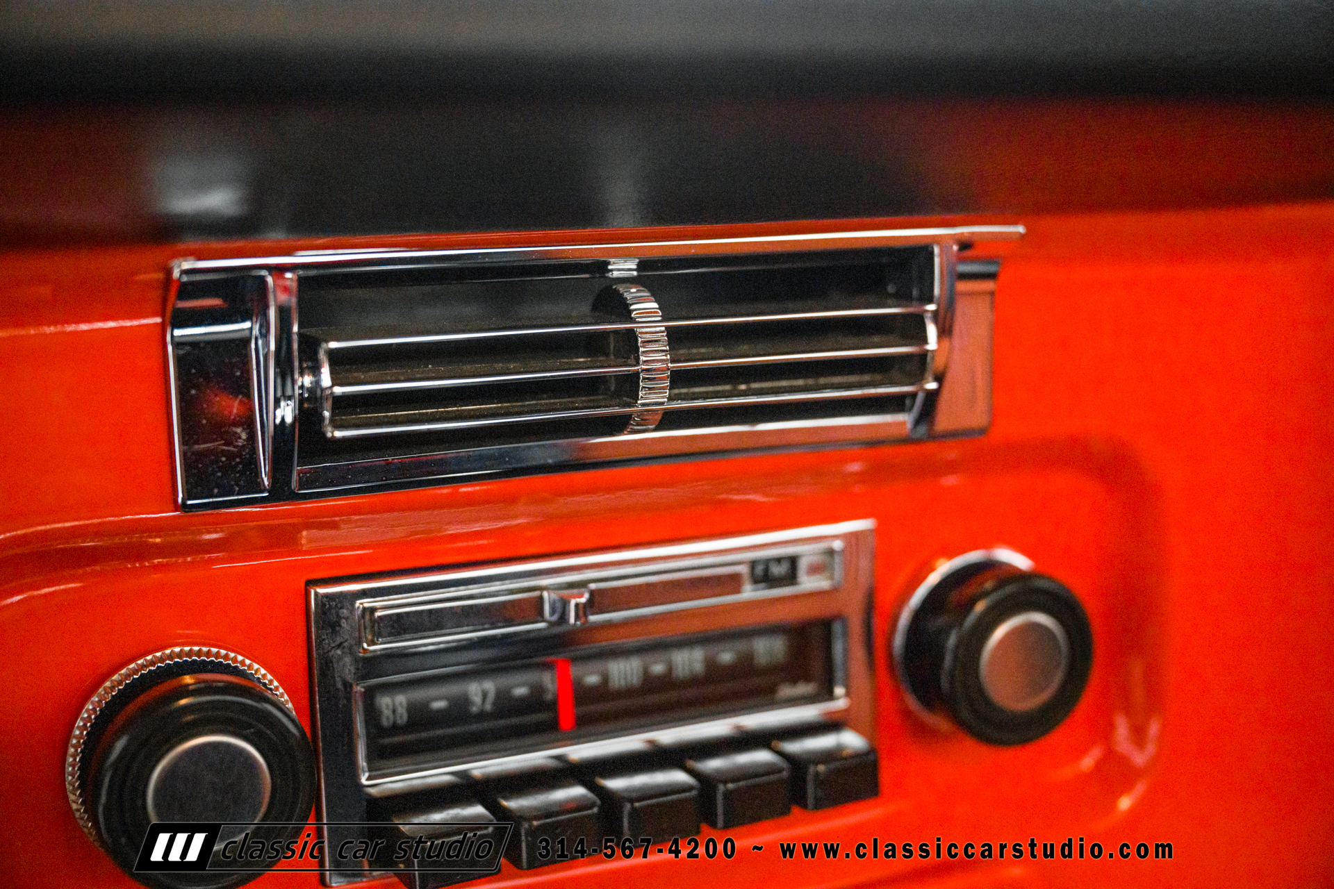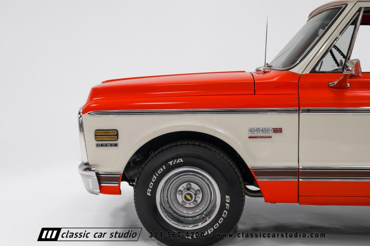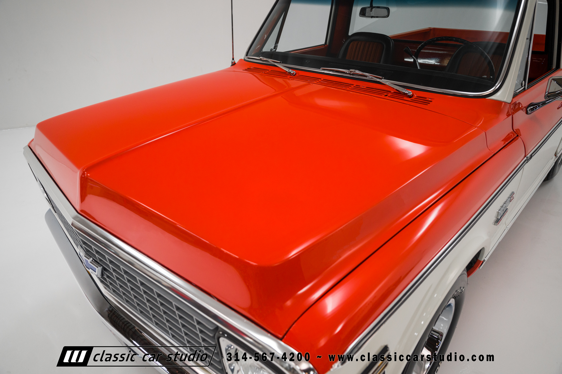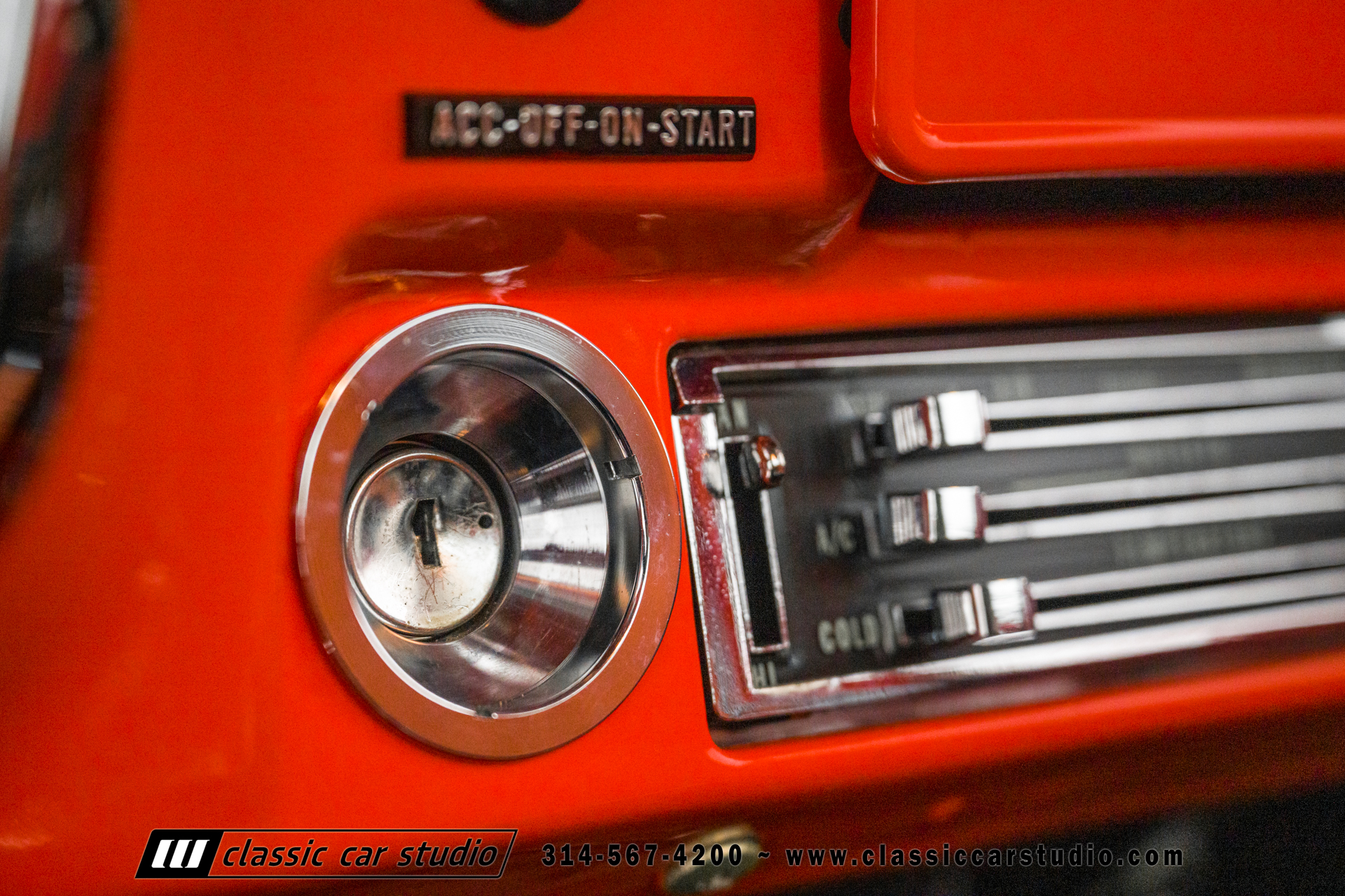 This 1972 Chevrolet C10 is a Fleetside pickup that was refurbished under prior ownership and is finished in orange and white over black vinyl and orange houndstooth cloth upholstery. Power is supplied by a 350ci V8 linked with a TH350 three-speed automatic transmission and a 12-bolt rear axle. Additional equipment includes Cheyenne Super badging, a wood-lined bed floor, air conditioning, power steering, power front disc brakes, 15″ Rally-style wheels, woodgrain trim accents, and a push-button AM/FM radio. This C10 was acquired by the selling dealer in June 2023 and is now offered in Missouri with a clean Kentucky title.