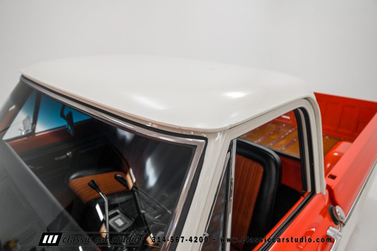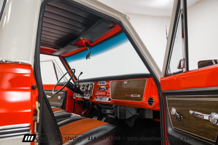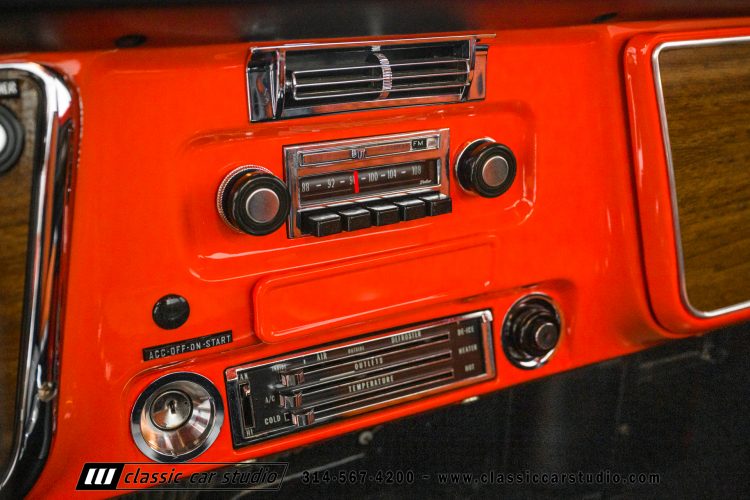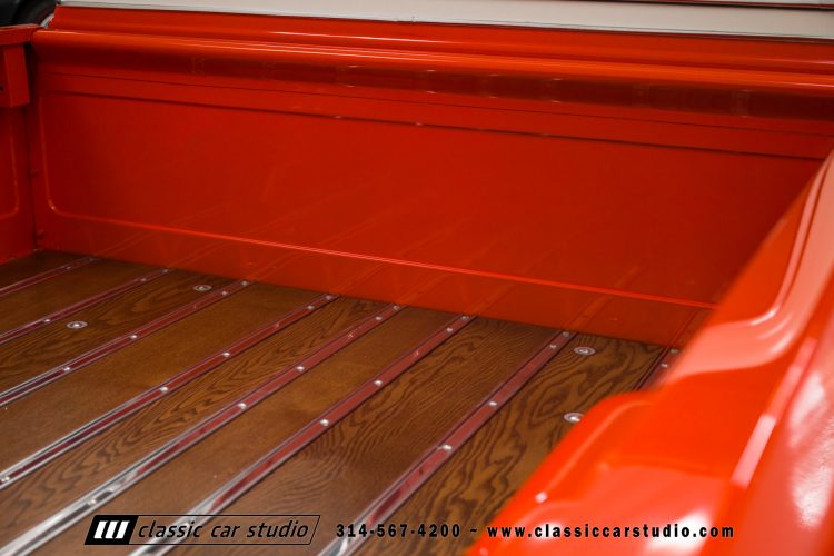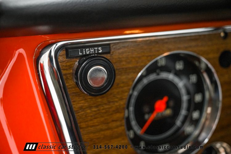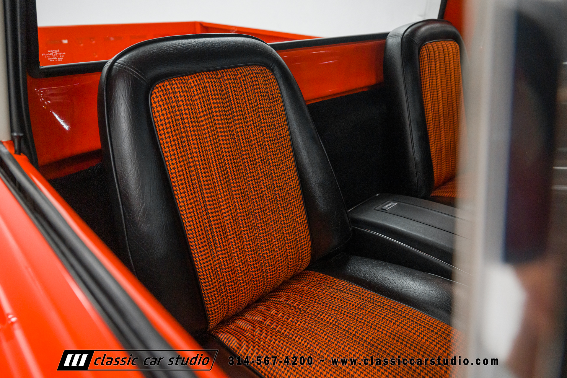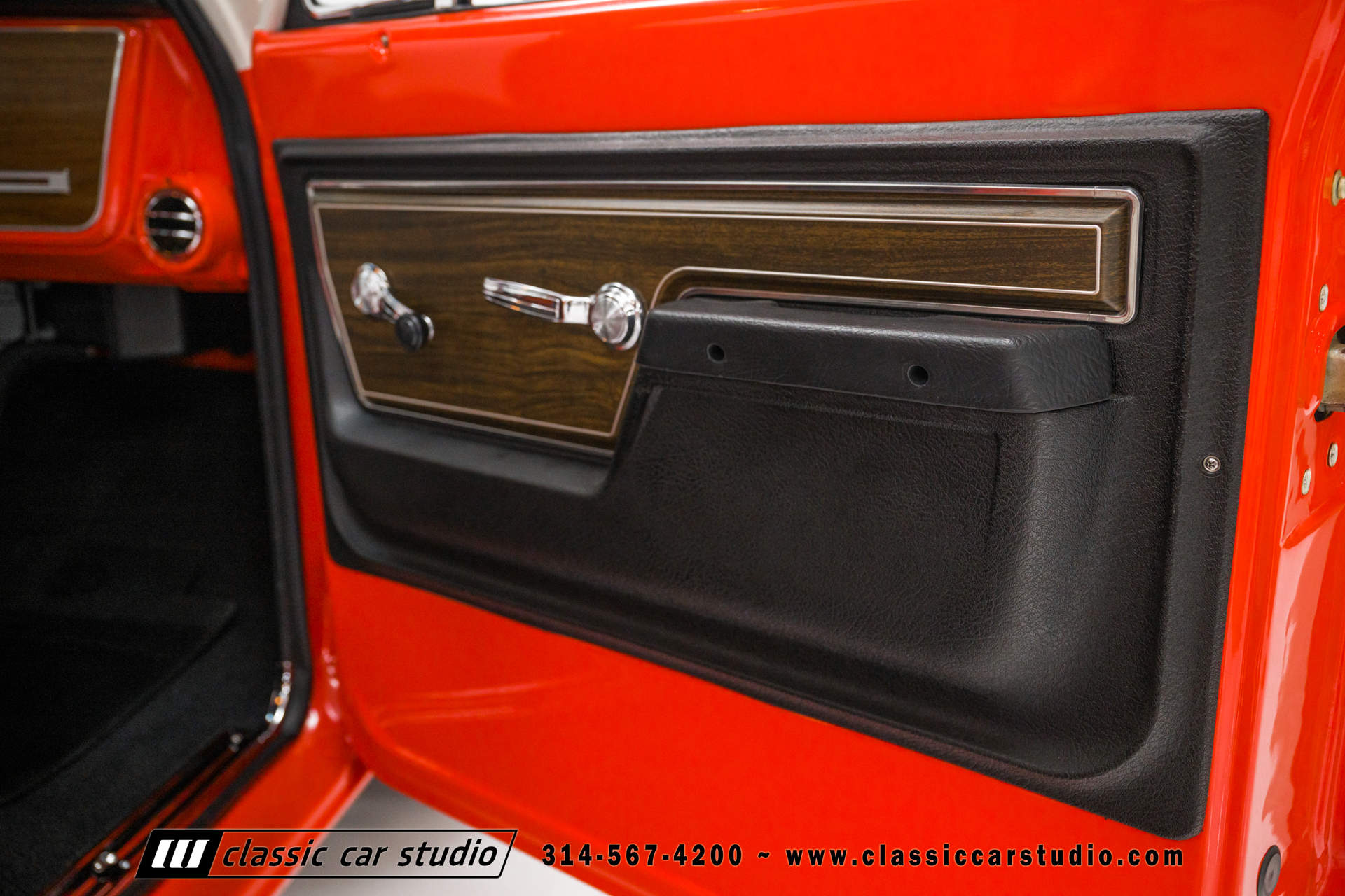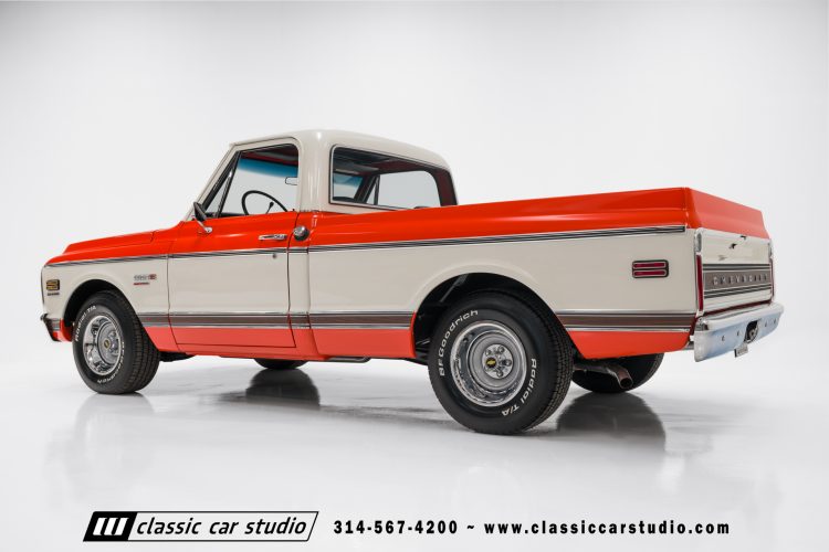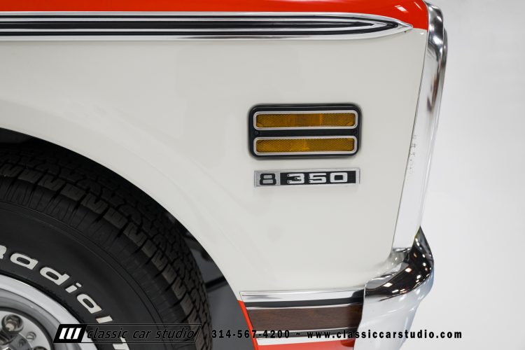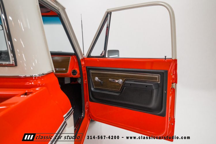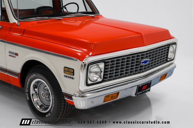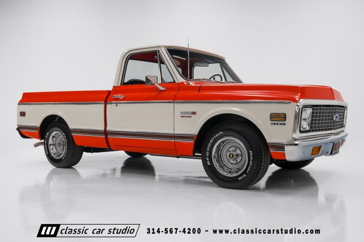 This 1972 Chevrolet C10 is a Fleetside pickup that was refurbished under prior ownership and is finished in orange and white over black vinyl and orange houndstooth cloth upholstery. Power is supplied by a 350ci V8 linked with a TH350 three-speed automatic transmission and a 12-bolt rear axle. Additional equipment includes Cheyenne Super badging, a wood-lined bed floor, air conditioning, power steering, power front disc brakes, 15″ Rally-style wheels, woodgrain trim accents, and a push-button AM/FM radio. This C10 was acquired by the selling dealer in June 2023 and is now offered in Missouri with a clean Kentucky title.