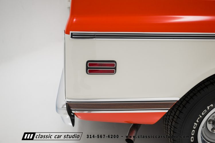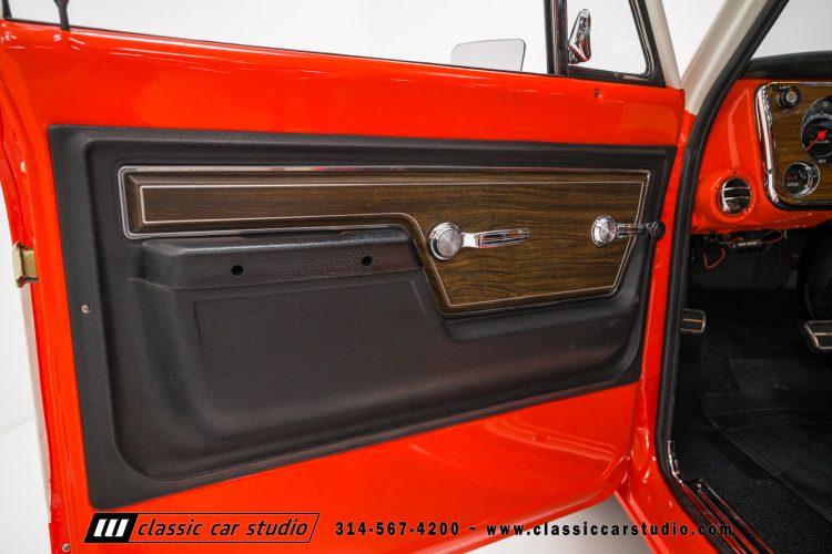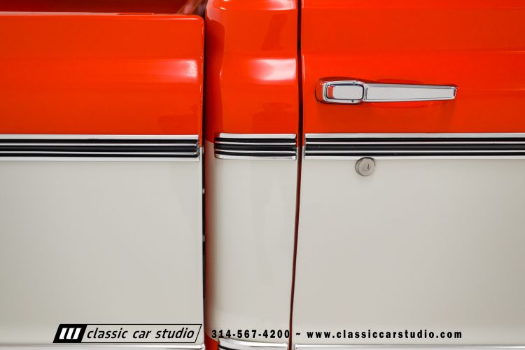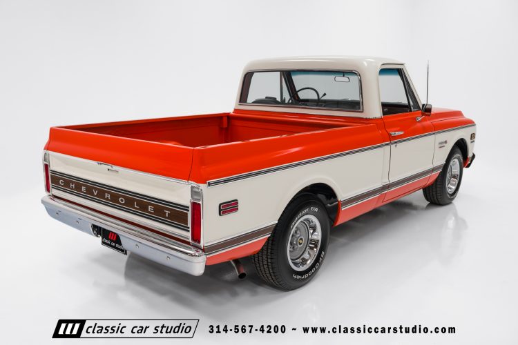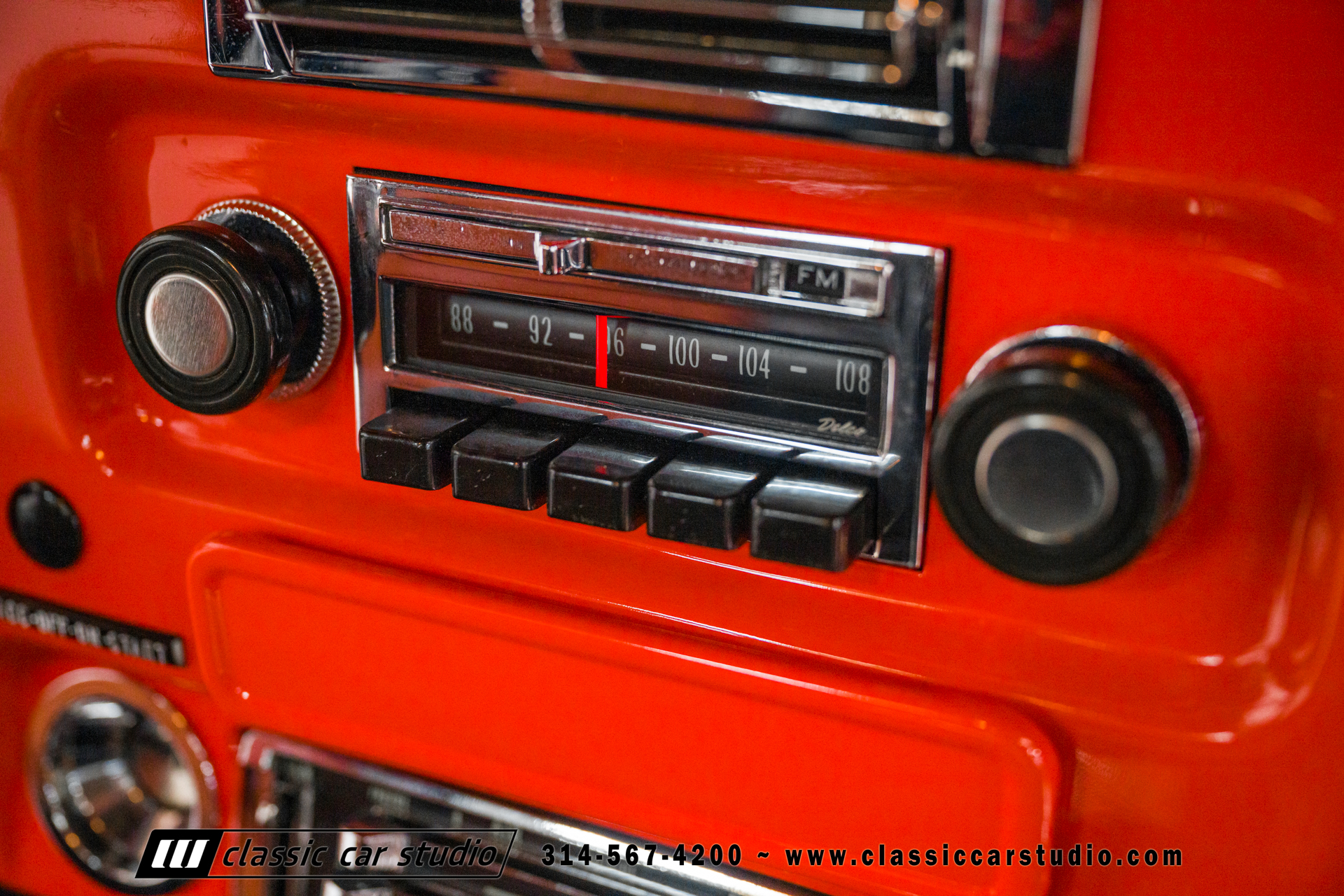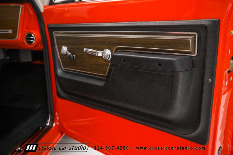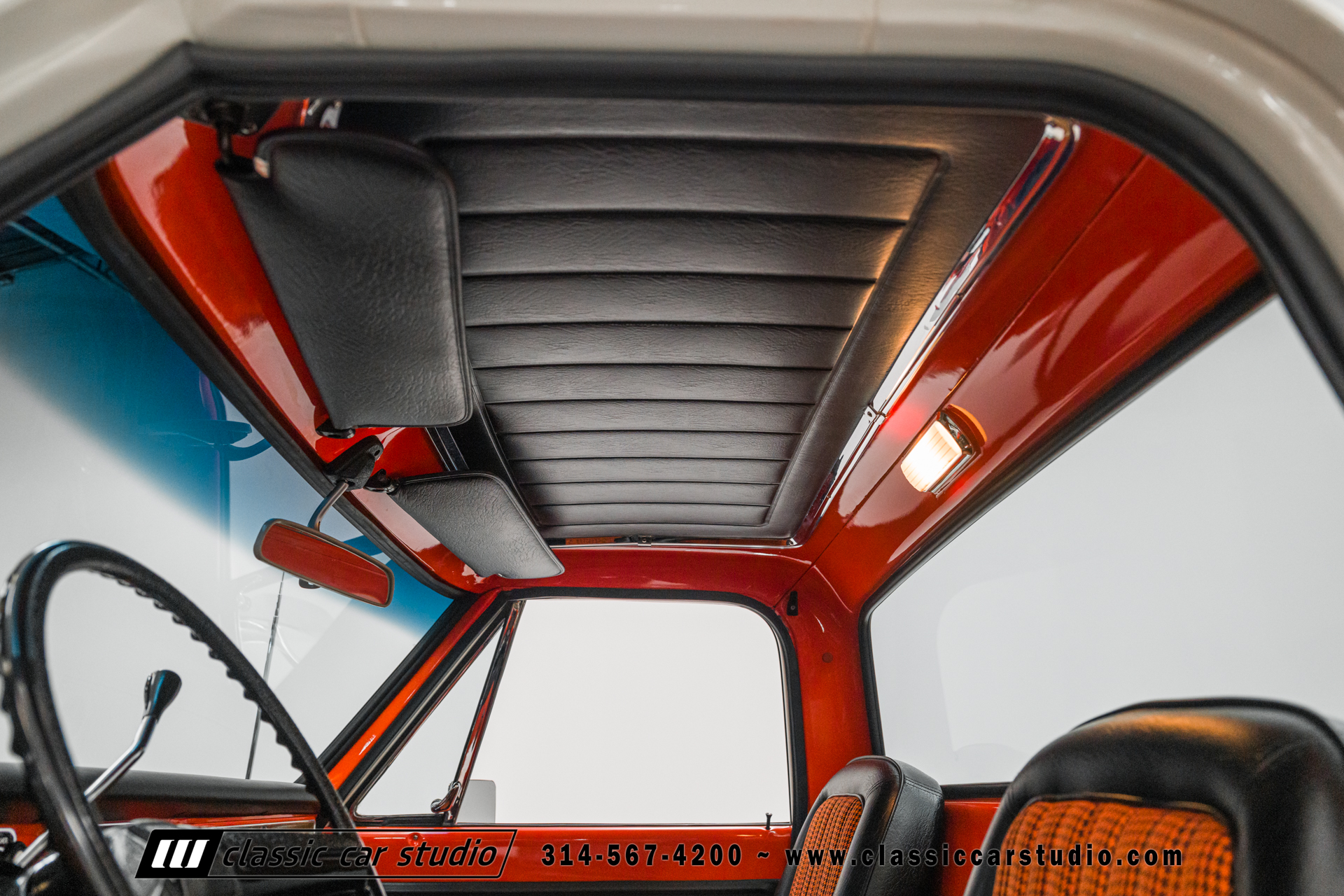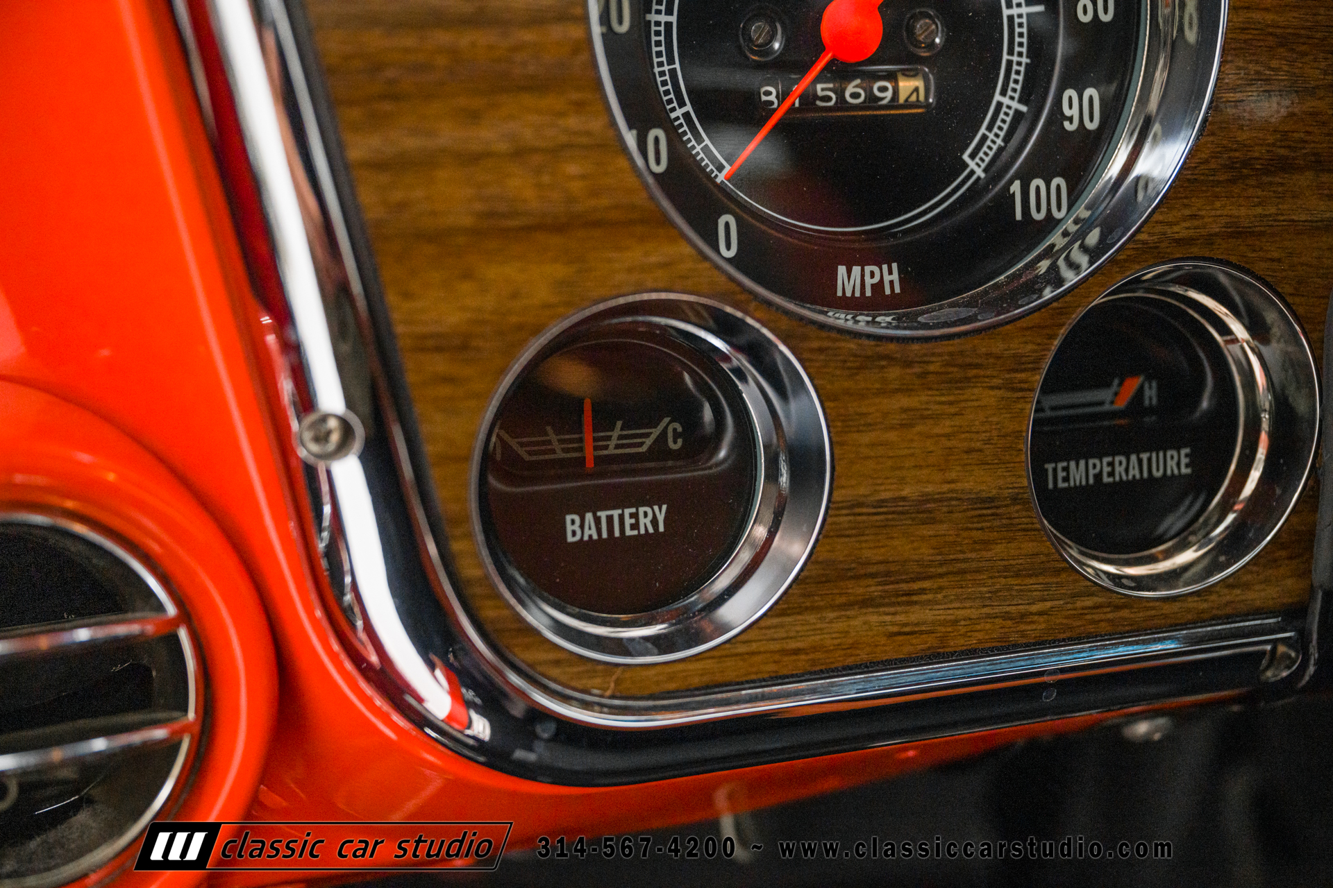 This 1972 Chevrolet C10 is a Fleetside pickup that was refurbished under prior ownership and is finished in orange and white over black vinyl and orange houndstooth cloth upholstery. Power is supplied by a 350ci V8 linked with a TH350 three-speed automatic transmission and a 12-bolt rear axle. Additional equipment includes Cheyenne Super badging, a wood-lined bed floor, air conditioning, power steering, power front disc brakes, 15″ Rally-style wheels, woodgrain trim accents, and a push-button AM/FM radio. This C10 was acquired by the selling dealer in June 2023 and is now offered in Missouri with a clean Kentucky title.