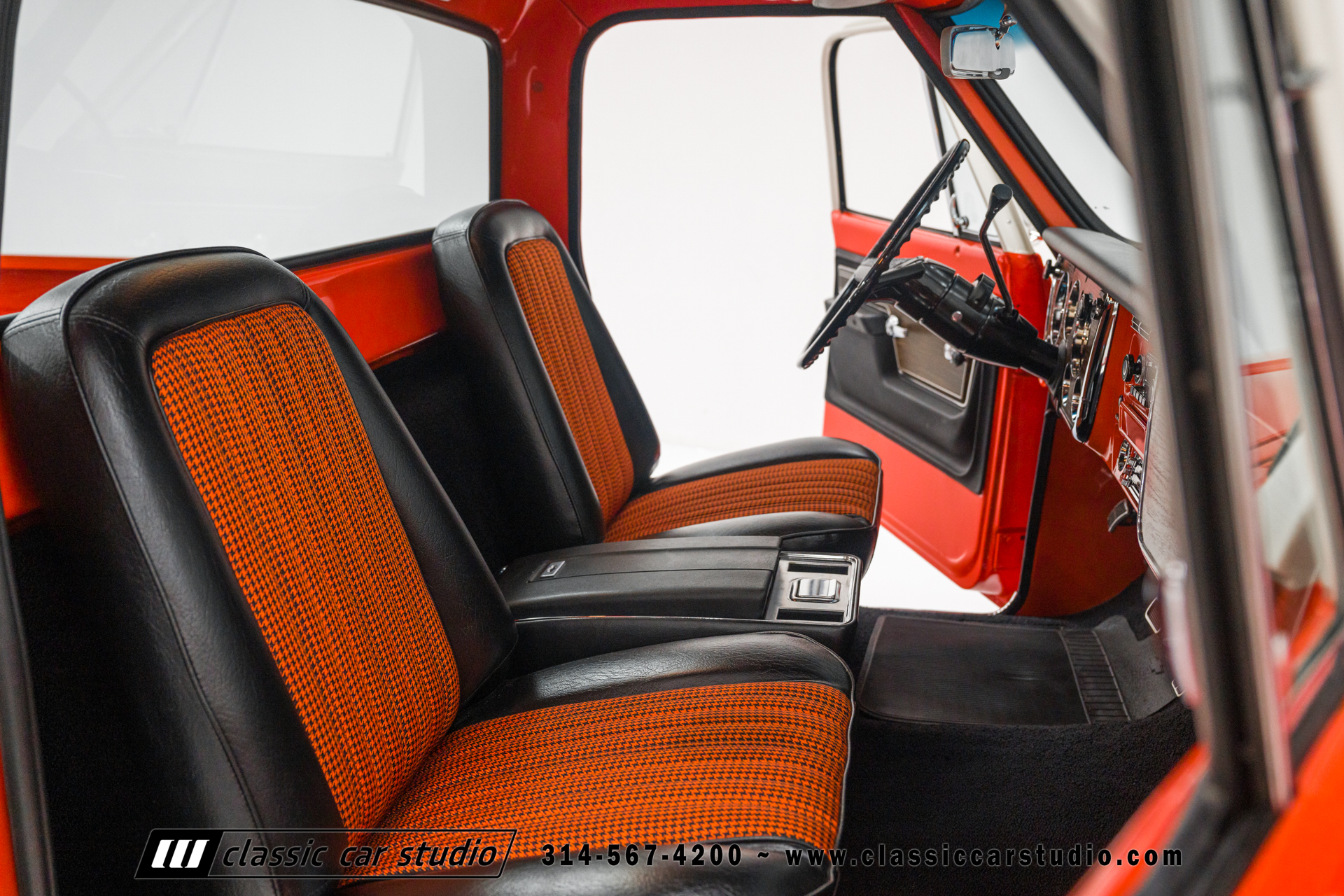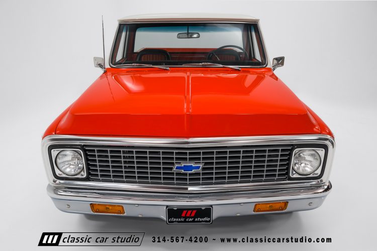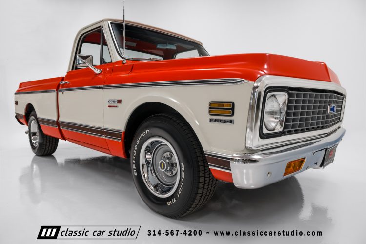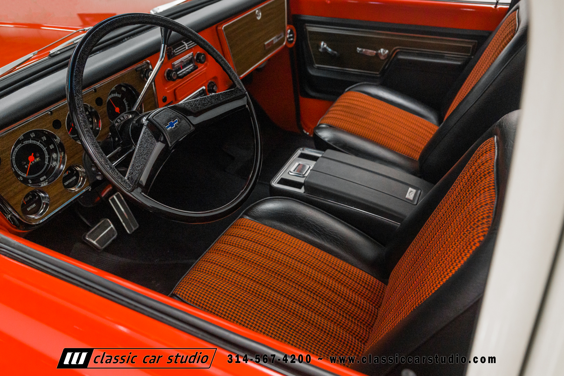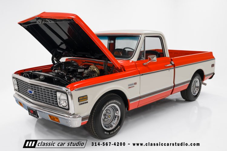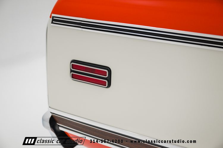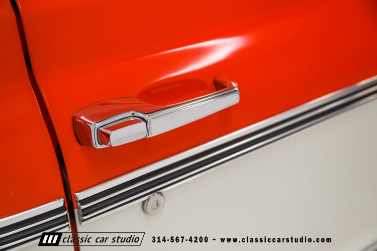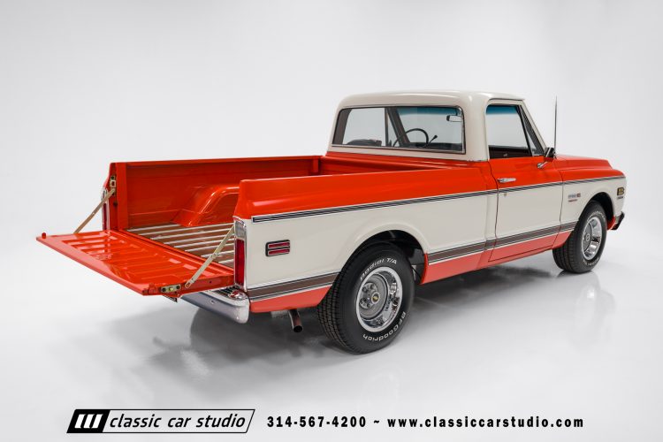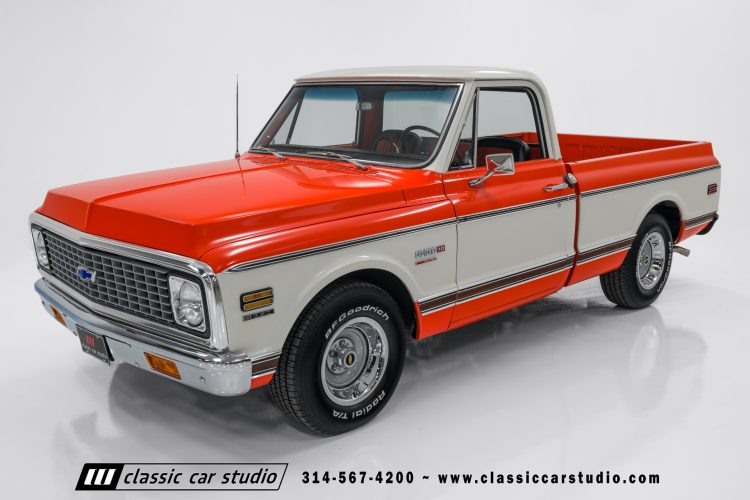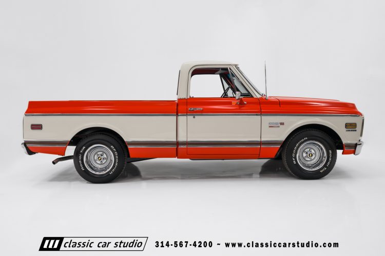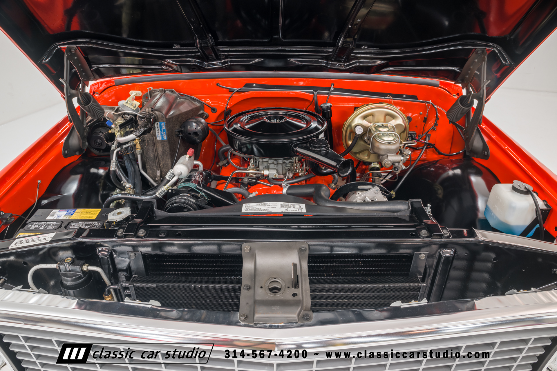 This 1972 Chevrolet C10 is a Fleetside pickup that was refurbished under prior ownership and is finished in orange and white over black vinyl and orange houndstooth cloth upholstery. Power is supplied by a 350ci V8 linked with a TH350 three-speed automatic transmission and a 12-bolt rear axle. Additional equipment includes Cheyenne Super badging, a wood-lined bed floor, air conditioning, power steering, power front disc brakes, 15″ Rally-style wheels, woodgrain trim accents, and a push-button AM/FM radio. This C10 was acquired by the selling dealer in June 2023 and is now offered in Missouri with a clean Kentucky title.