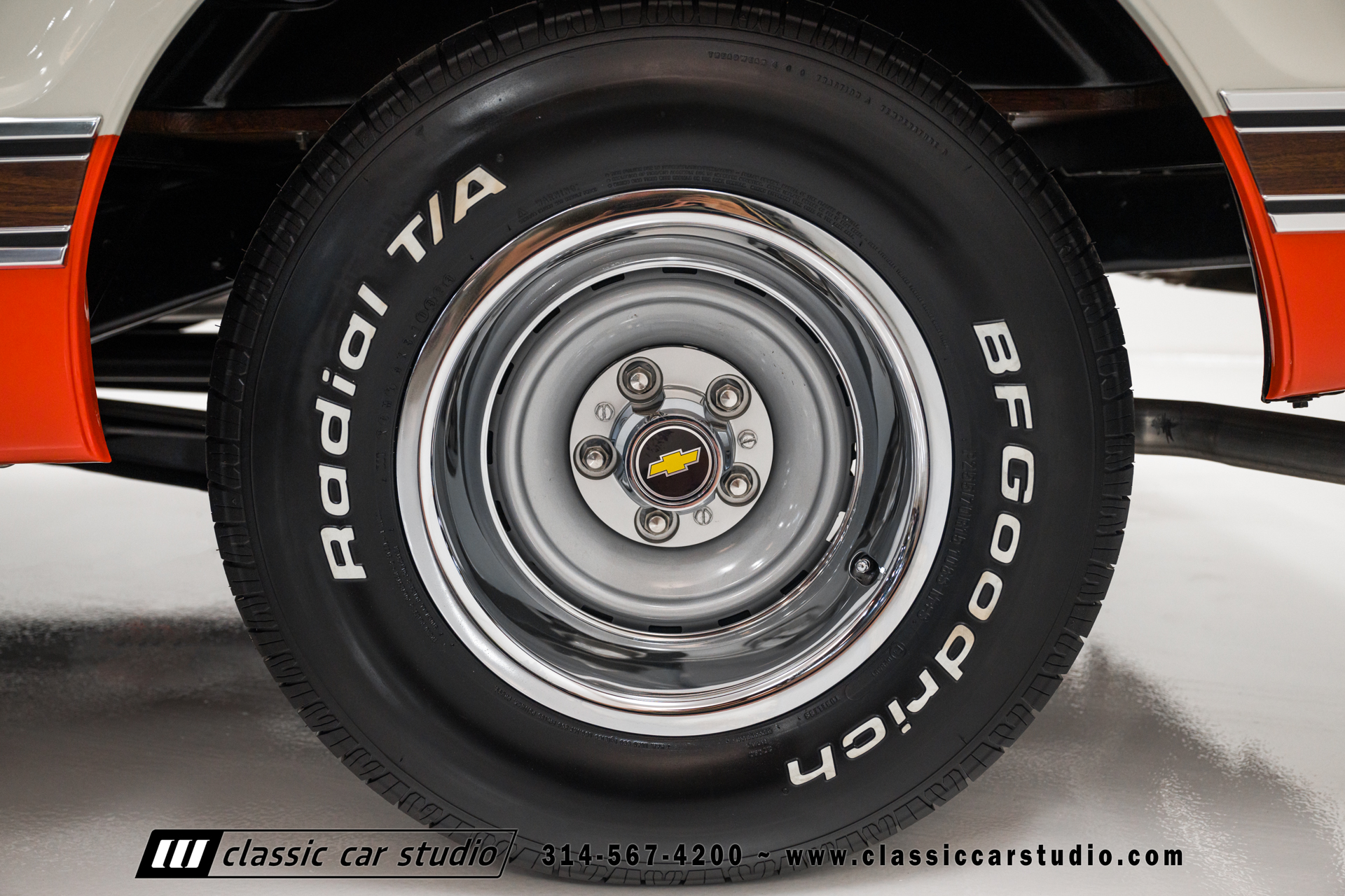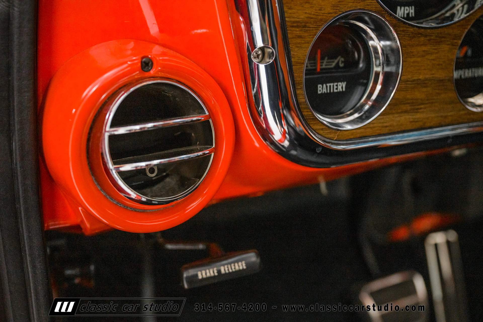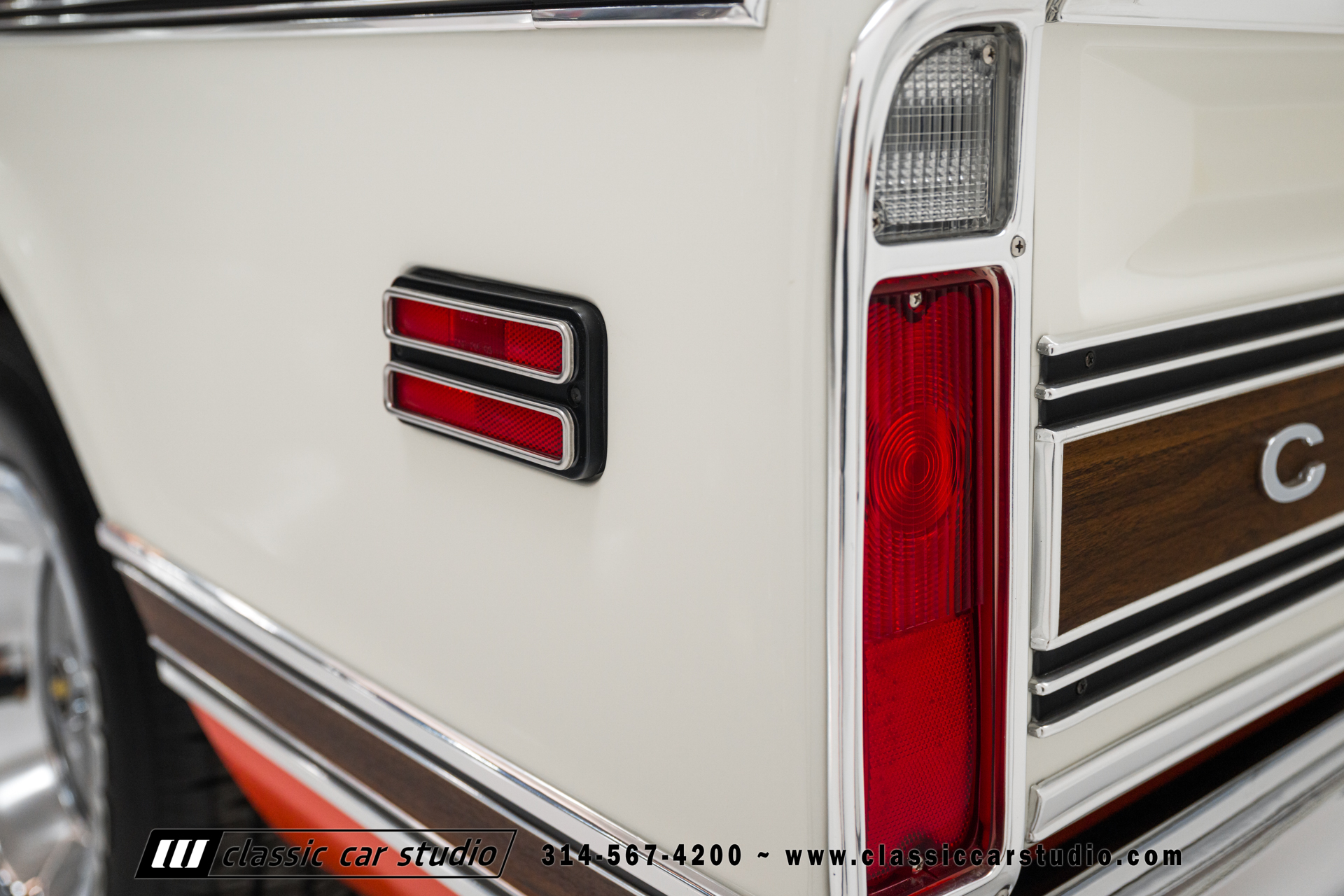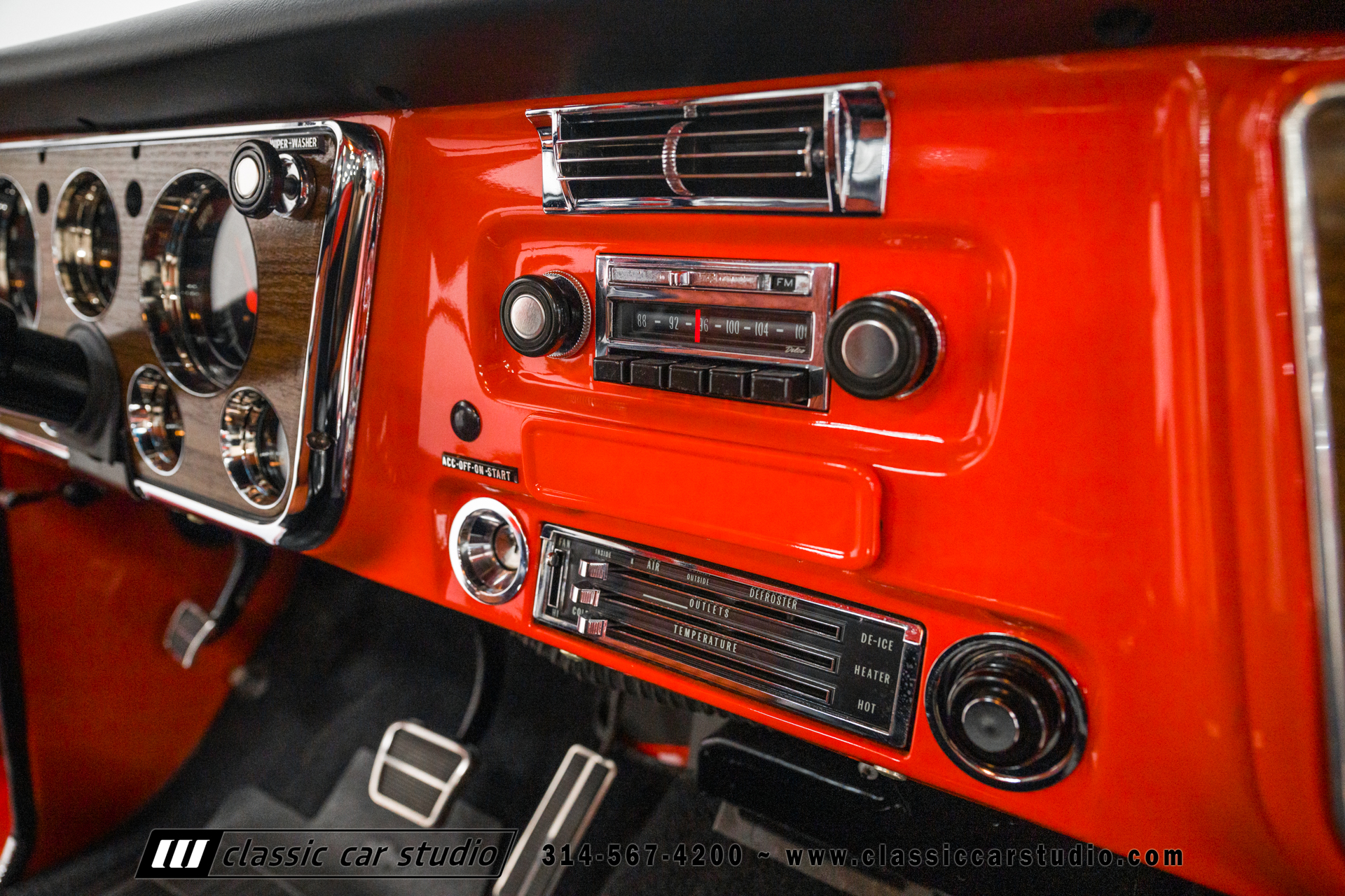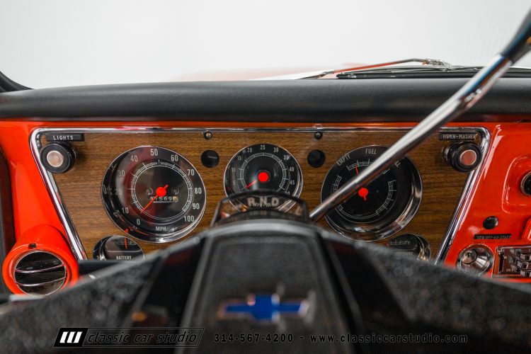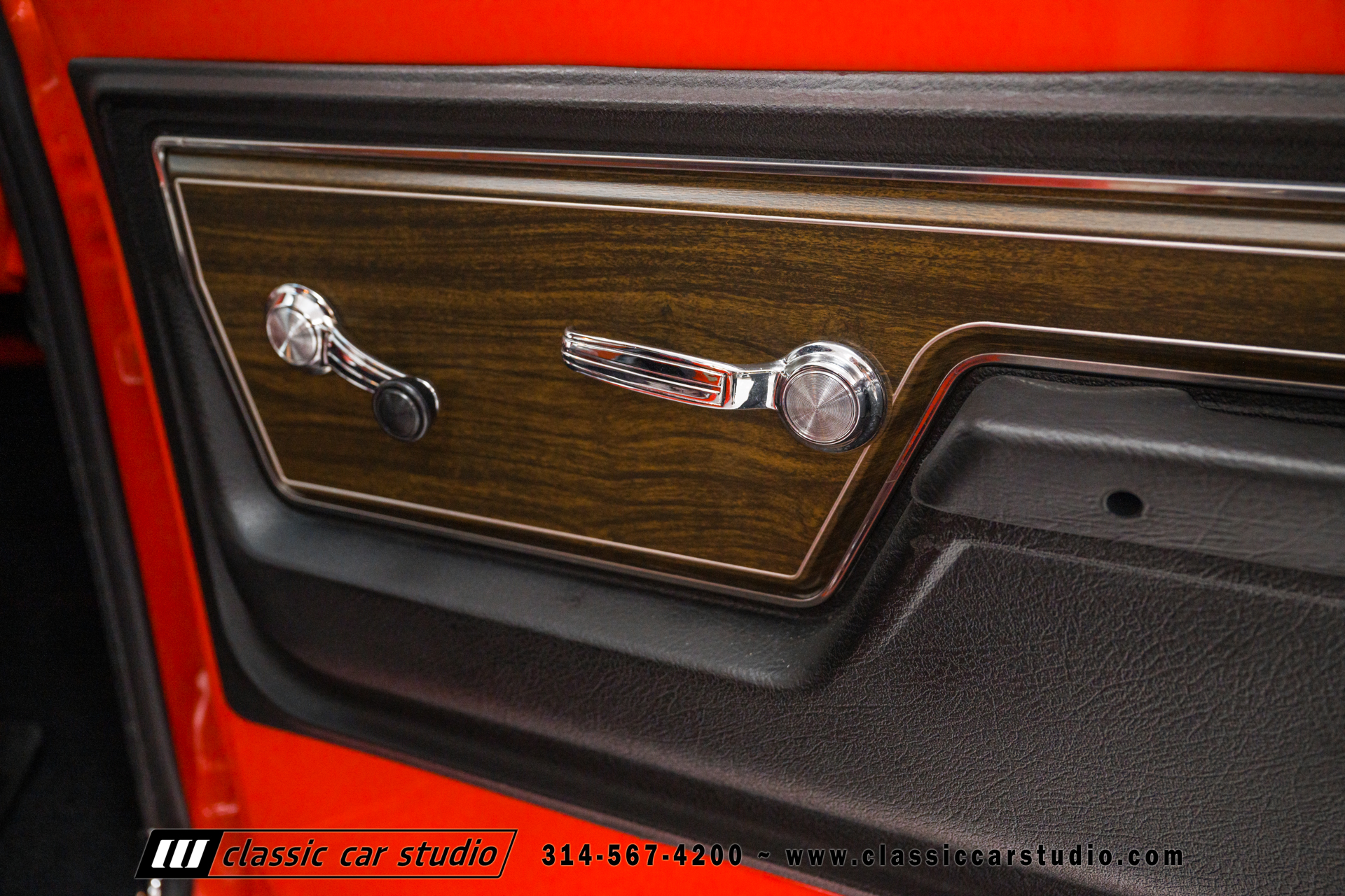 This 1972 Chevrolet C10 is a Fleetside pickup that was refurbished under prior ownership and is finished in orange and white over black vinyl and orange houndstooth cloth upholstery. Power is supplied by a 350ci V8 linked with a TH350 three-speed automatic transmission and a 12-bolt rear axle. Additional equipment includes Cheyenne Super badging, a wood-lined bed floor, air conditioning, power steering, power front disc brakes, 15″ Rally-style wheels, woodgrain trim accents, and a push-button AM/FM radio. This C10 was acquired by the selling dealer in June 2023 and is now offered in Missouri with a clean Kentucky title.