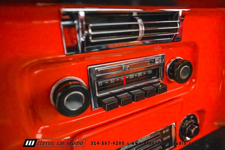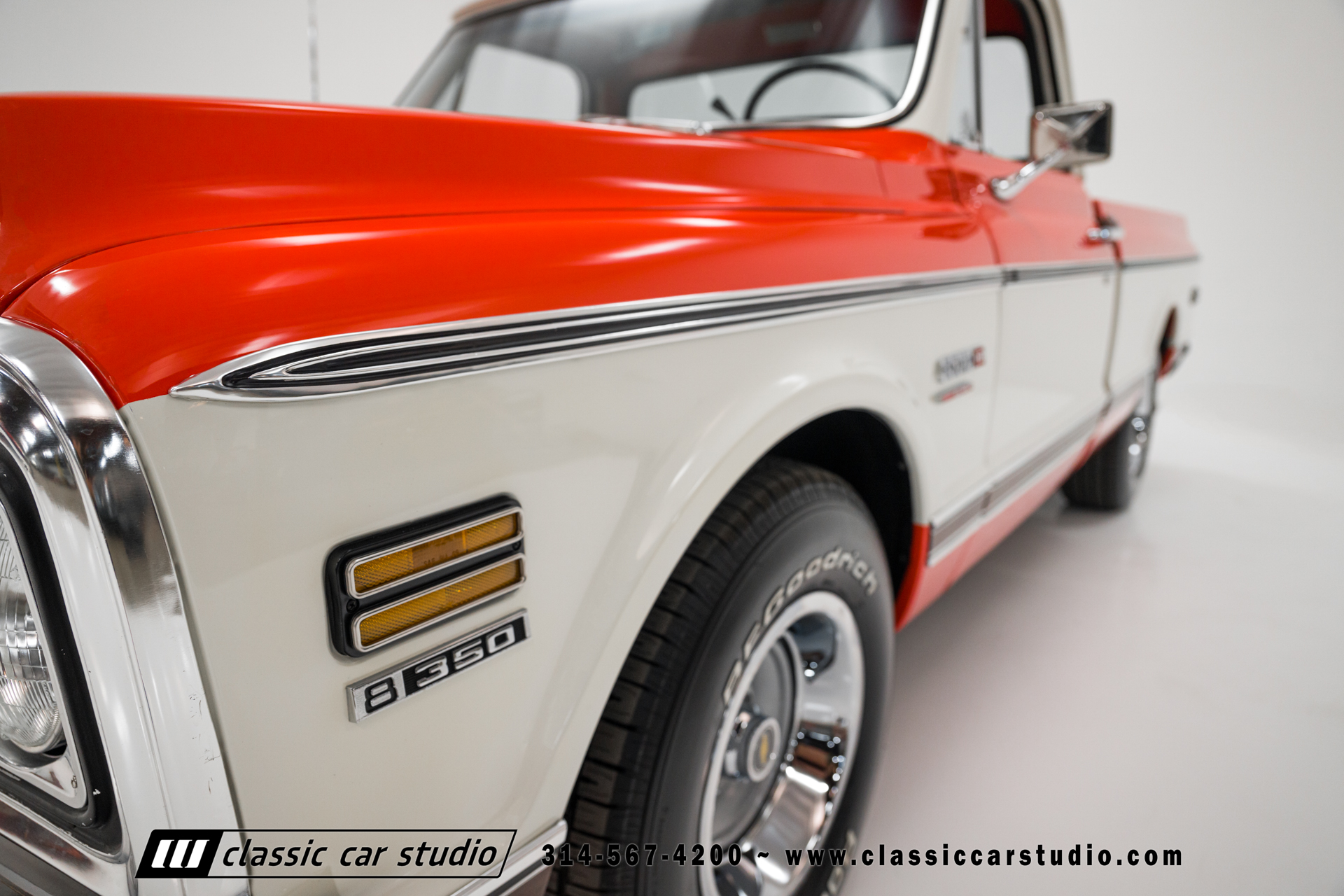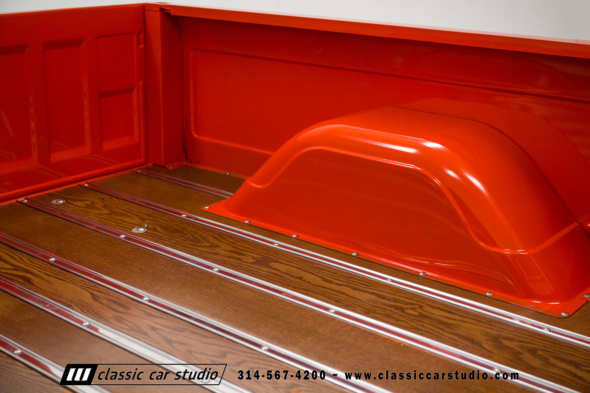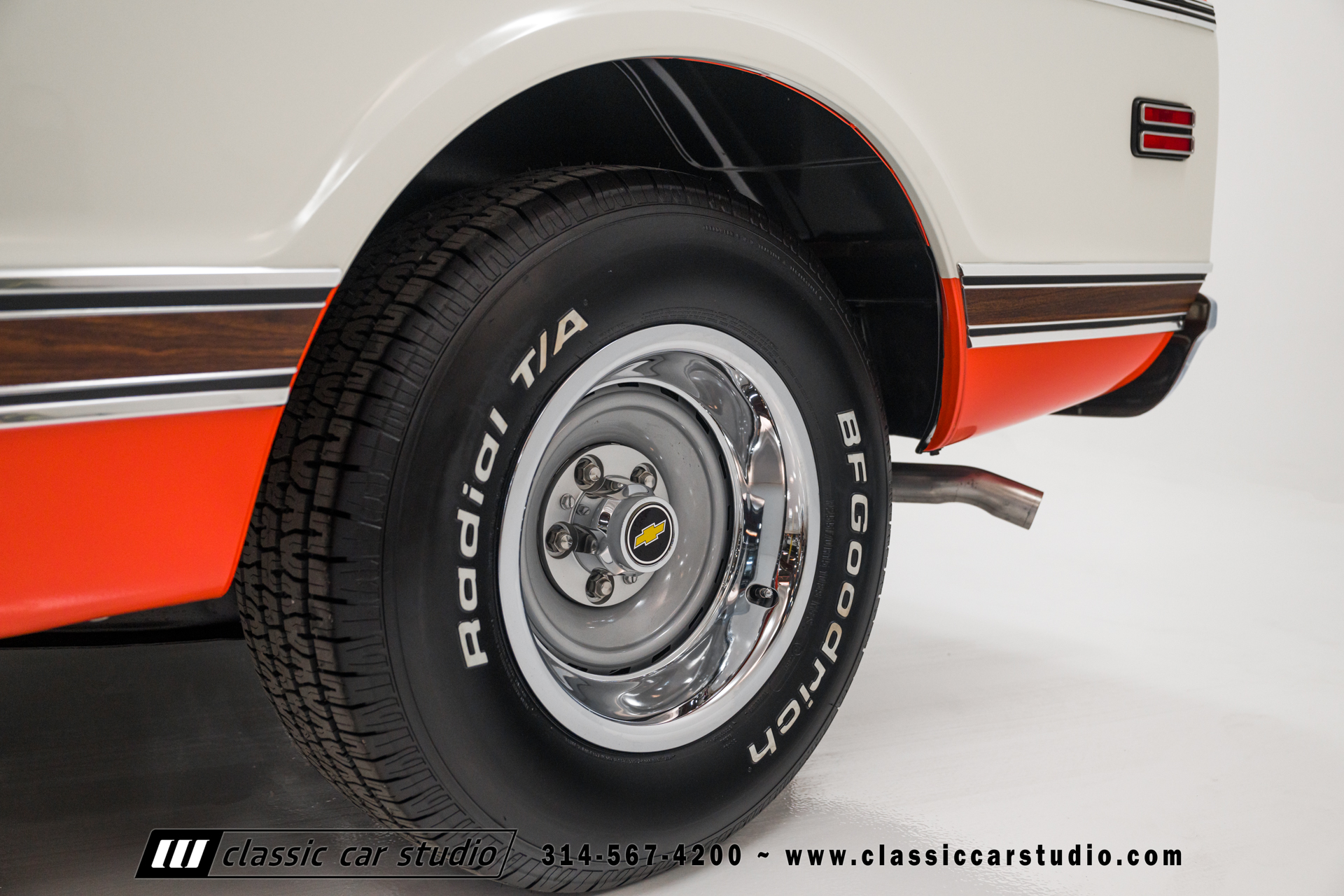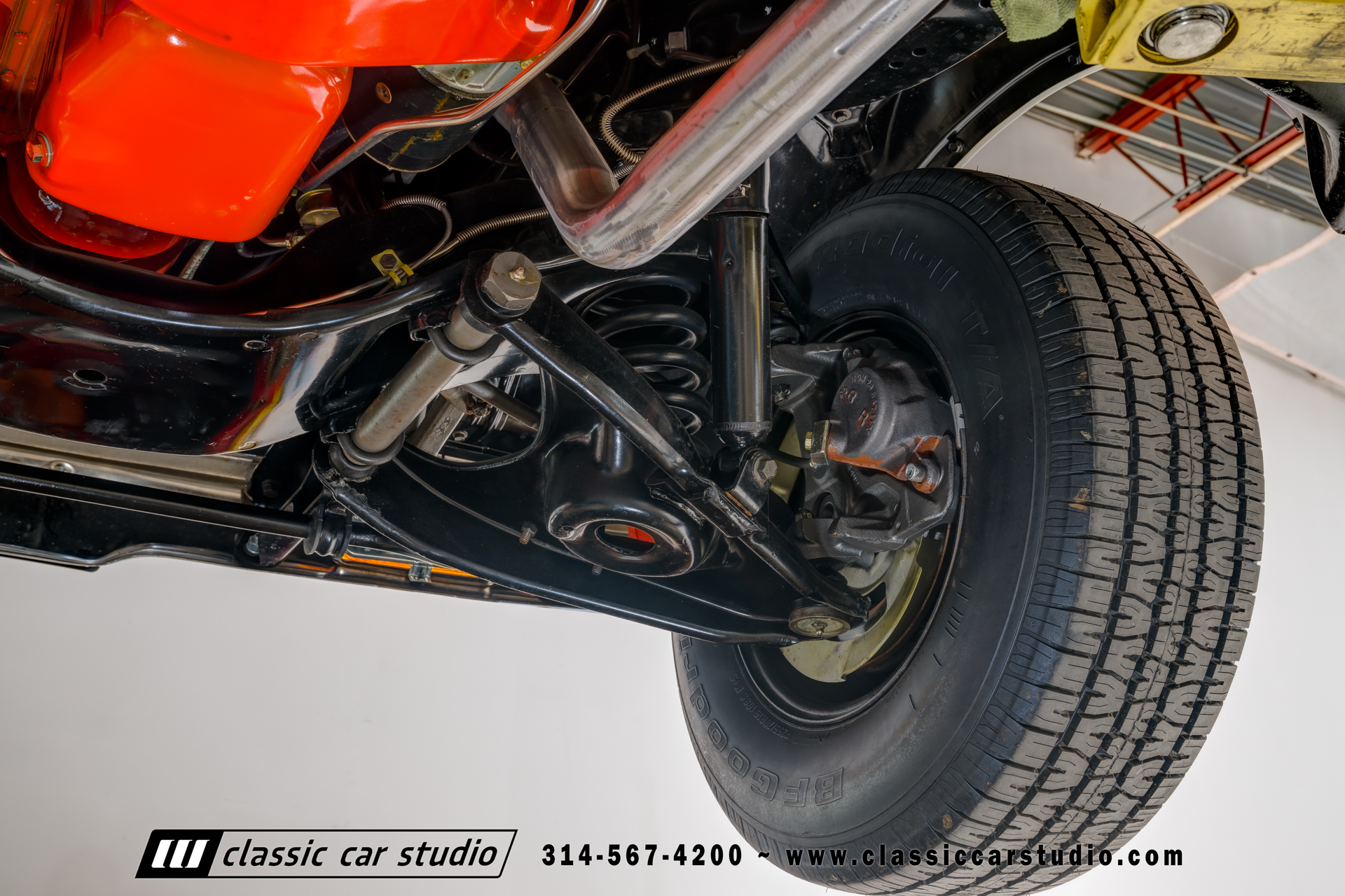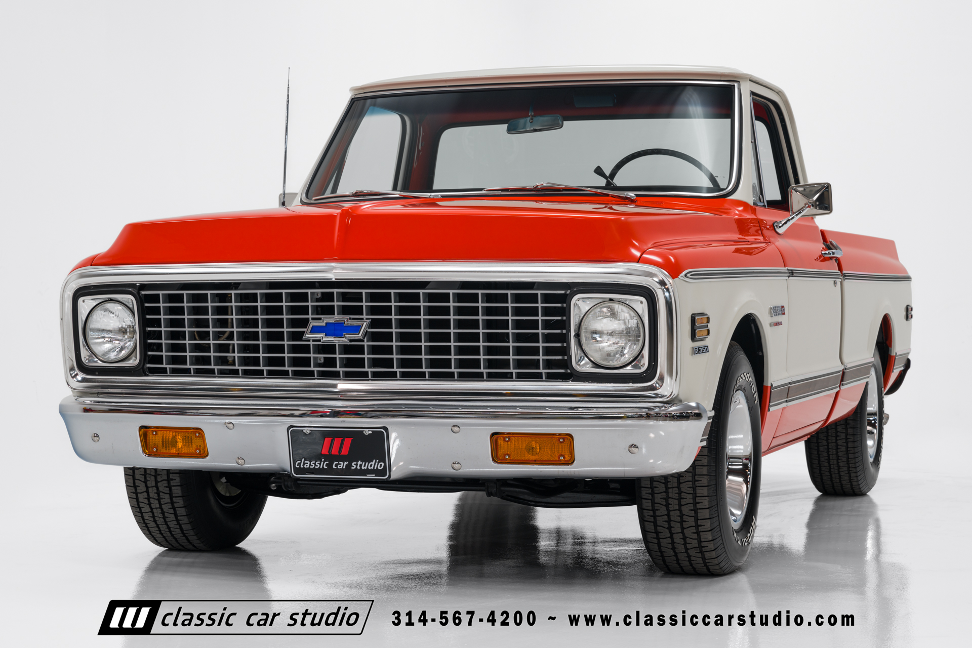 This 1972 Chevrolet C10 is a Fleetside pickup that was refurbished under prior ownership and is finished in orange and white over black vinyl and orange houndstooth cloth upholstery. Power is supplied by a 350ci V8 linked with a TH350 three-speed automatic transmission and a 12-bolt rear axle. Additional equipment includes Cheyenne Super badging, a wood-lined bed floor, air conditioning, power steering, power front disc brakes, 15″ Rally-style wheels, woodgrain trim accents, and a push-button AM/FM radio. This C10 was acquired by the selling dealer in June 2023 and is now offered in Missouri with a clean Kentucky title.