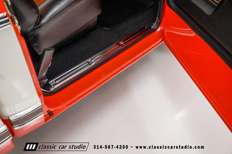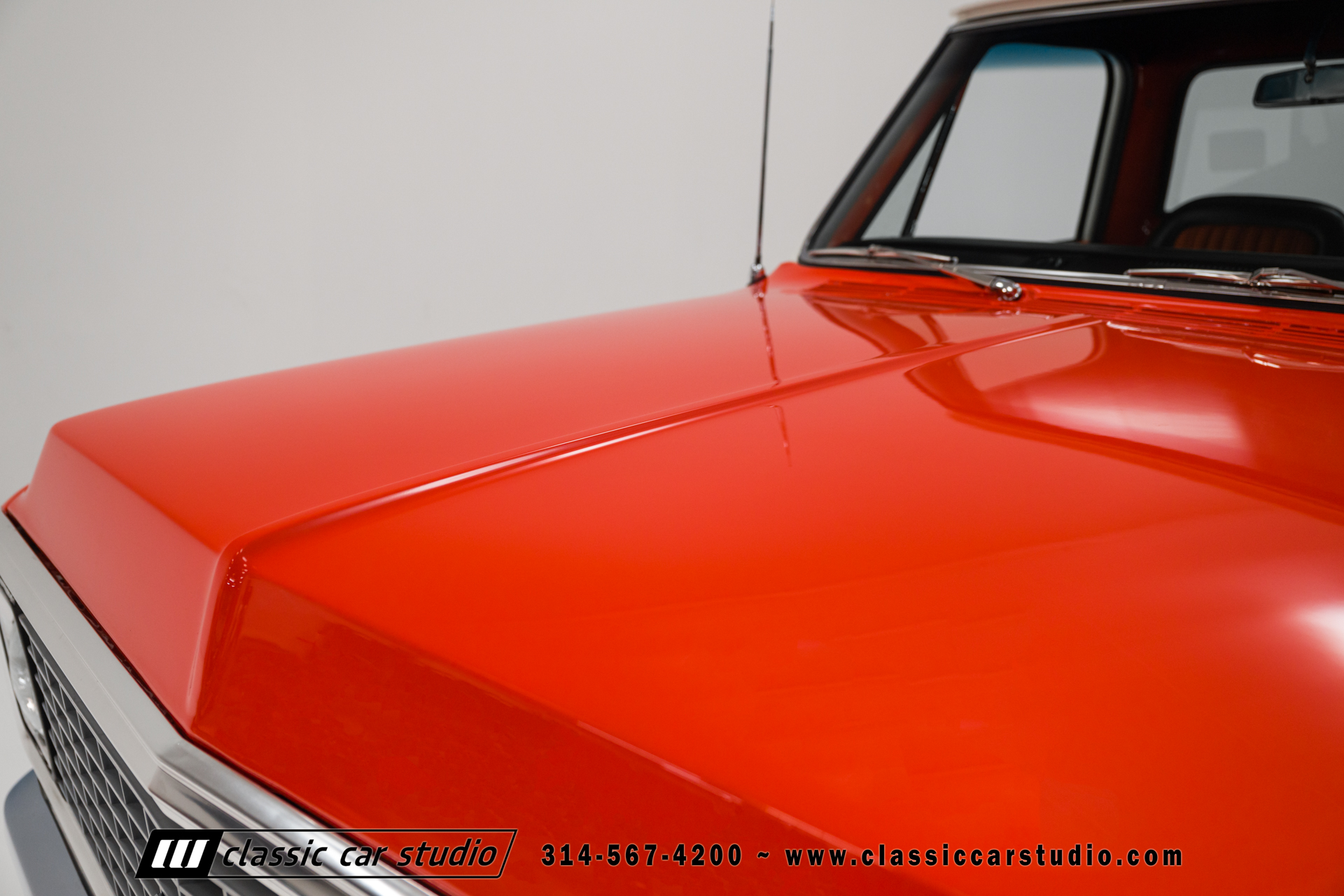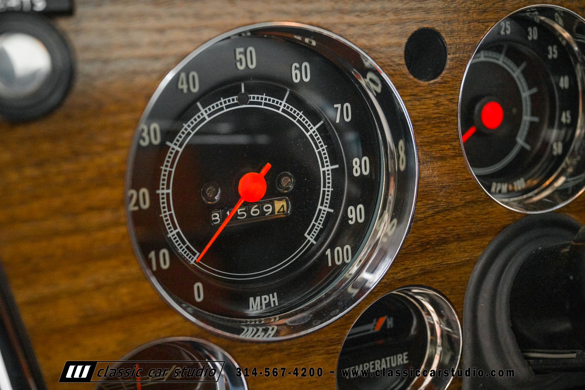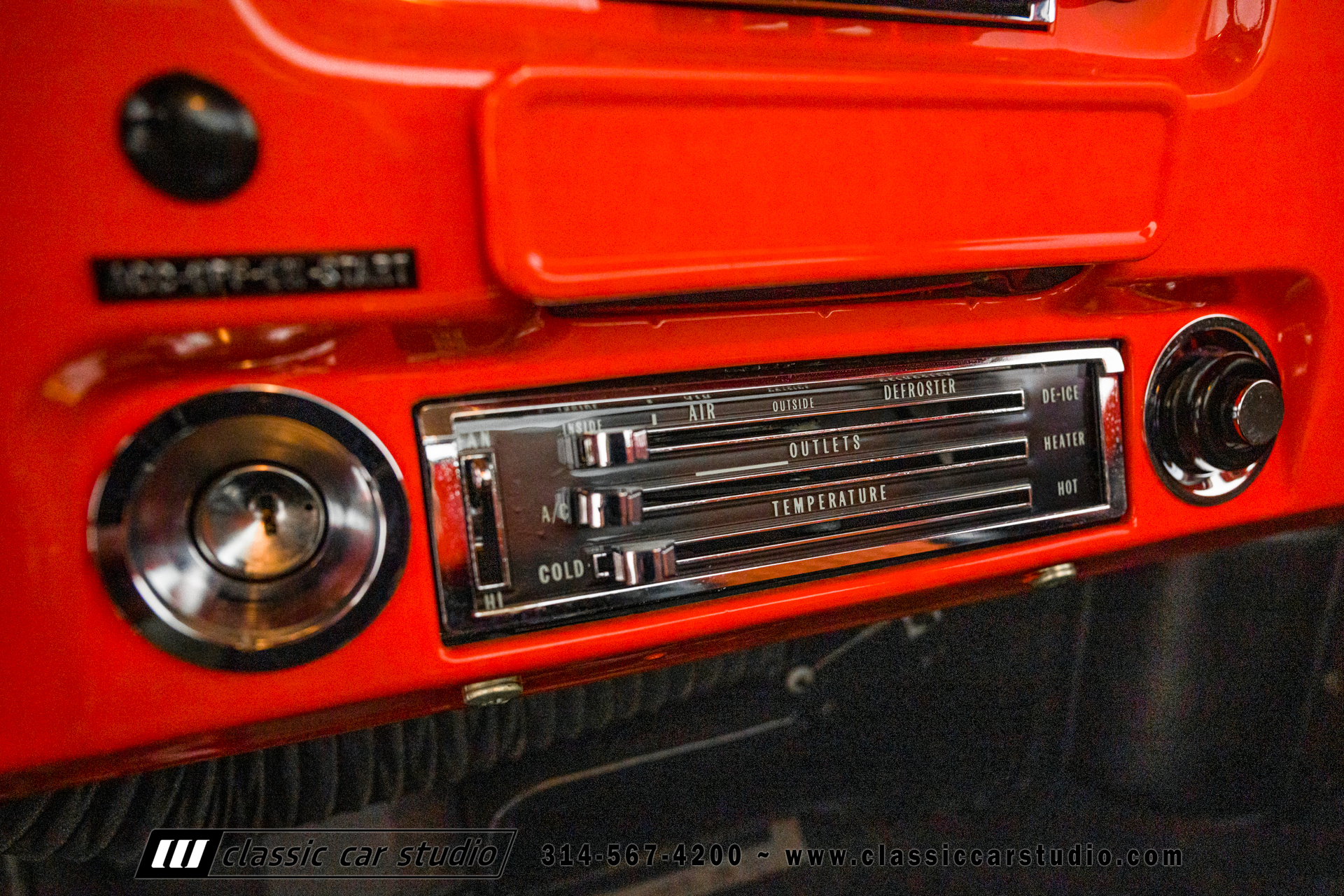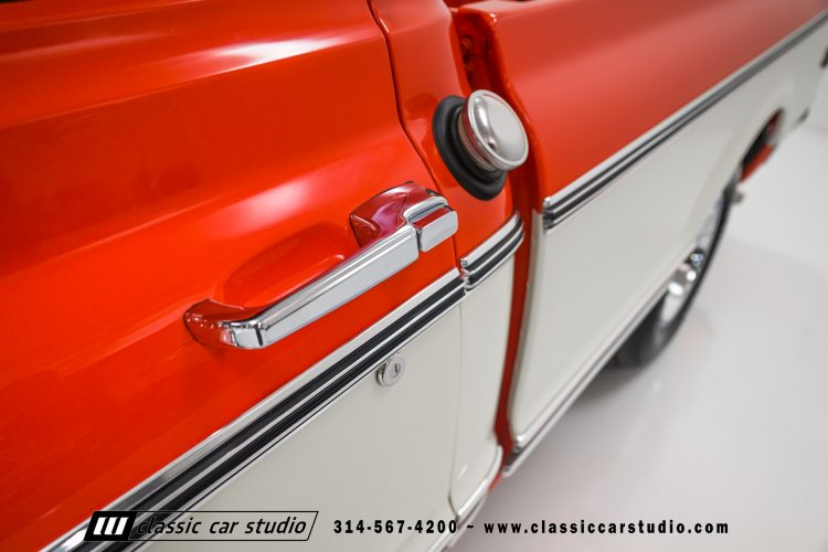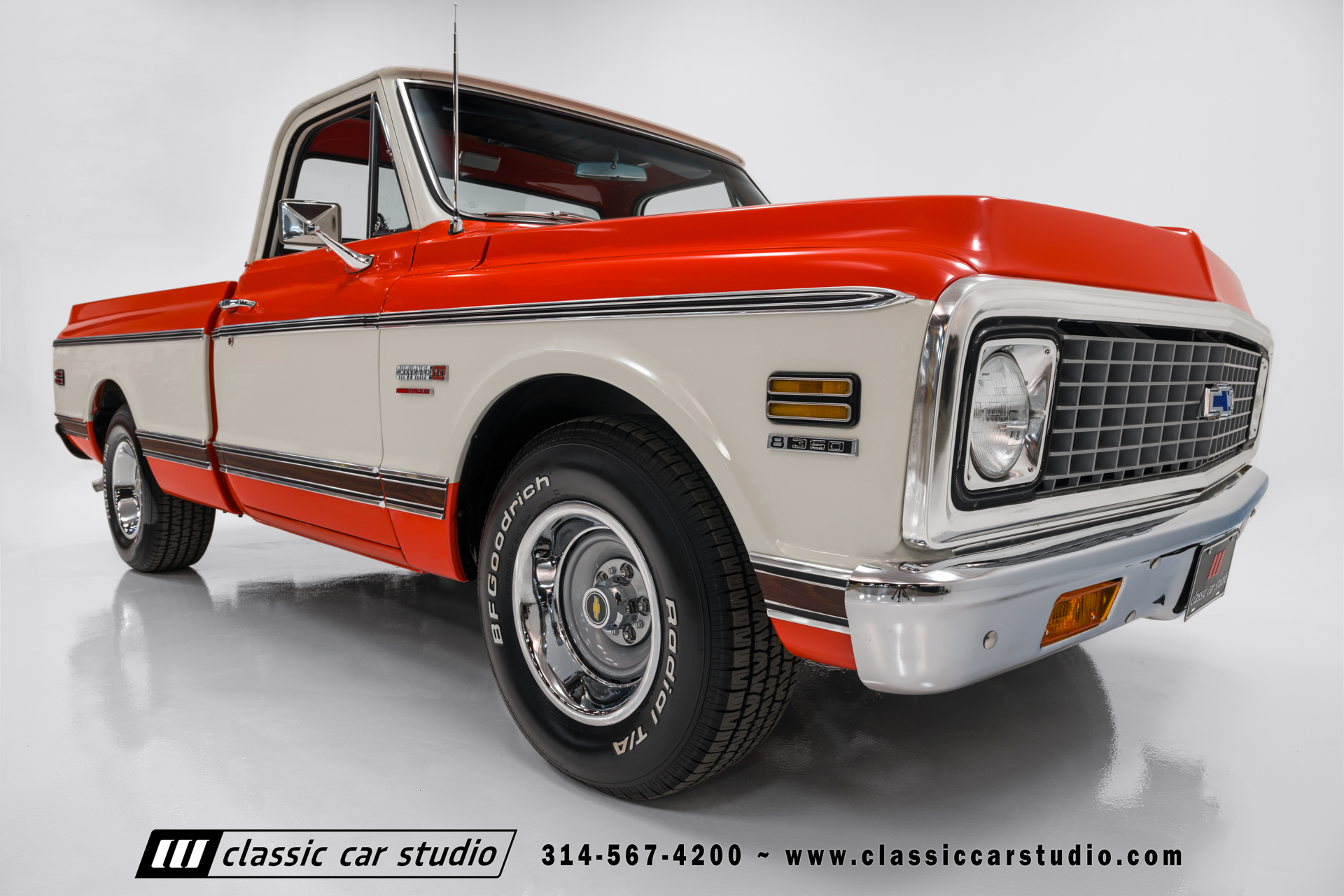This 1972 Chevrolet C10 is a Fleetside pickup that was refurbished under prior ownership and is finished in orange and white over black vinyl and orange houndstooth cloth upholstery. Power is supplied by a 350ci V8 linked with a TH350 three-speed automatic transmission and a 12-bolt rear axle. Additional equipment includes Cheyenne Super badging, a wood-lined bed floor, air conditioning, power steering, power front disc brakes, 15″ Rally-style wheels, woodgrain trim accents, and a push-button AM/FM radio. This C10 was acquired by the selling dealer in June 2023 and is now offered in Missouri with a clean Kentucky title.