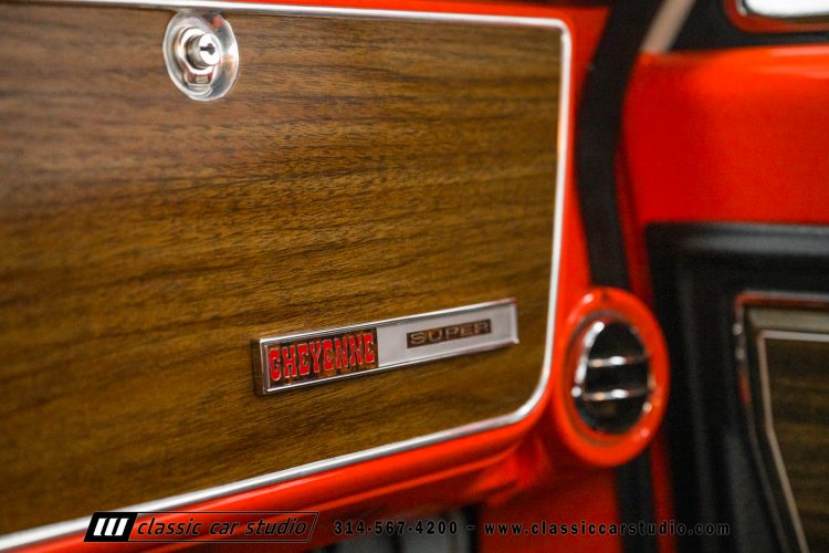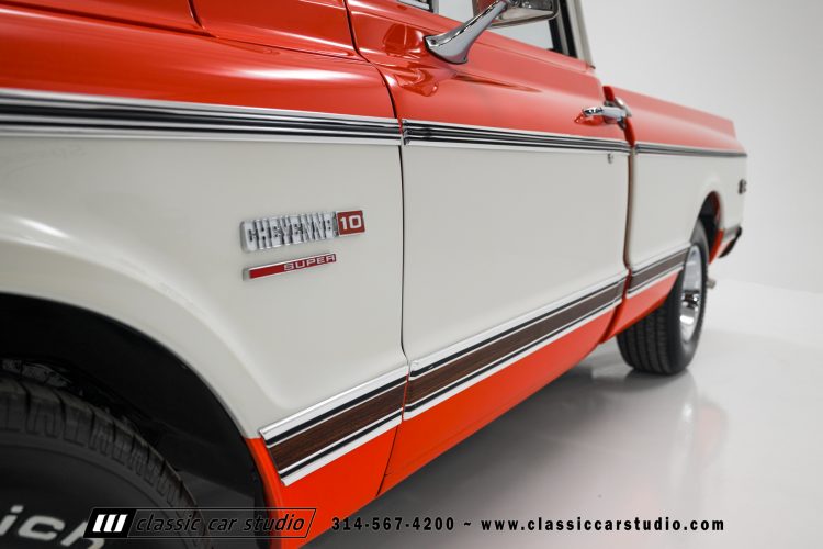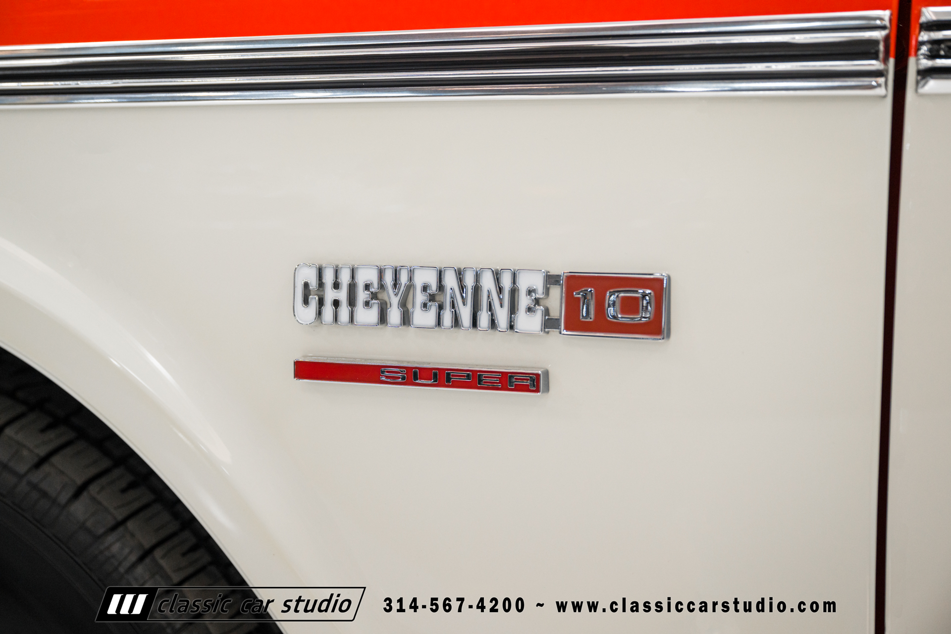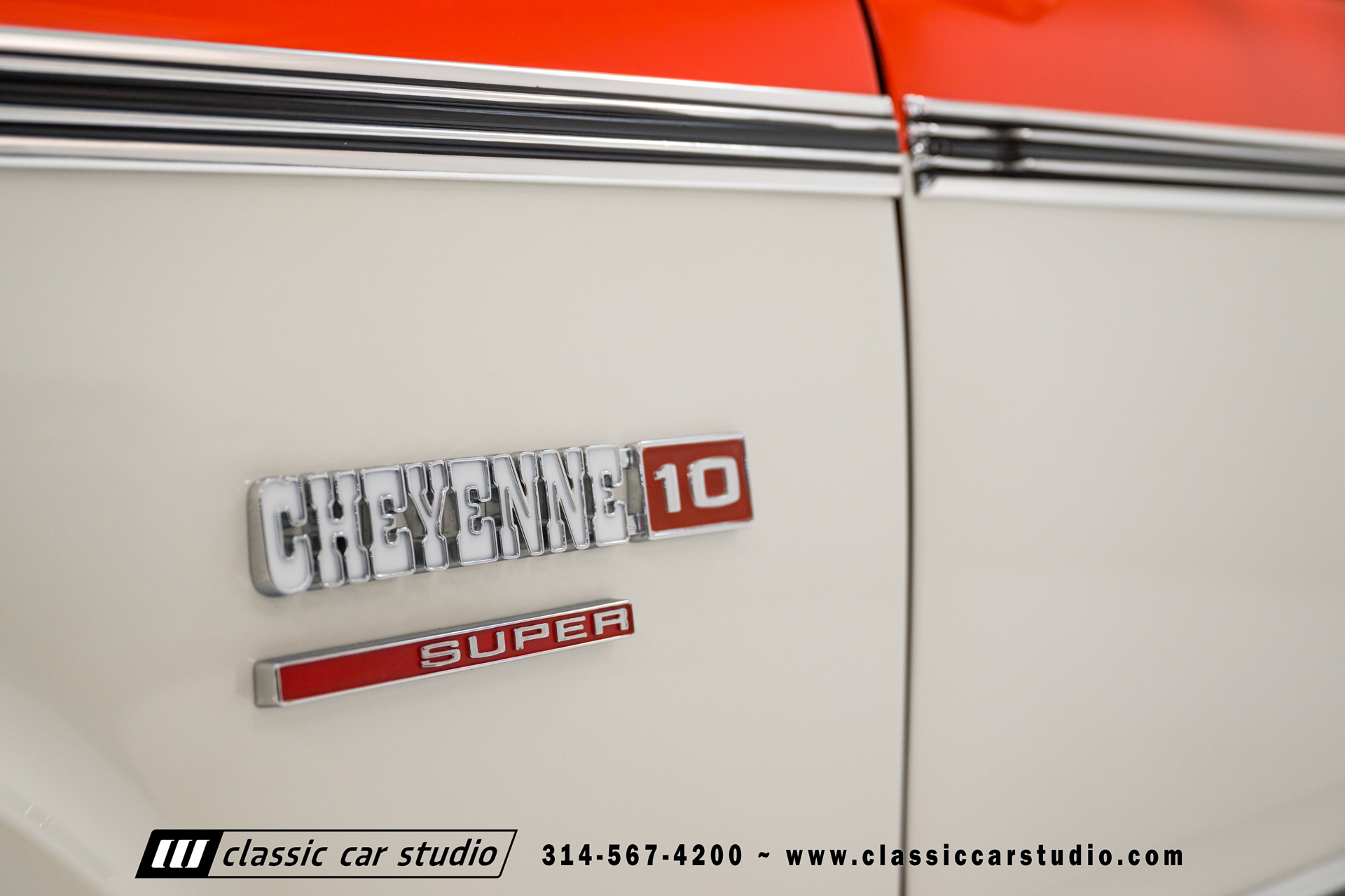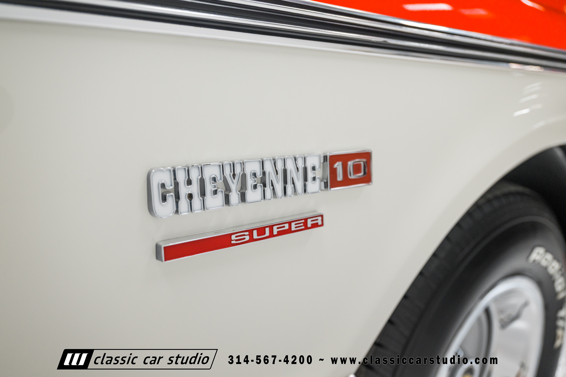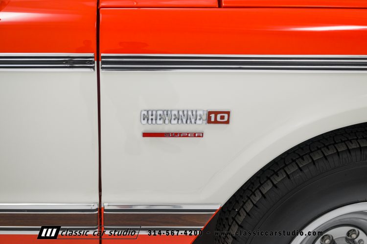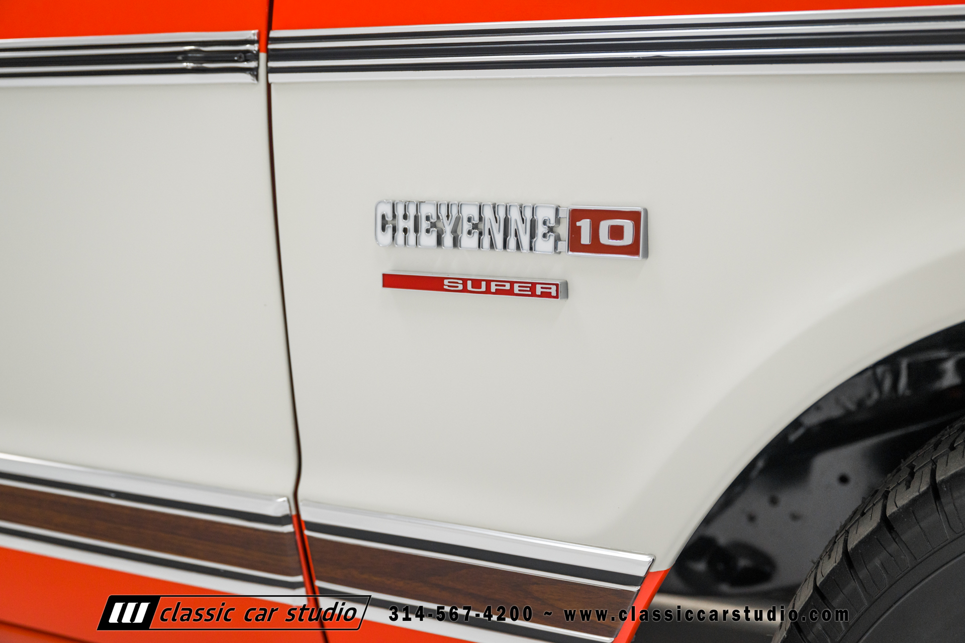 The body is finished in orange and white and was repainted during the aforementioned refurbishment. Exterior details include a wood-lined bed floor, polished bed runners, a fender-mounted antenna, Cheyenne Super badging, chrome bumpers, faux woodgrain trim accents, polished side mirrors, and dual exhaust outlets that exit behind the rear wheels.