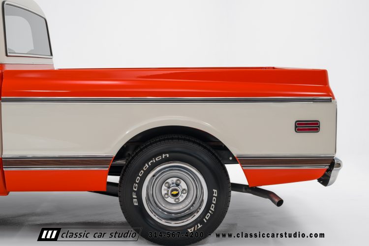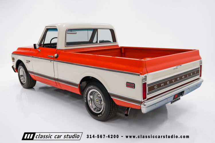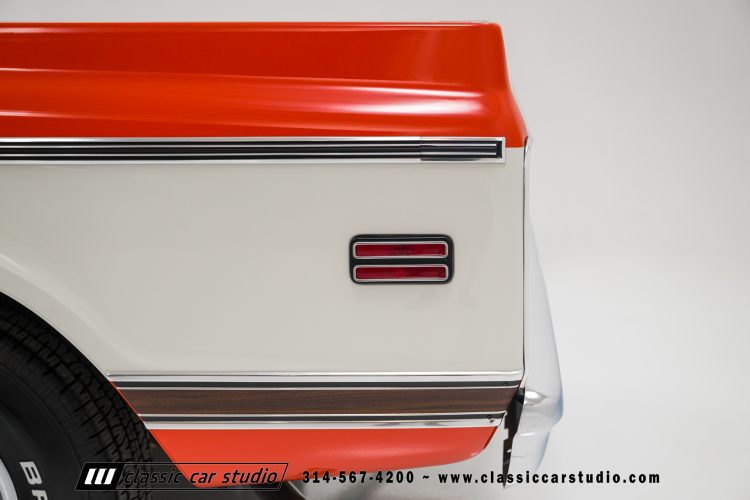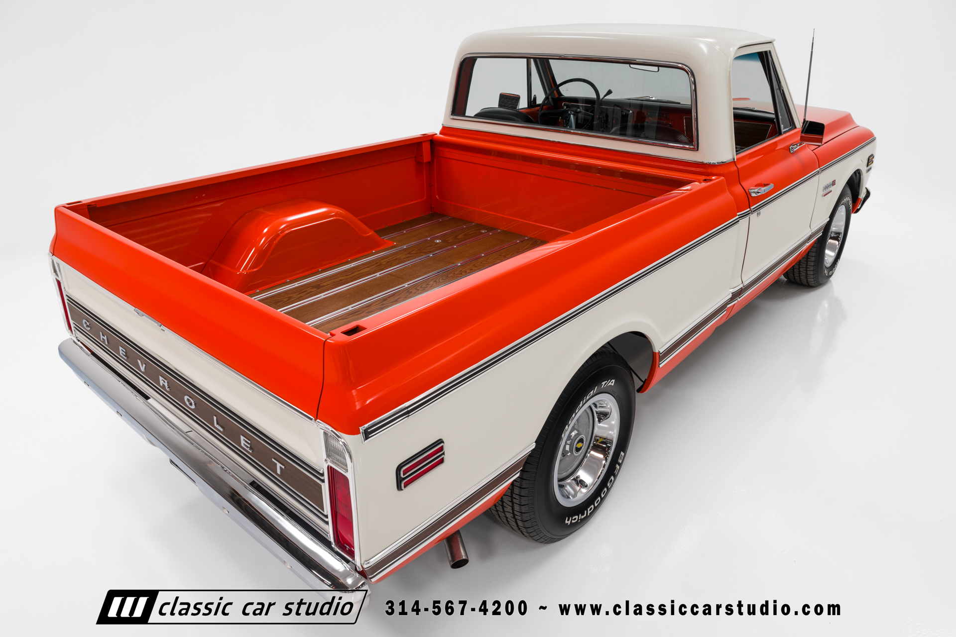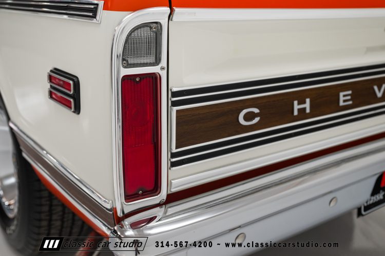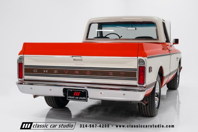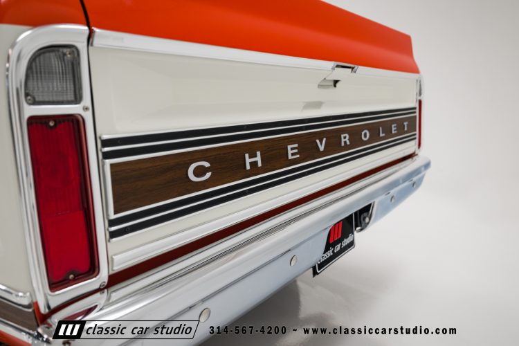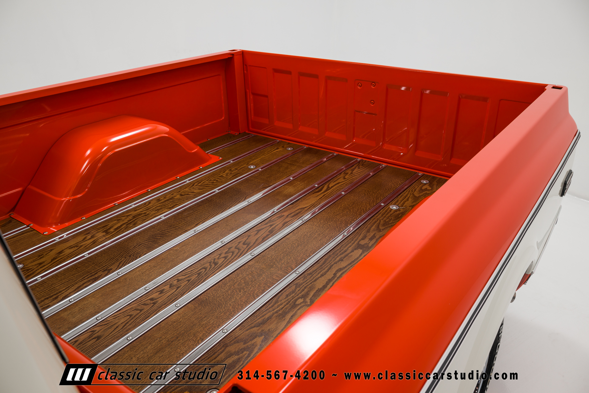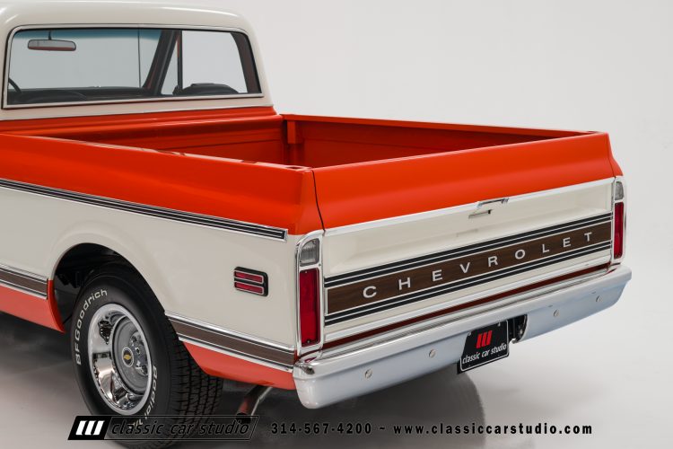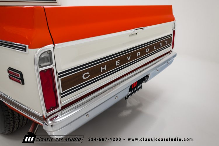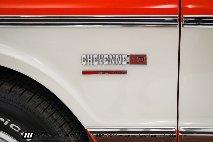 The body is finished in orange and white and was repainted during the aforementioned refurbishment. Exterior details include a wood-lined bed floor, polished bed runners, a fender-mounted antenna, Cheyenne Super badging, chrome bumpers, faux woodgrain trim accents, polished side mirrors, and dual exhaust outlets that exit behind the rear wheels.