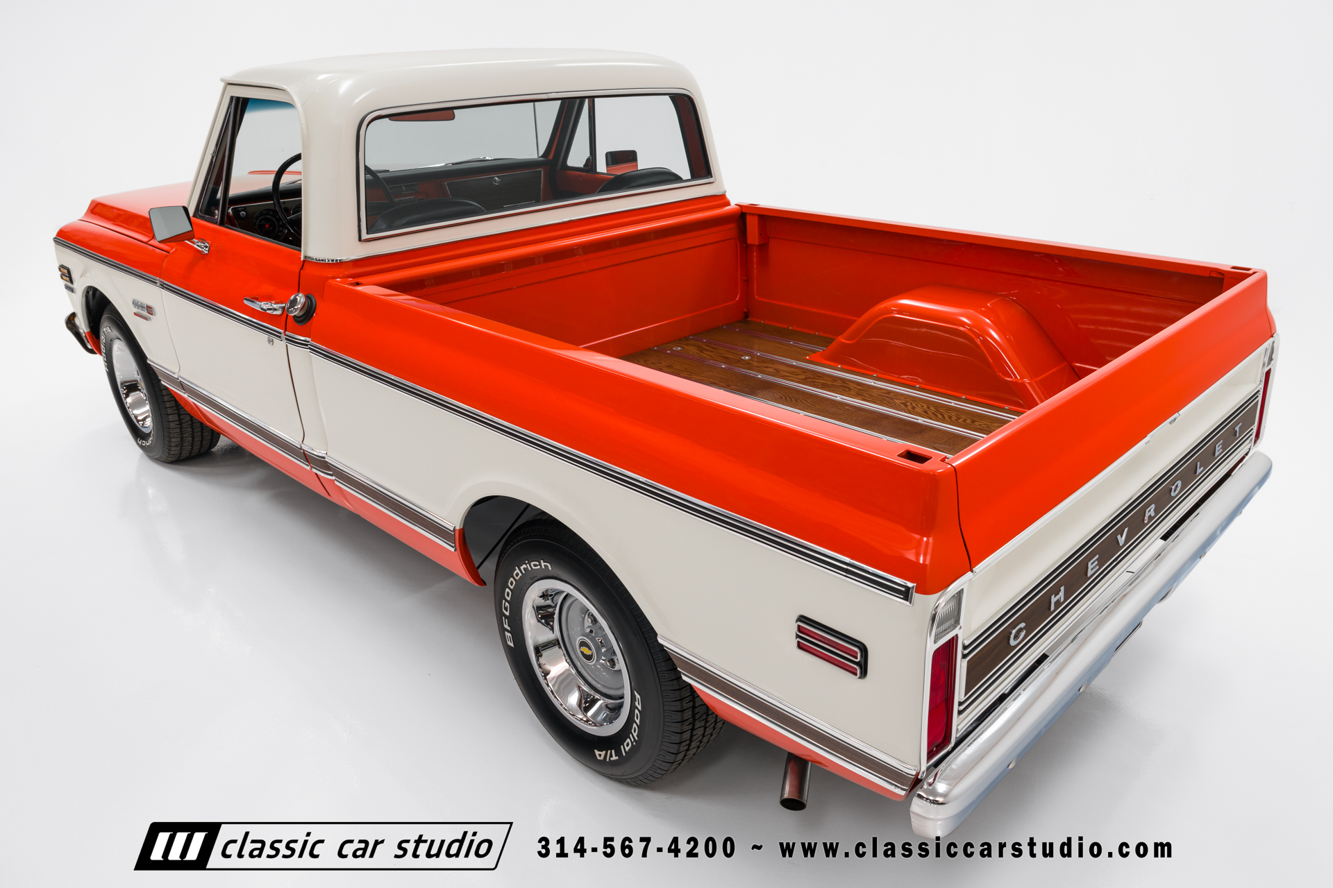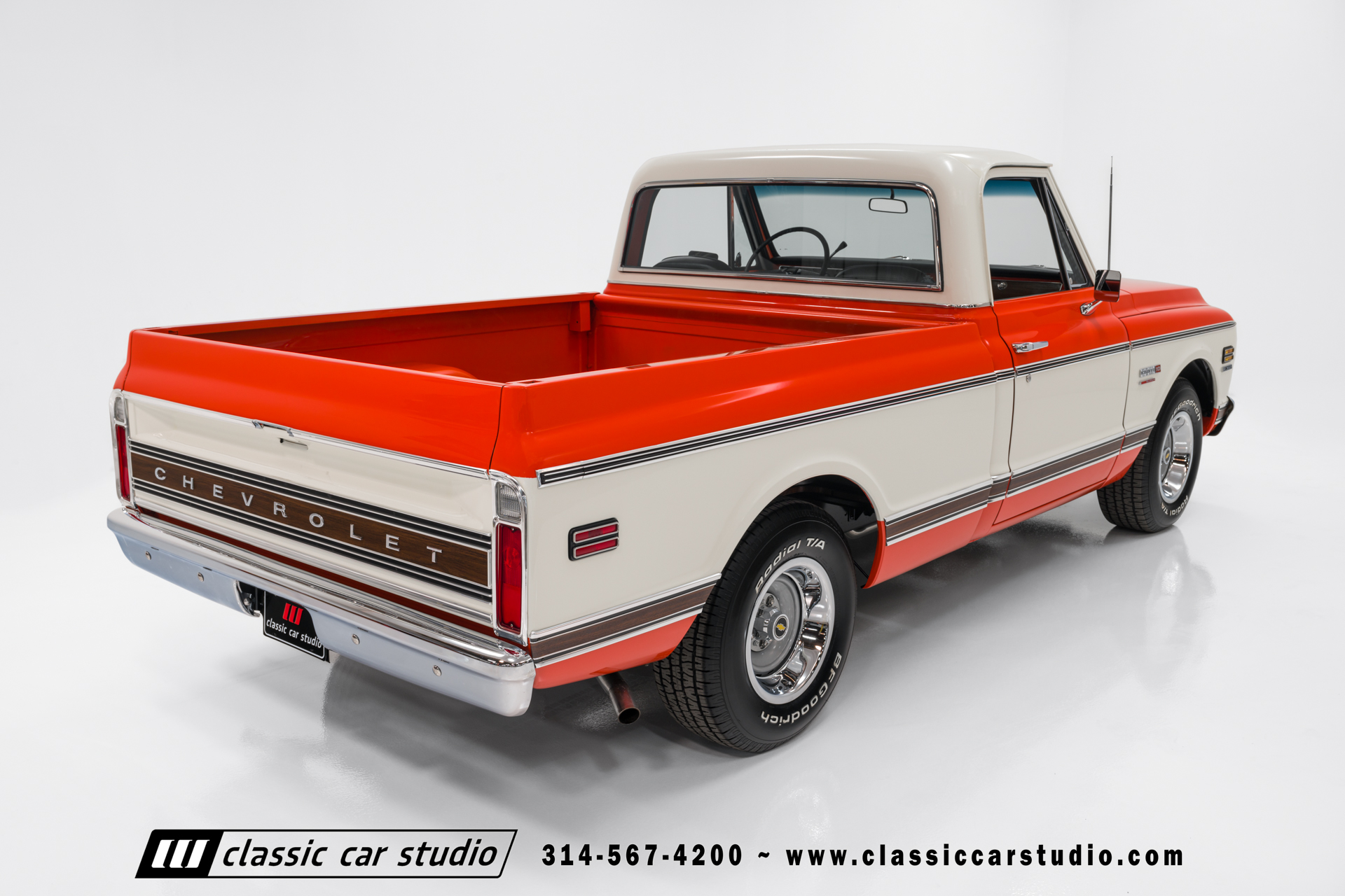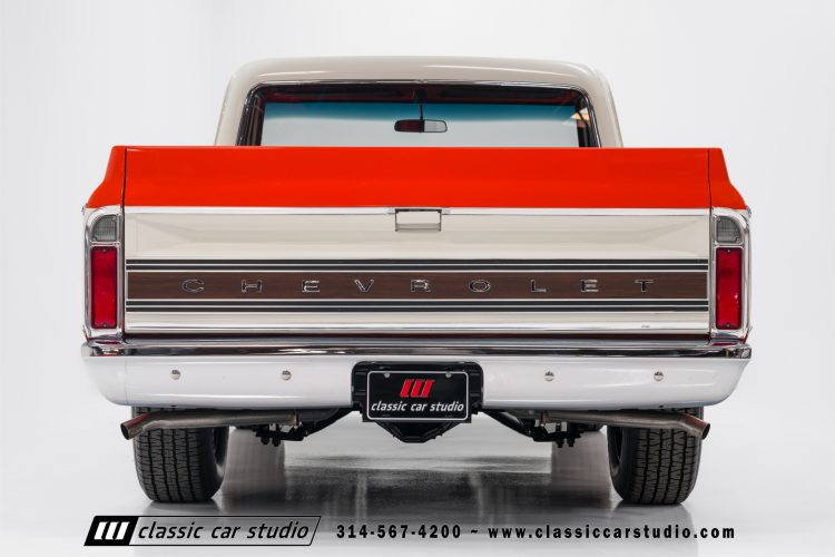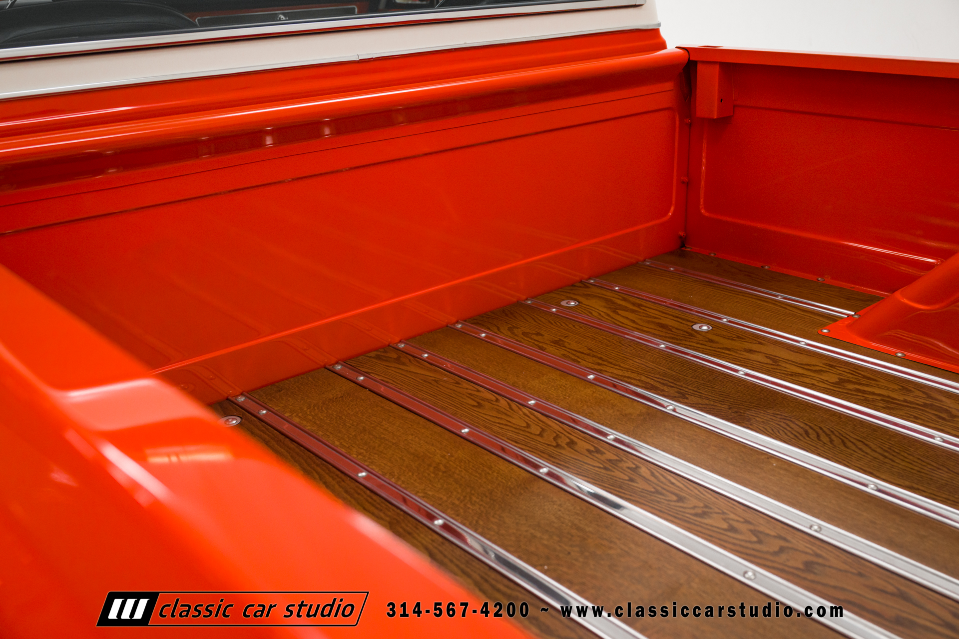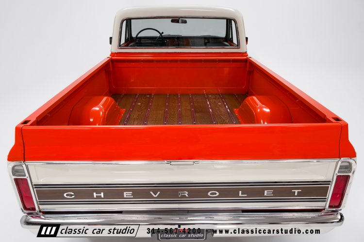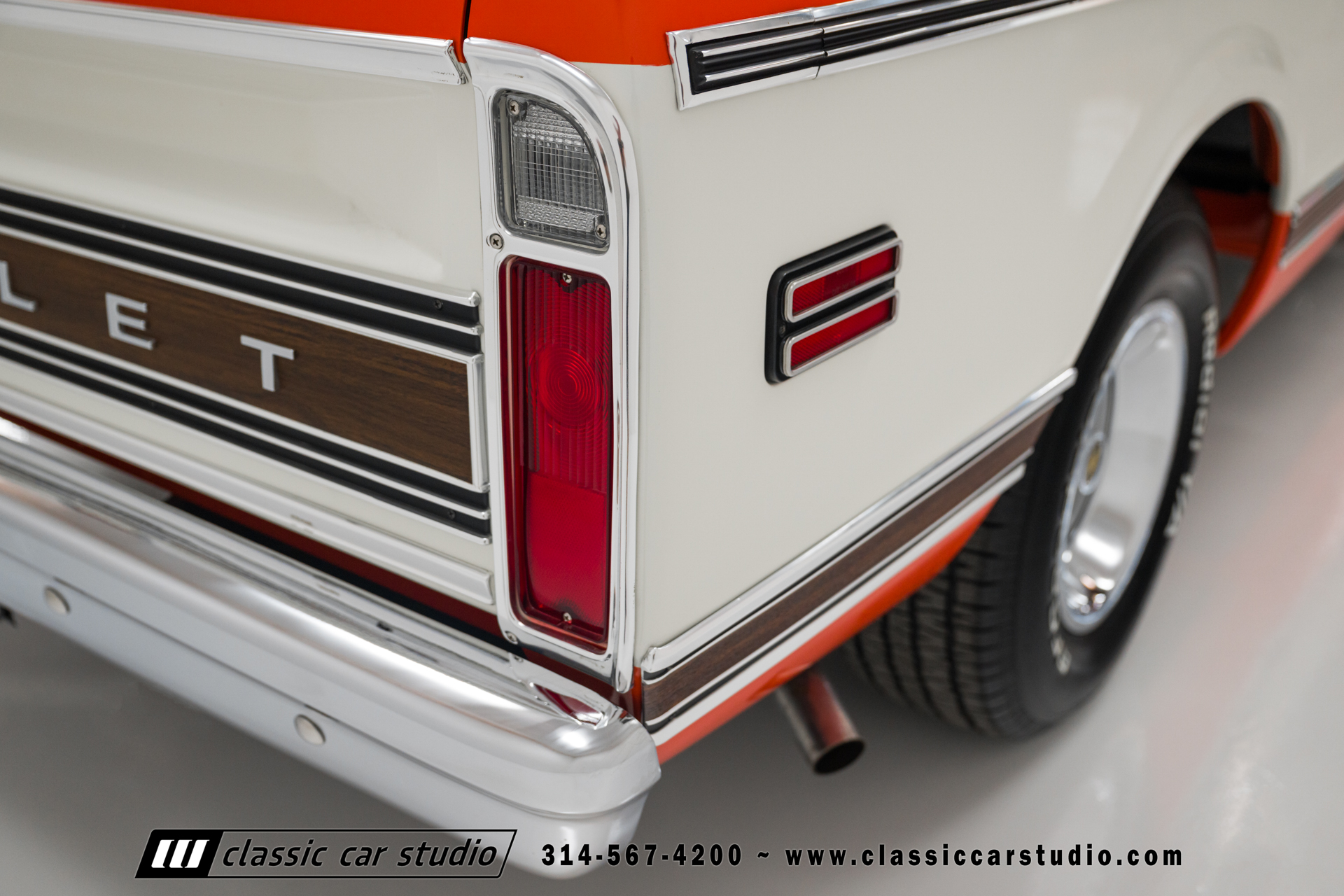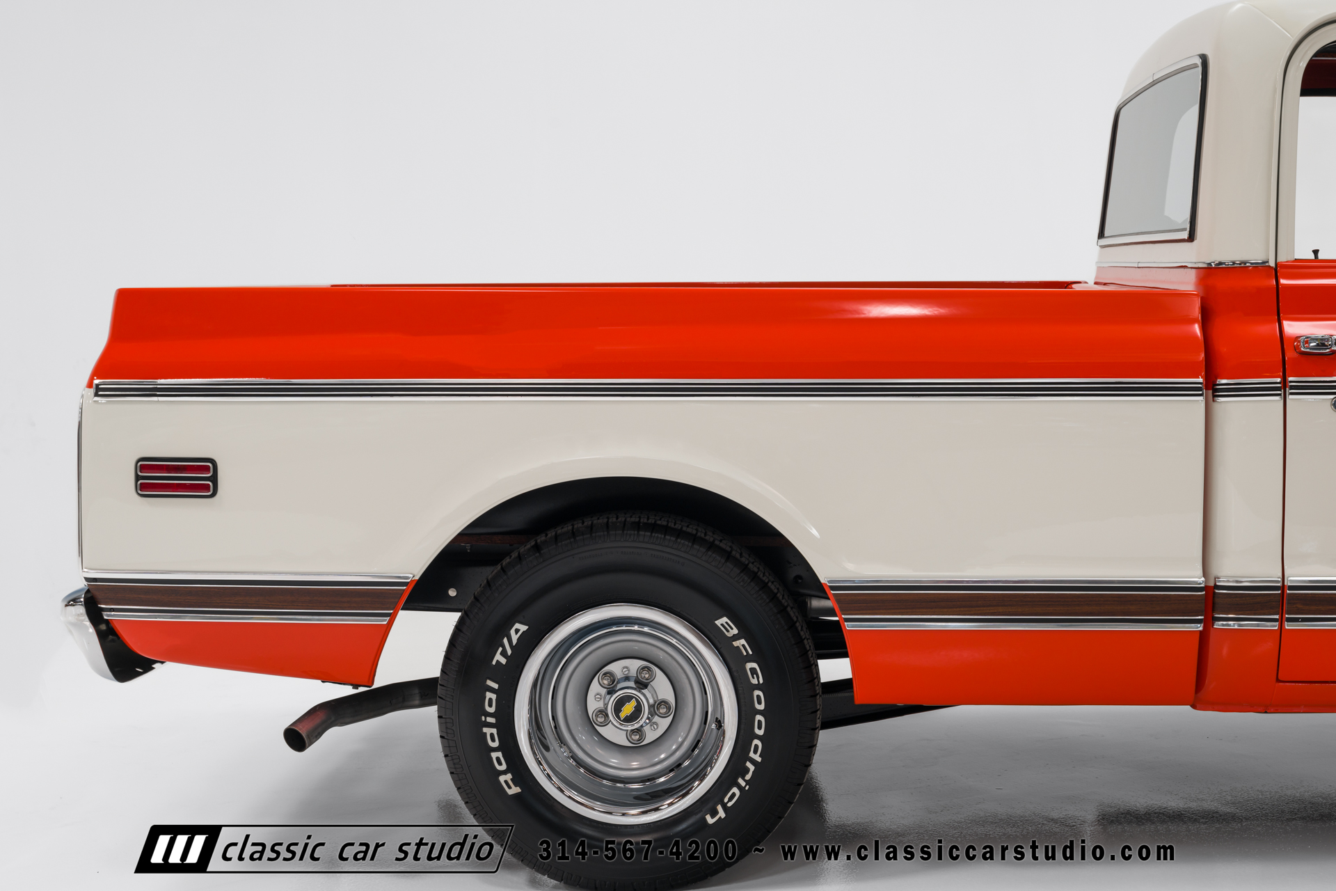 The body is finished in orange and white and was repainted during the aforementioned refurbishment. Exterior details include a wood-lined bed floor, polished bed runners, a fender-mounted antenna, Cheyenne Super badging, chrome bumpers, faux woodgrain trim accents, polished side mirrors, and dual exhaust outlets that exit behind the rear wheels.