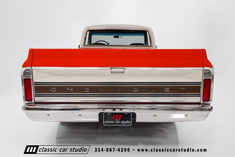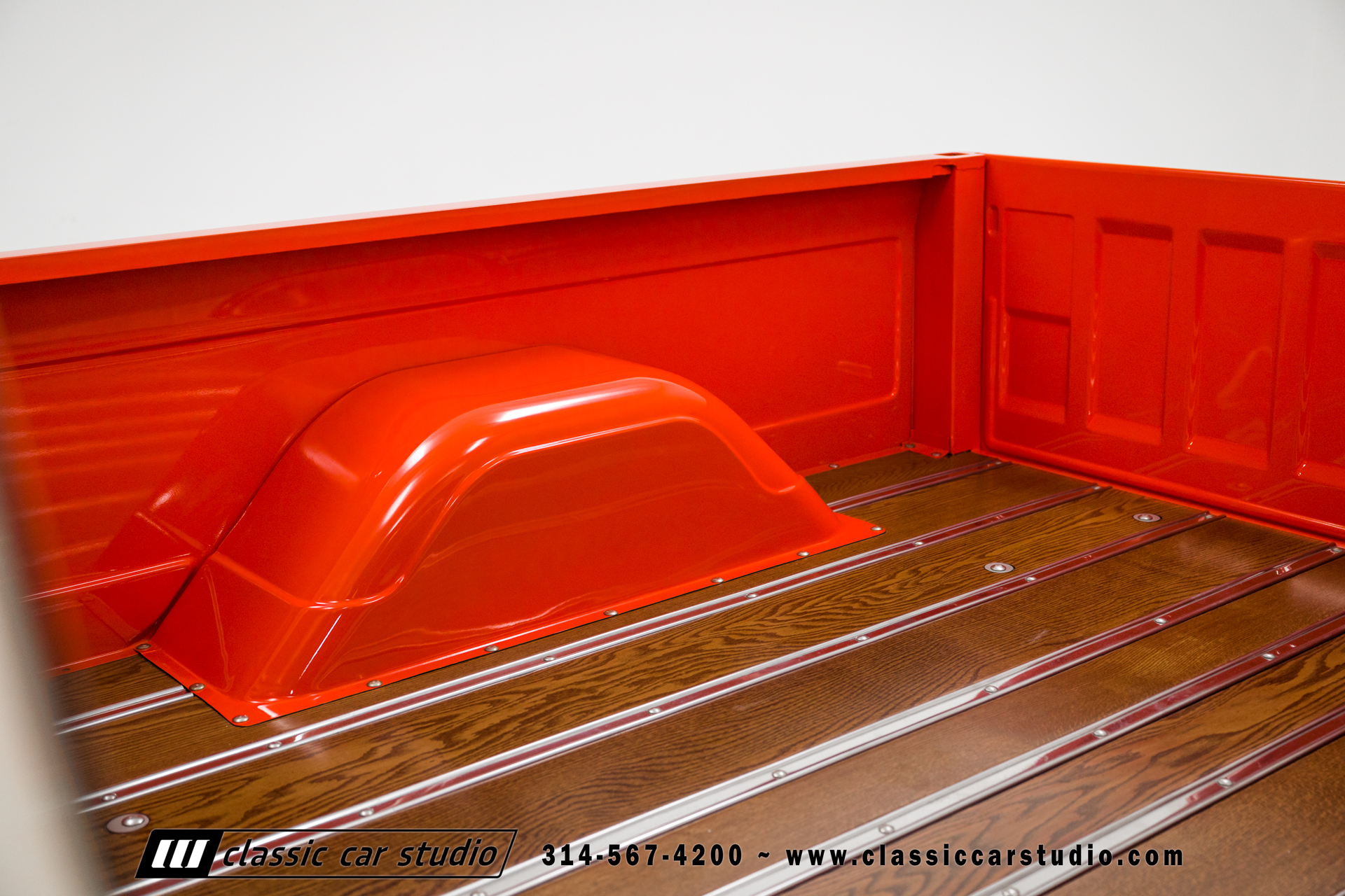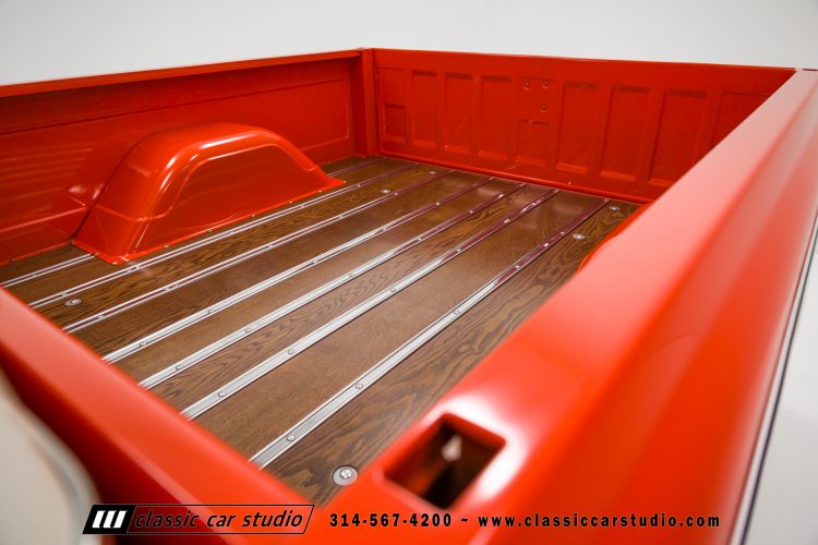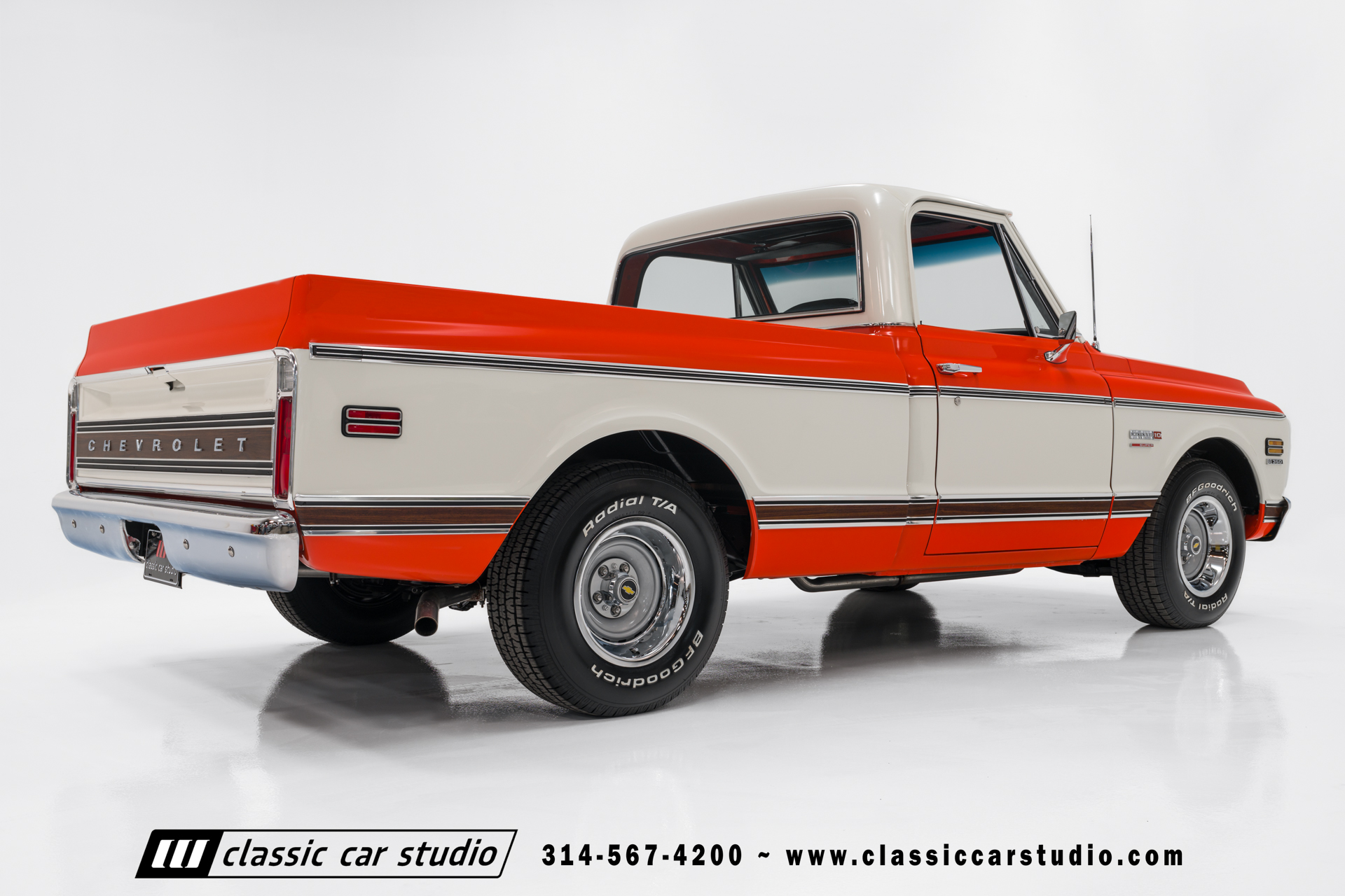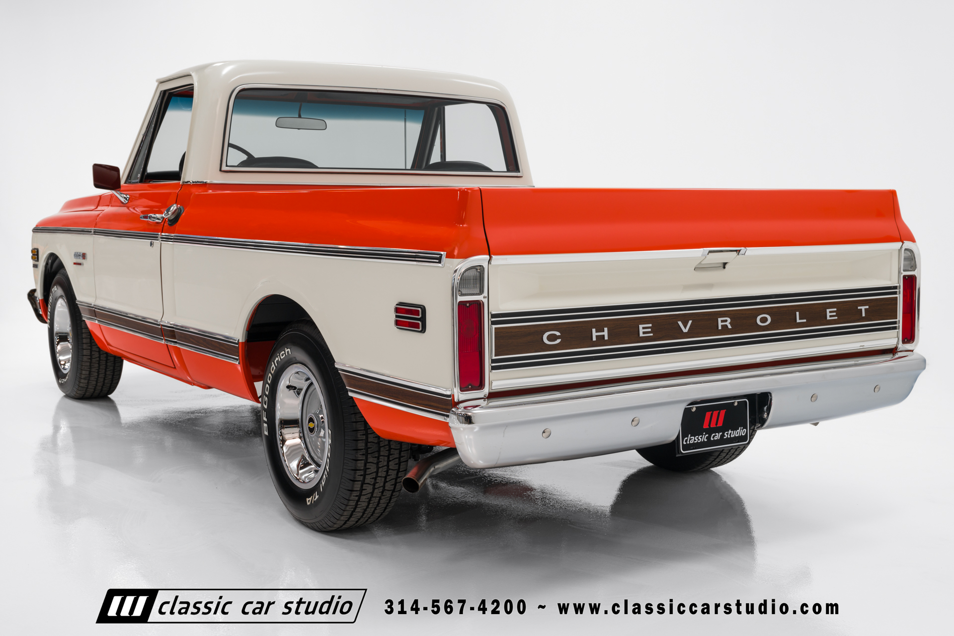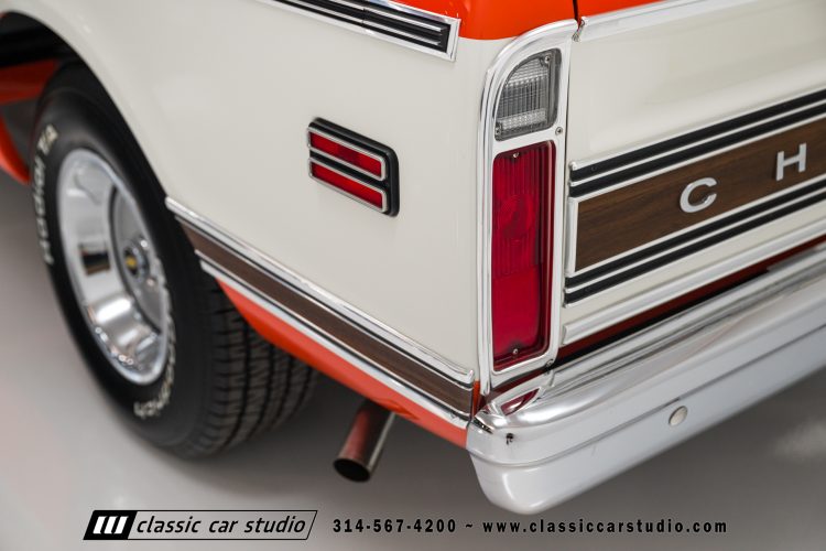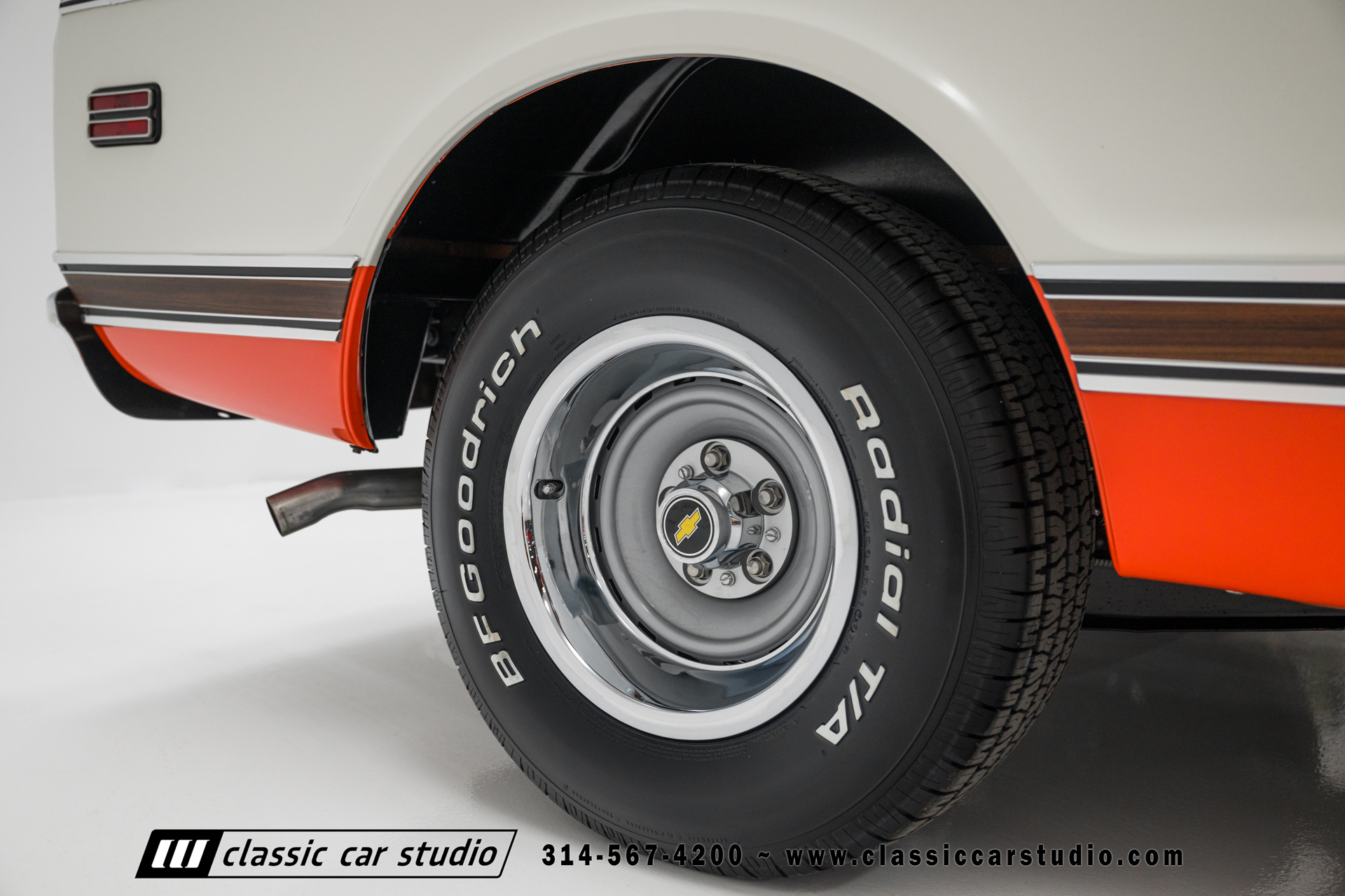 The body is finished in orange and white and was repainted during the aforementioned refurbishment. Exterior details include a wood-lined bed floor, polished bed runners, a fender-mounted antenna, Cheyenne Super badging, chrome bumpers, faux woodgrain trim accents, polished side mirrors, and dual exhaust outlets that exit behind the rear wheels.