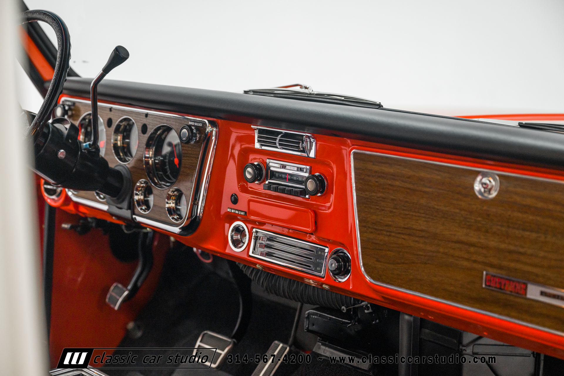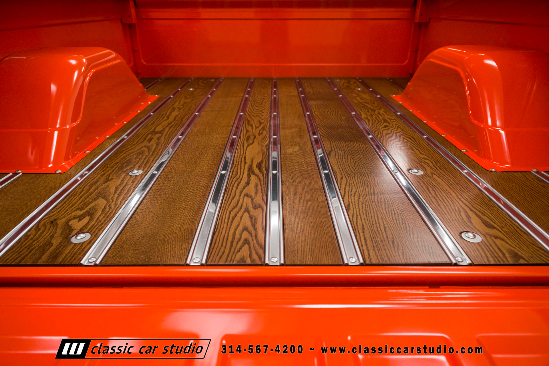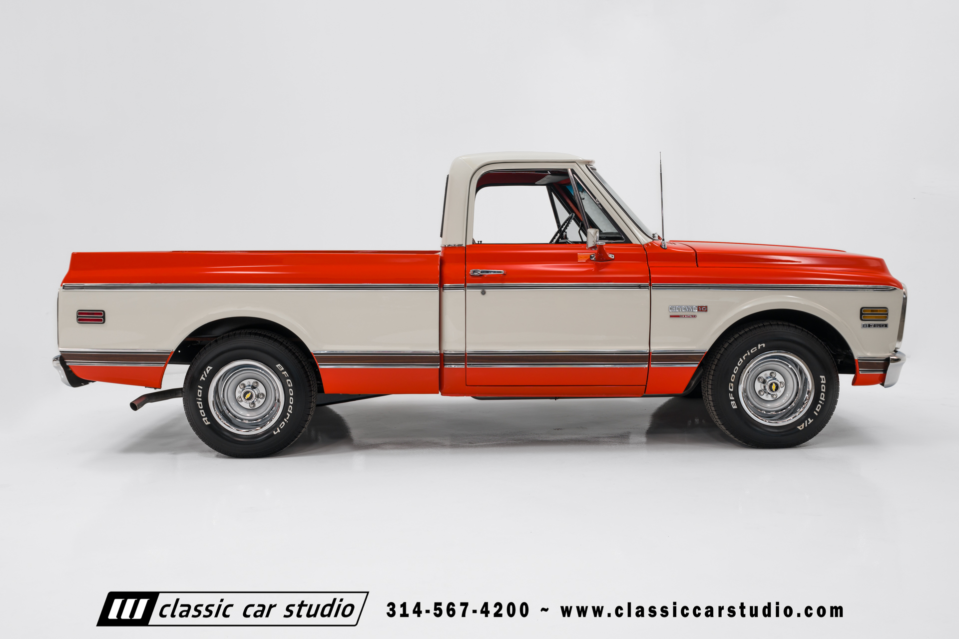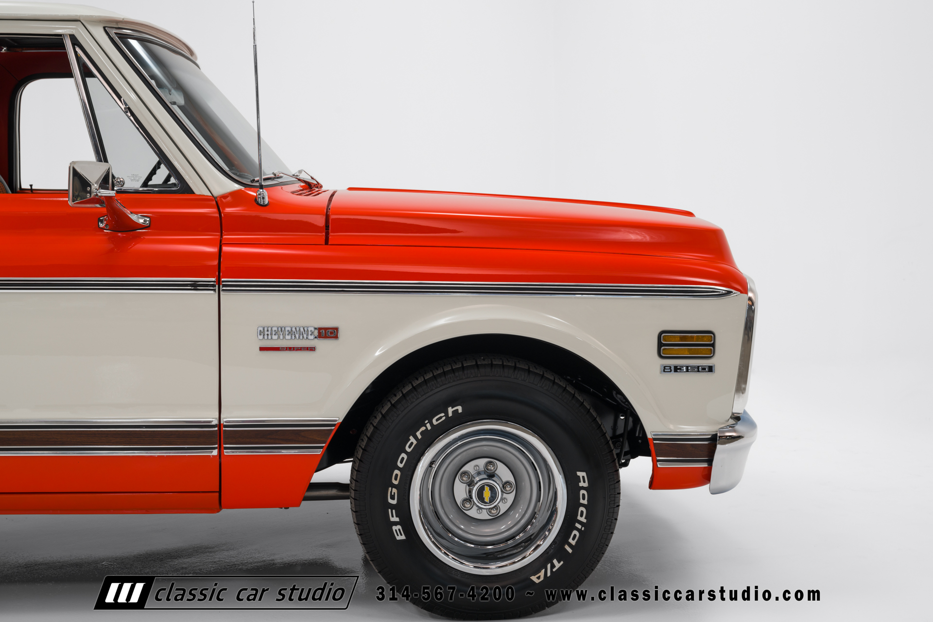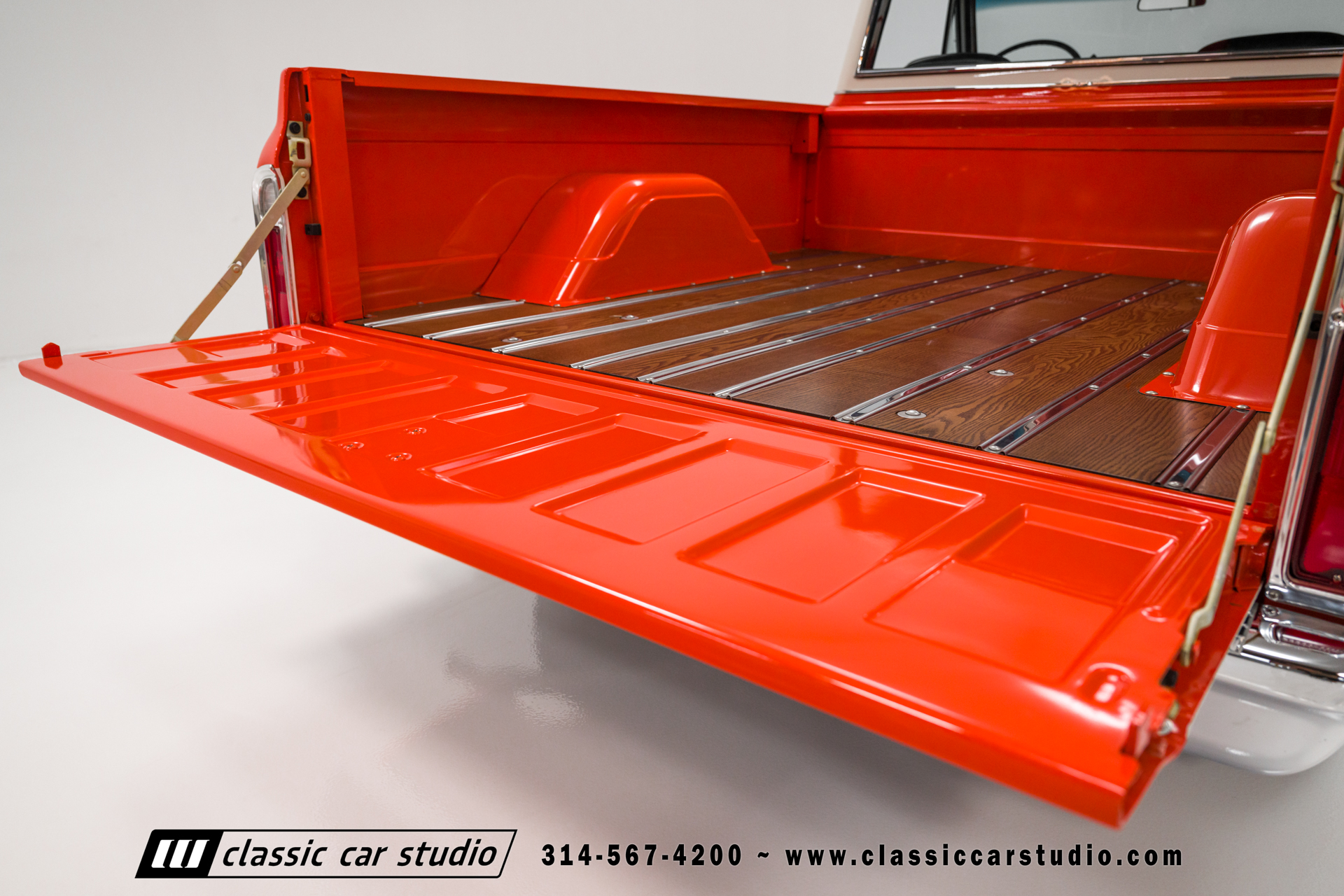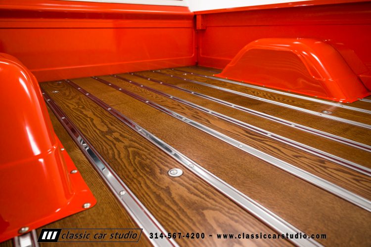 The body is finished in orange and white and was repainted during the aforementioned refurbishment. Exterior details include a wood-lined bed floor, polished bed runners, a fender-mounted antenna, Cheyenne Super badging, chrome bumpers, faux woodgrain trim accents, polished side mirrors, and dual exhaust outlets that exit behind the rear wheels.