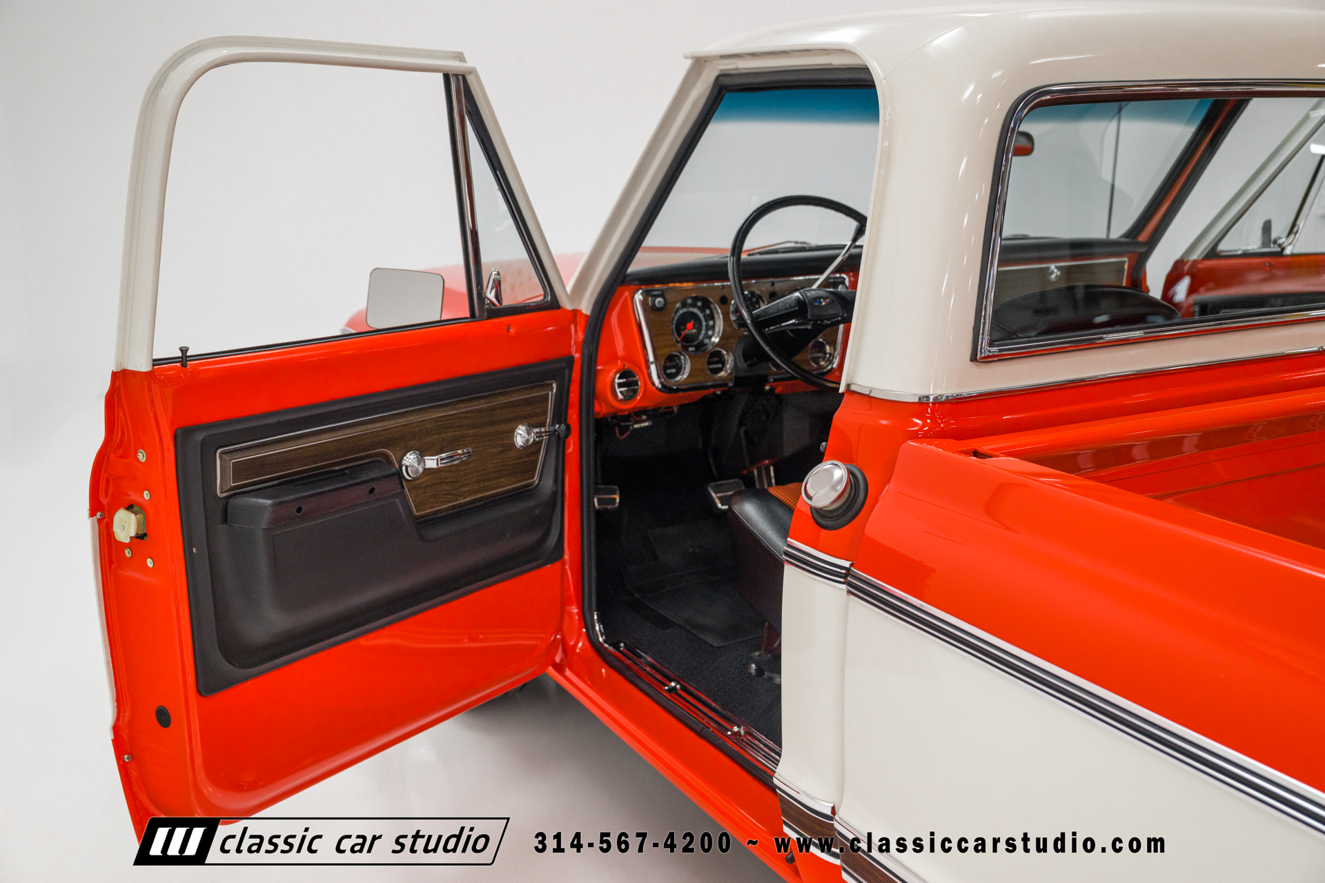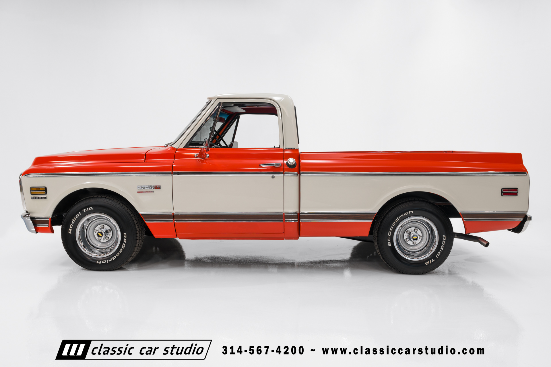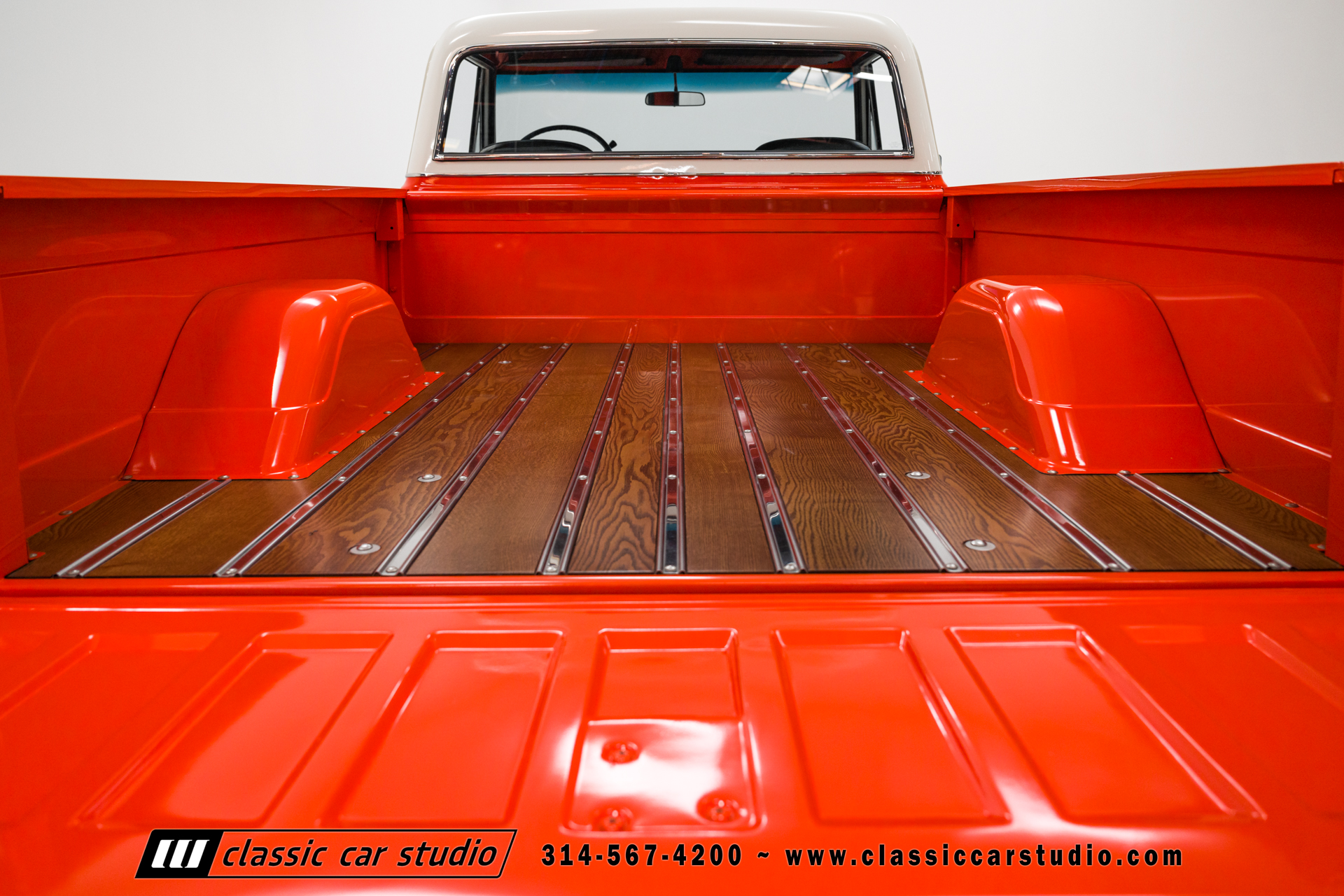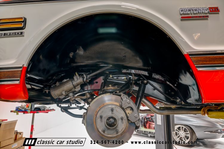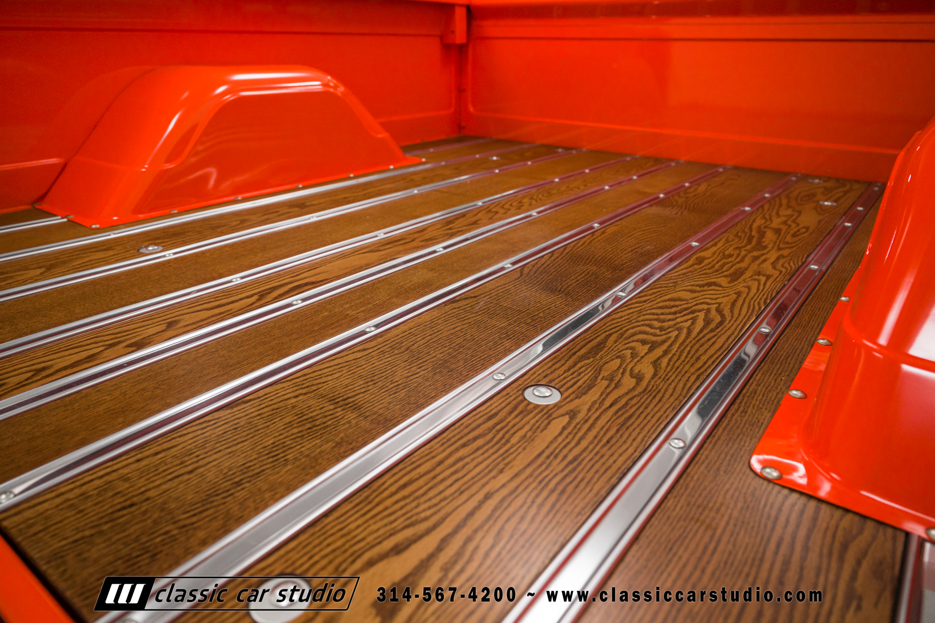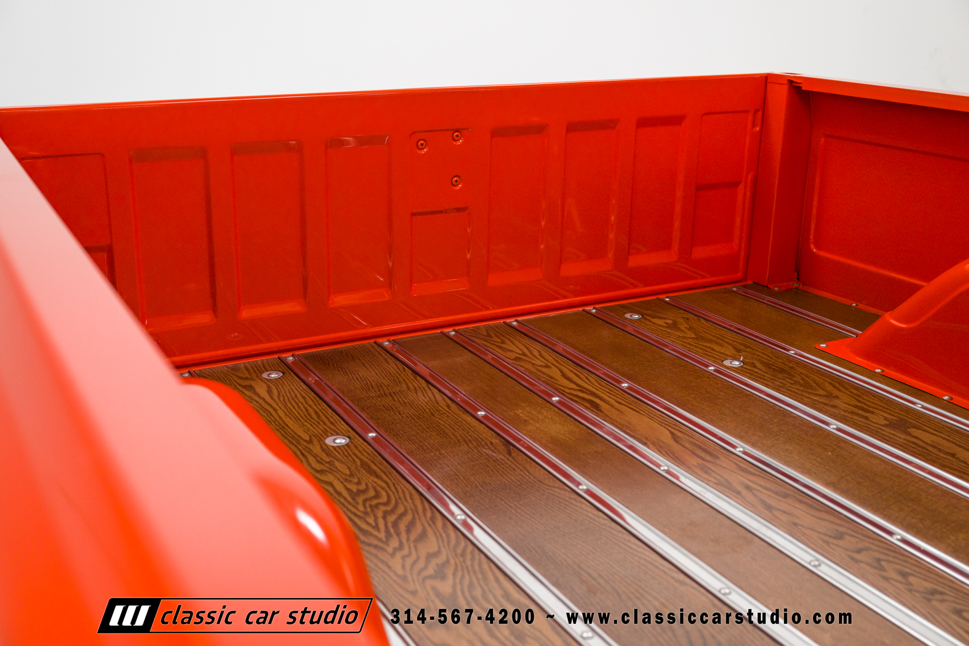 The body is finished in orange and white and was repainted during the aforementioned refurbishment. Exterior details include a wood-lined bed floor, polished bed runners, a fender-mounted antenna, Cheyenne Super badging, chrome bumpers, faux woodgrain trim accents, polished side mirrors, and dual exhaust outlets that exit behind the rear wheels.