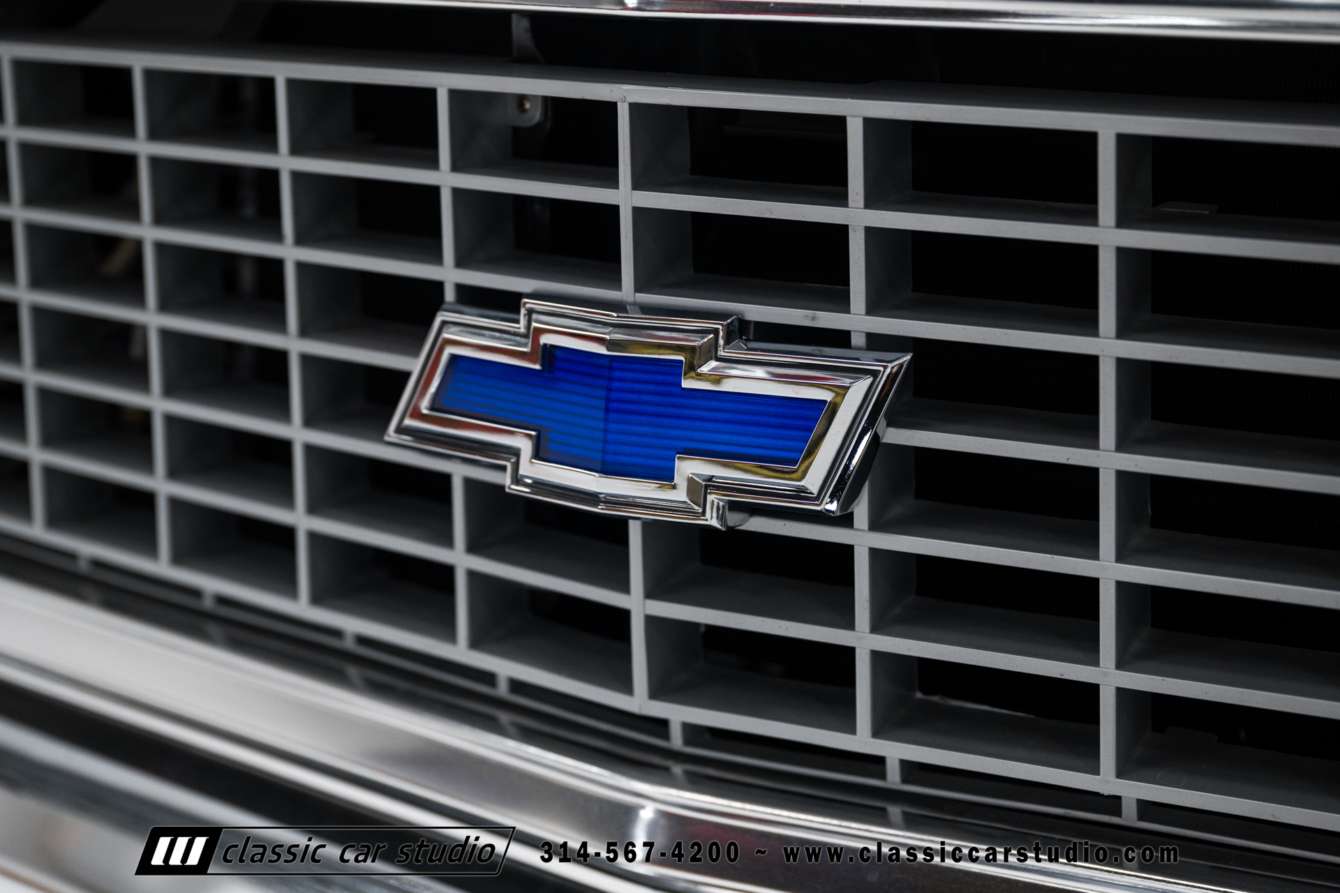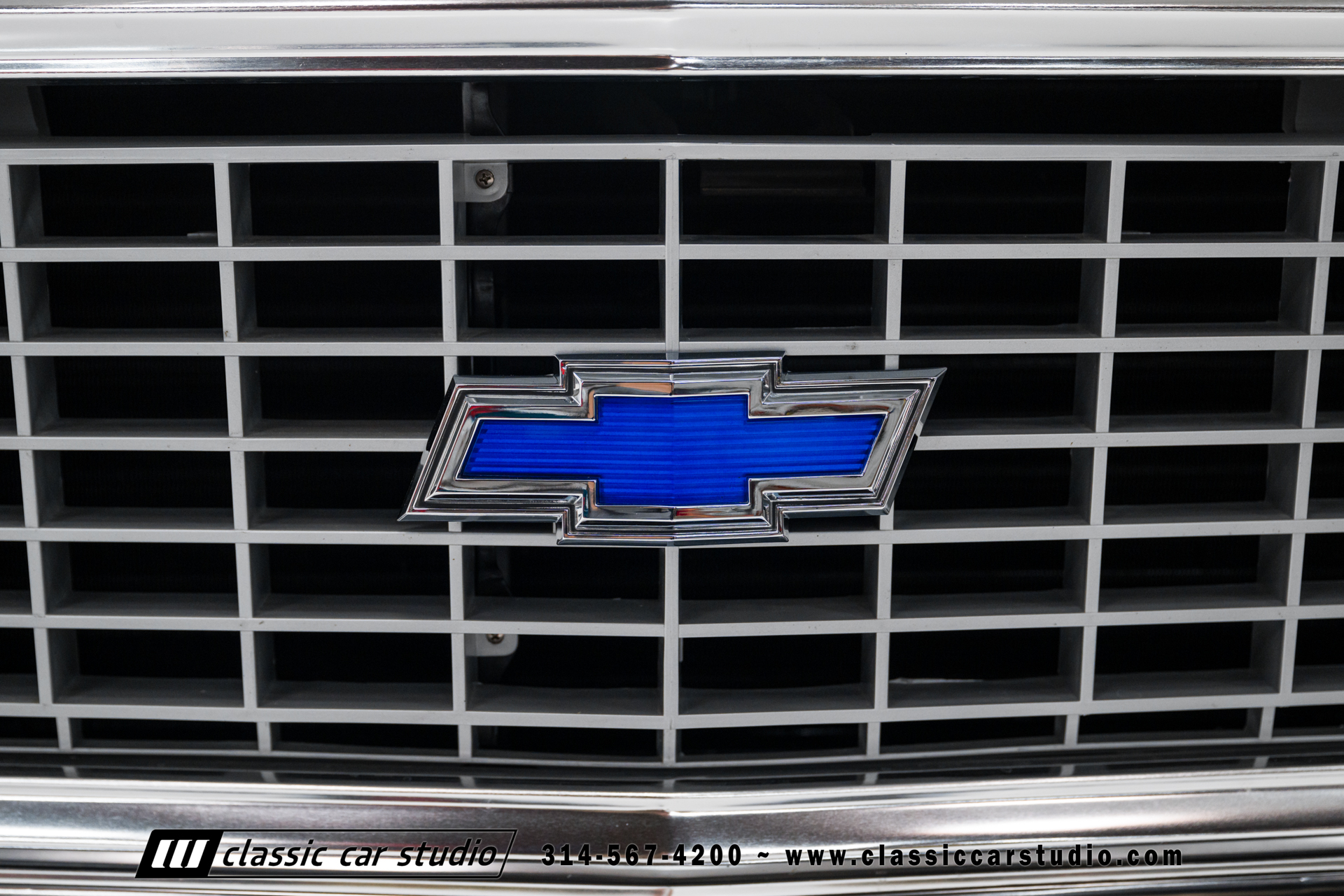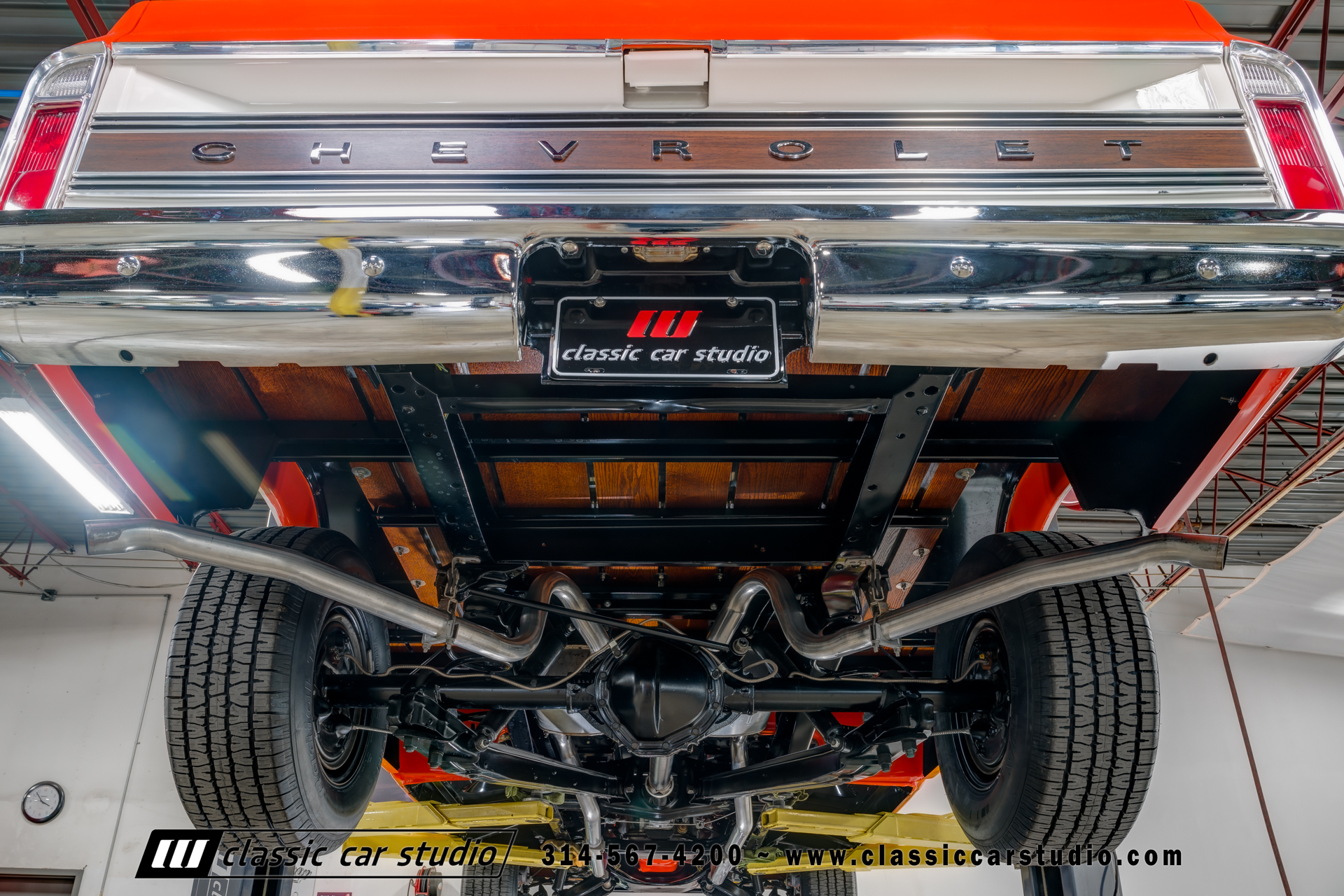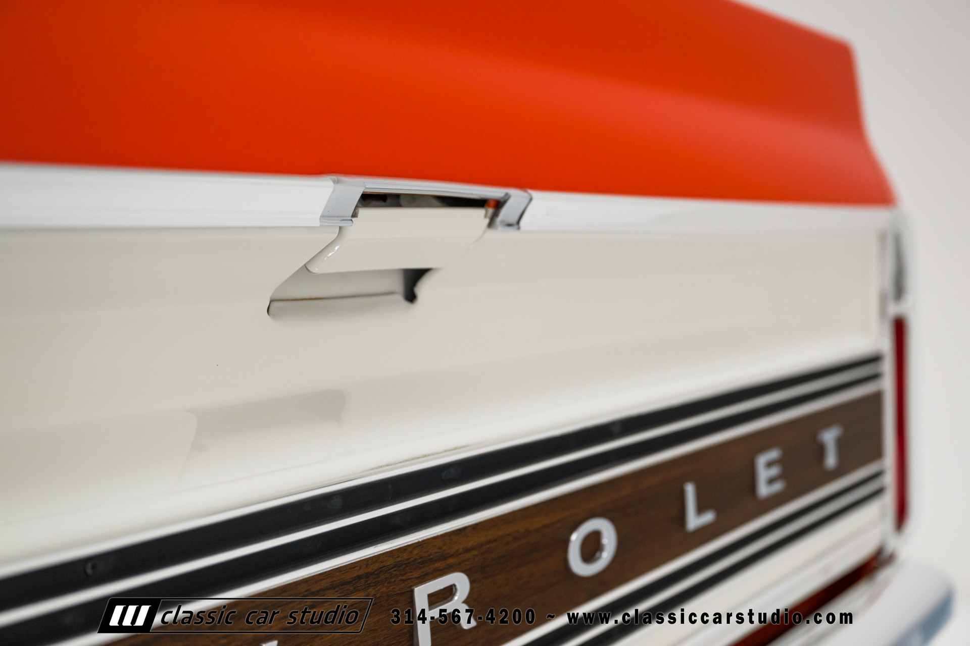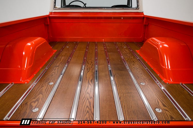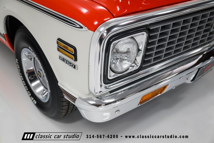 The body is finished in orange and white and was repainted during the aforementioned refurbishment. Exterior details include a wood-lined bed floor, polished bed runners, a fender-mounted antenna, Cheyenne Super badging, chrome bumpers, faux woodgrain trim accents, polished side mirrors, and dual exhaust outlets that exit behind the rear wheels.
