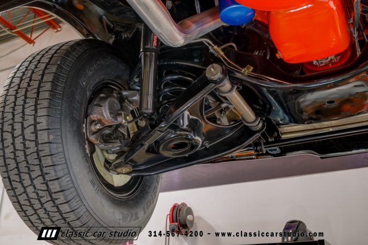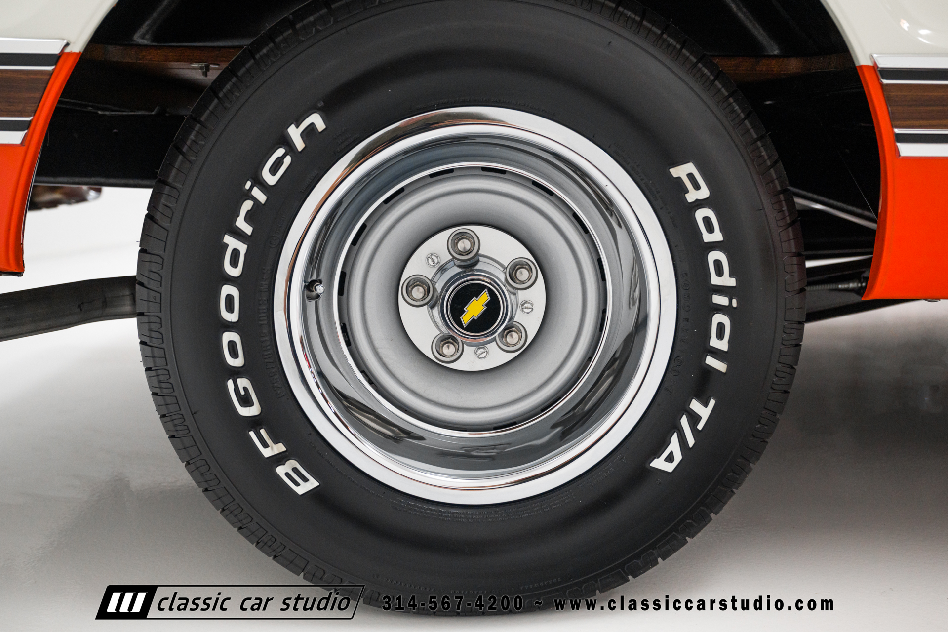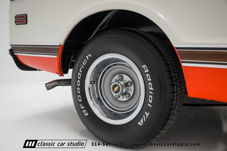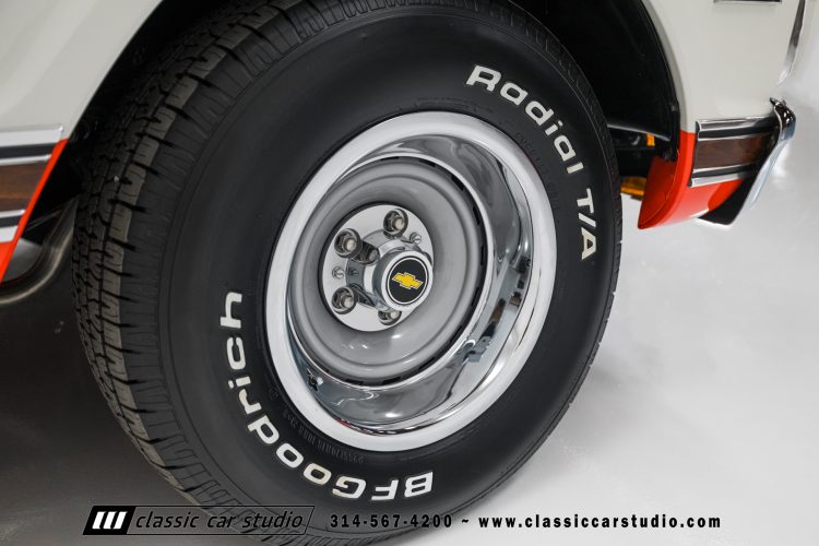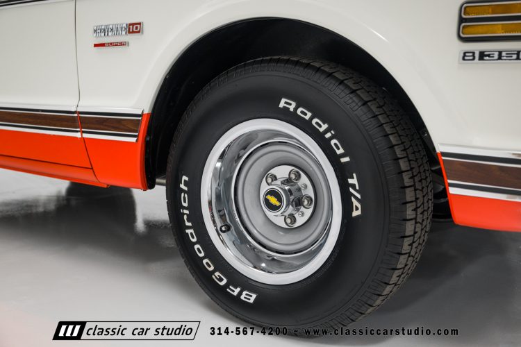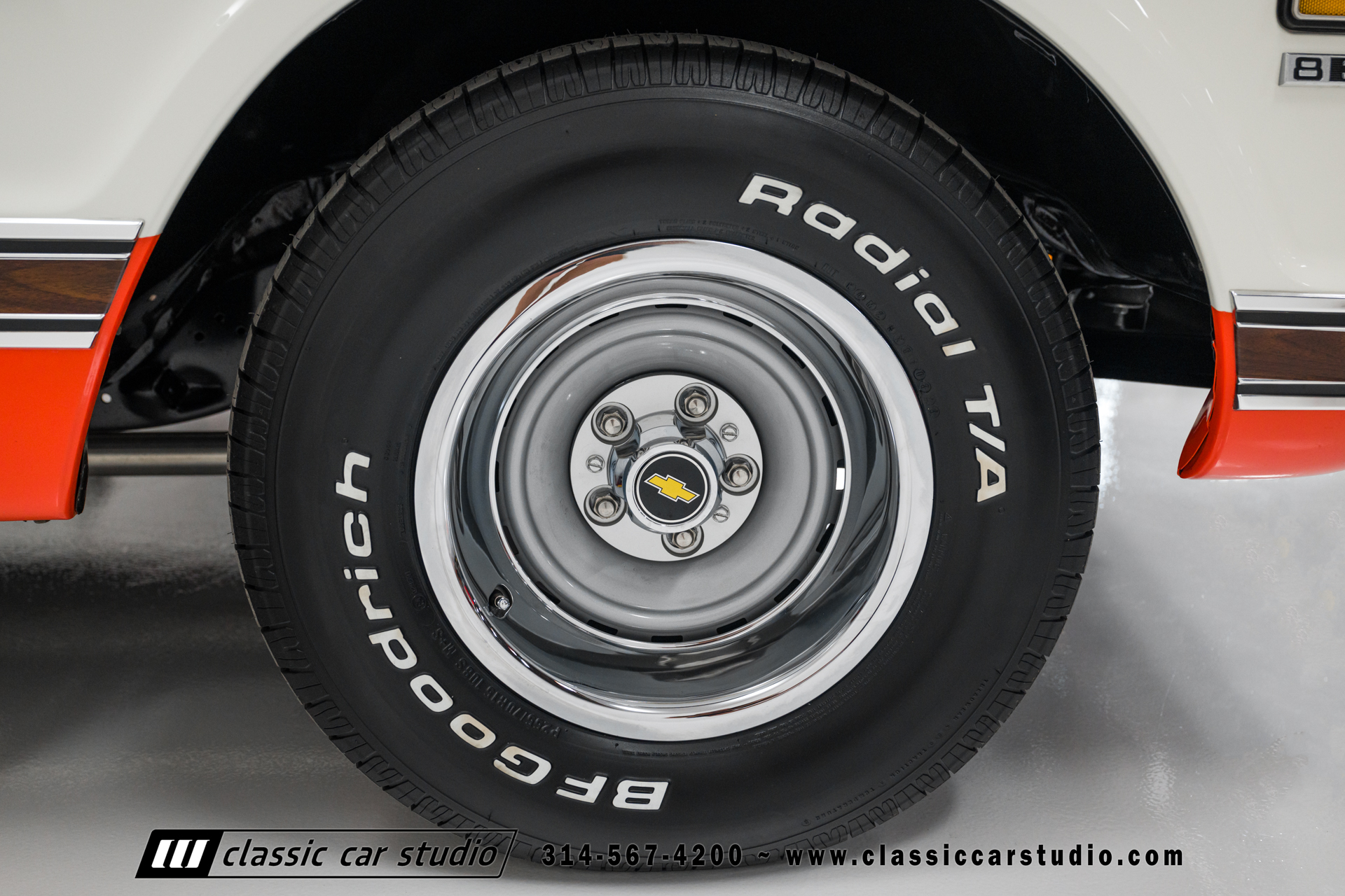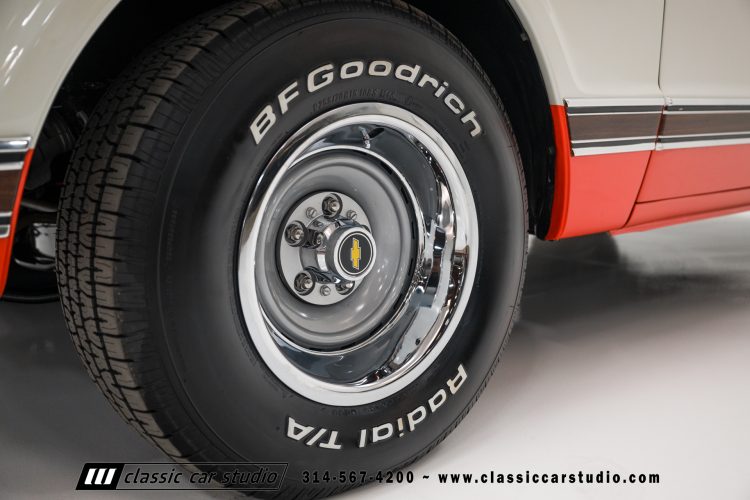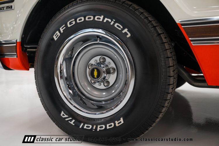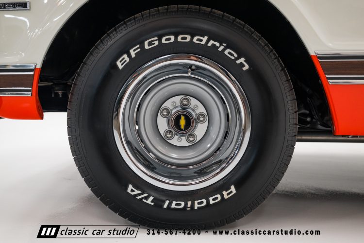 Rally-style 15″ wheels wear chrome trim rings and center caps and are mounted with 255/70 BFGoodrich Radial T/A white-letter tires. The truck is equipped with power steering, and braking is handled by power-assisted front discs and rear drums.