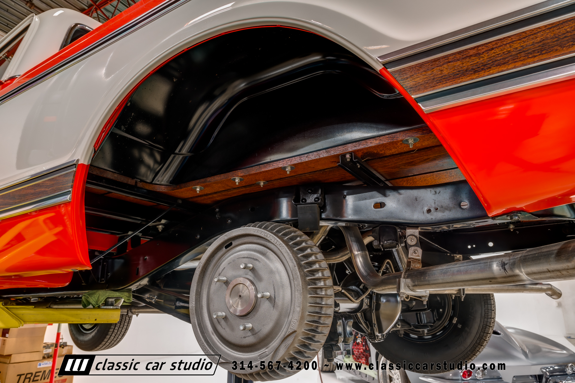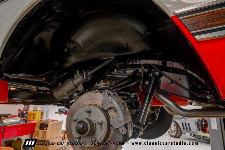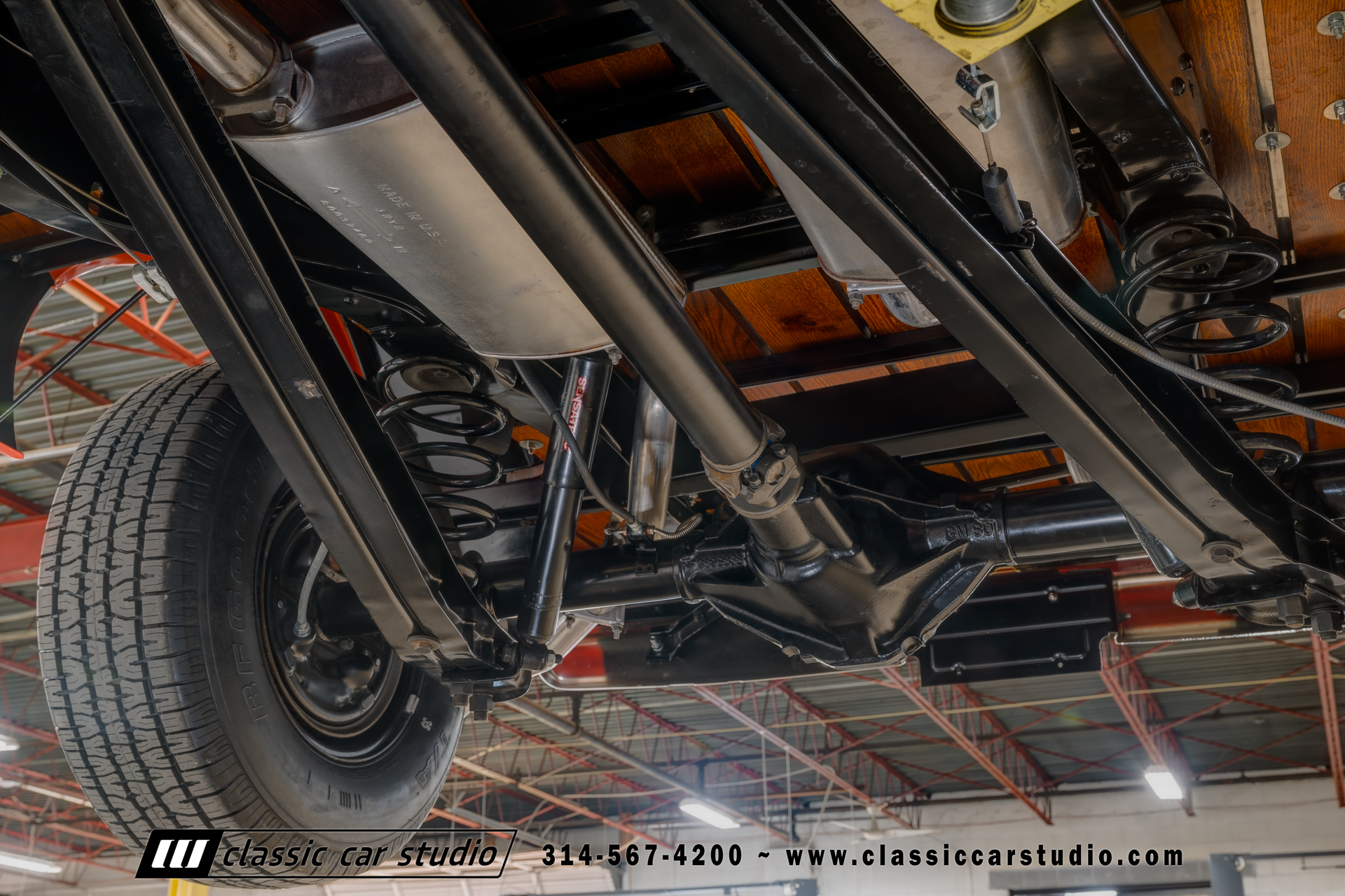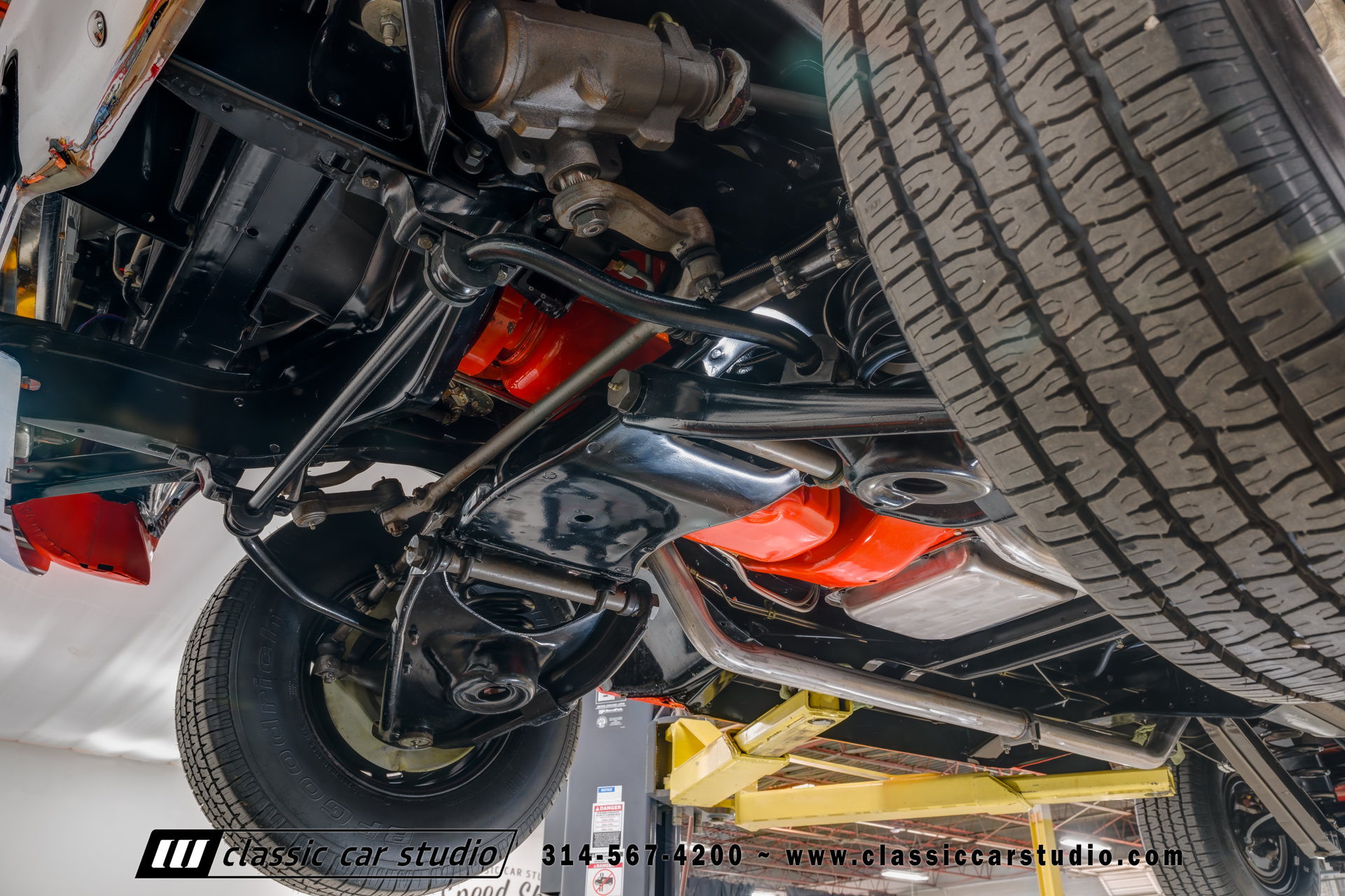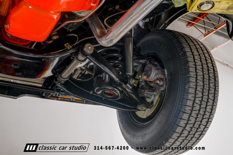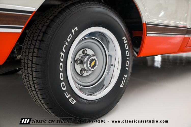 Rally-style 15″ wheels wear chrome trim rings and center caps and are mounted with 255/70 BFGoodrich Radial T/A white-letter tires. The truck is equipped with power steering, and braking is handled by power-assisted front discs and rear drums.