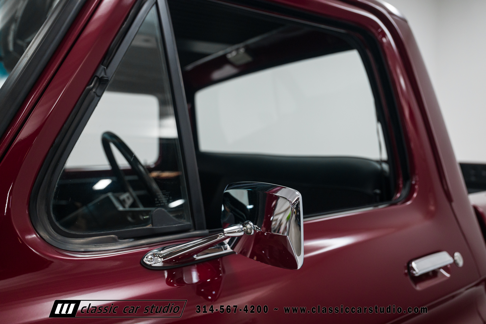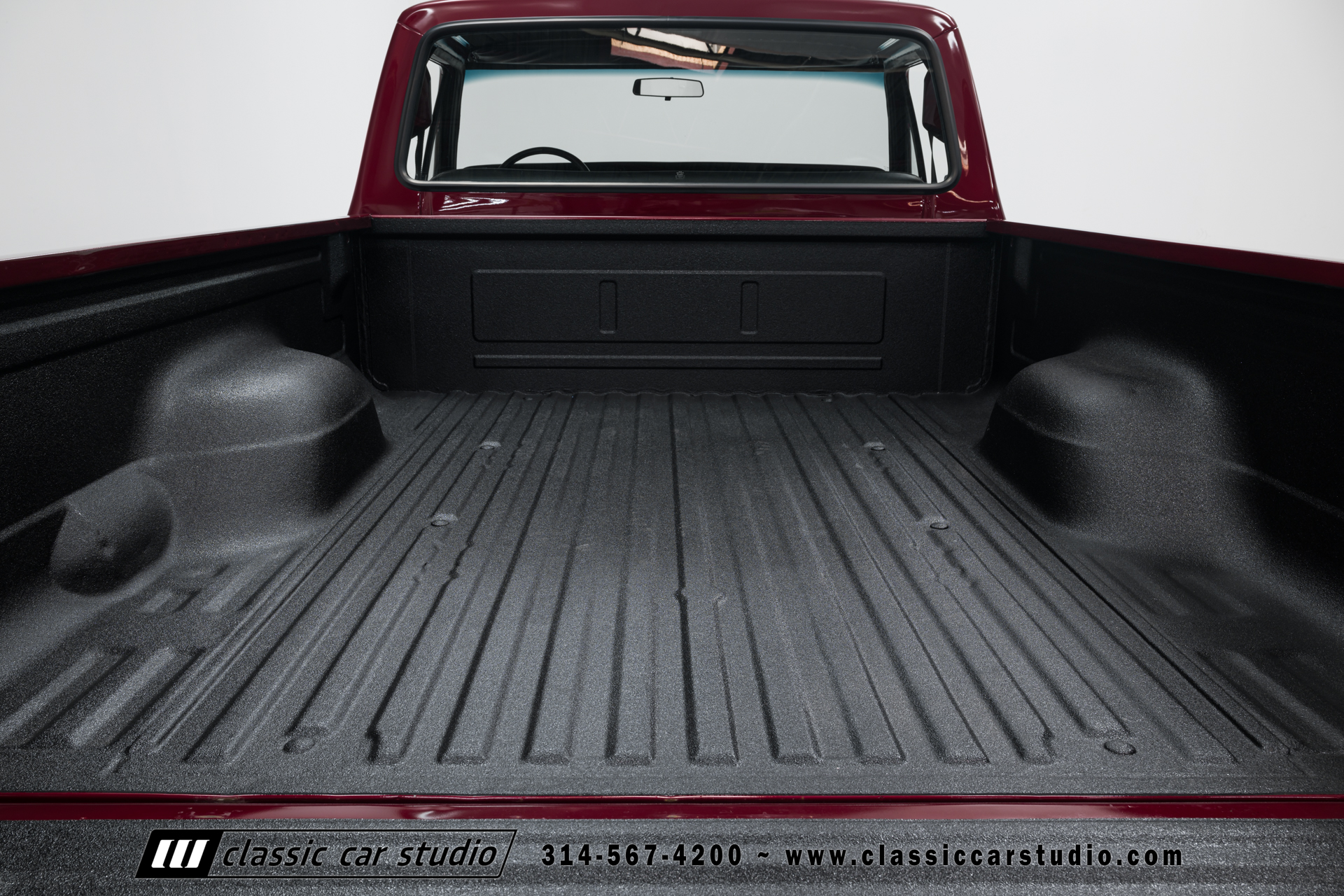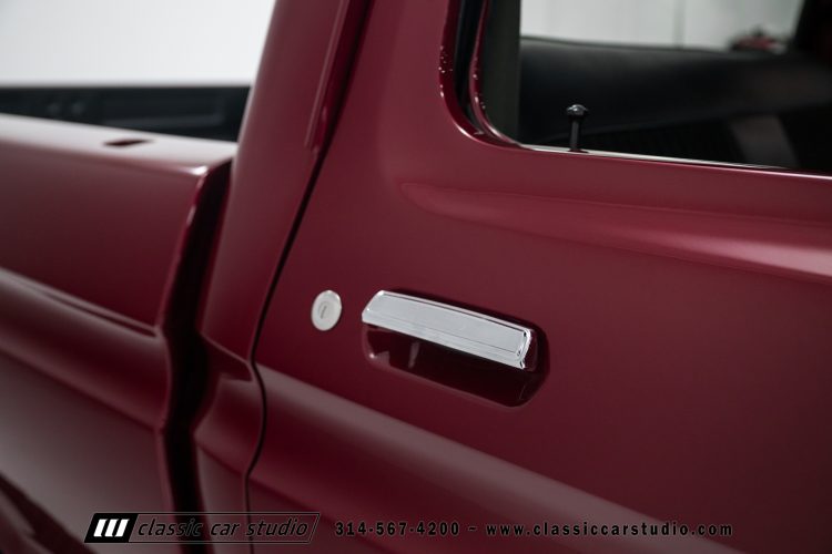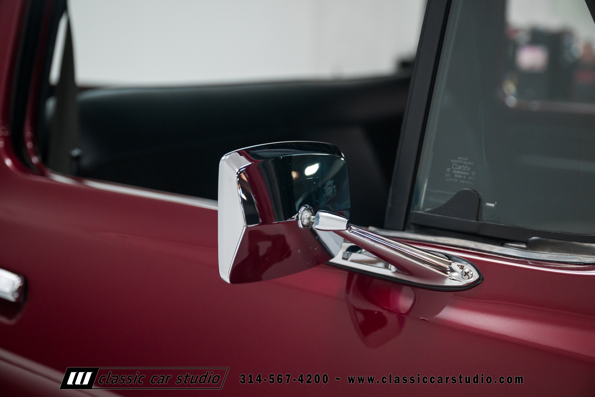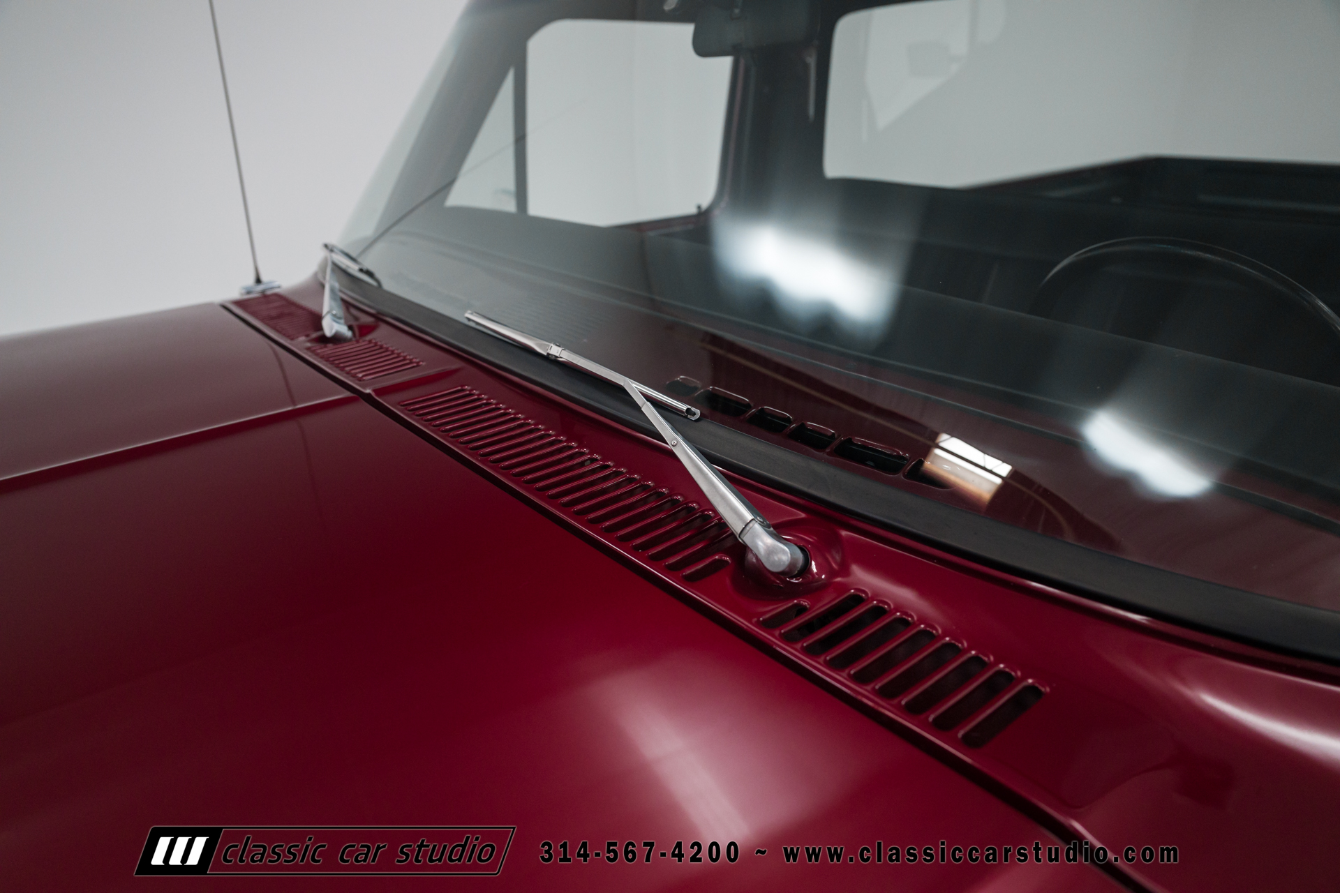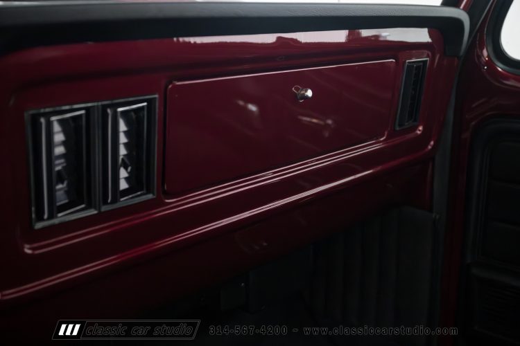The interior has the same gorgeous paint as the exterior and comes complete with new carpeting, new door panels, a recovered bench seat and rebuilt gauges. The truck uses a modern AC system which also replaces the heater box with all new components. The stereo is now a digital unit that fits in the original location.